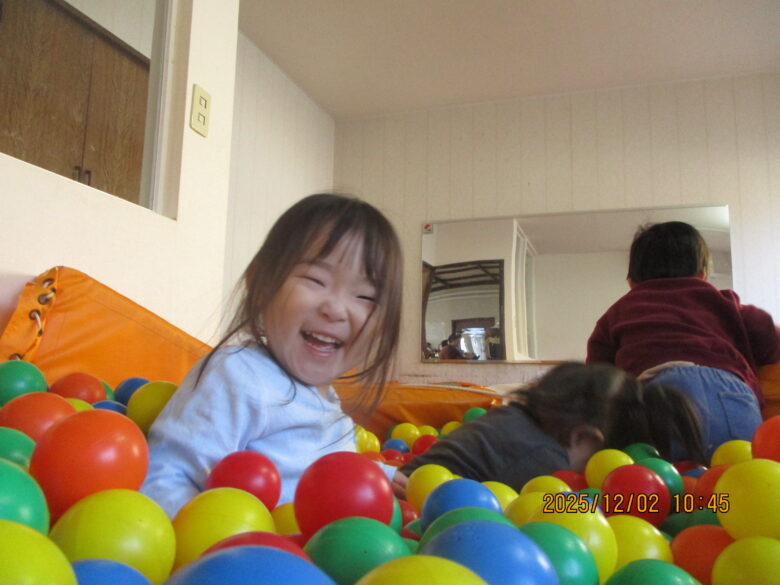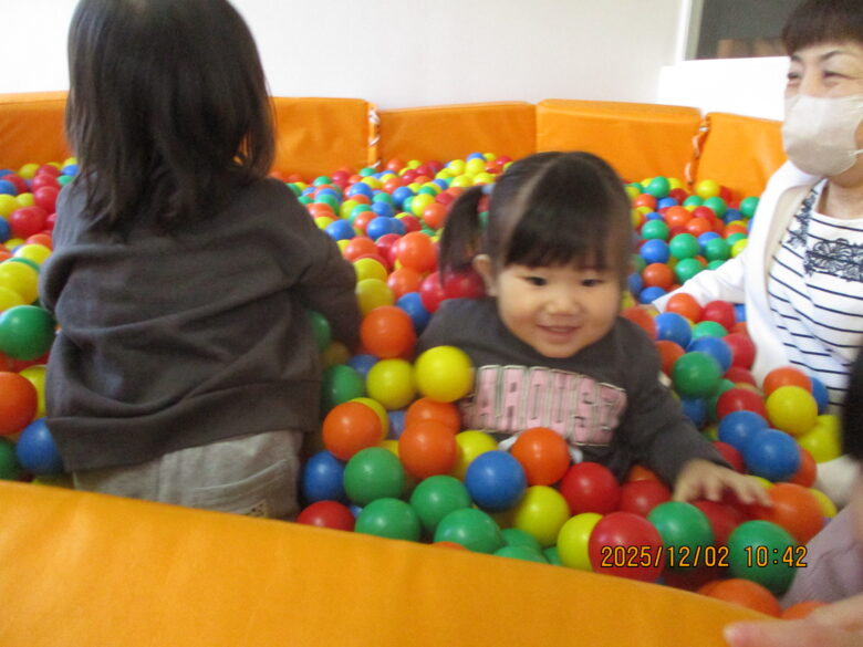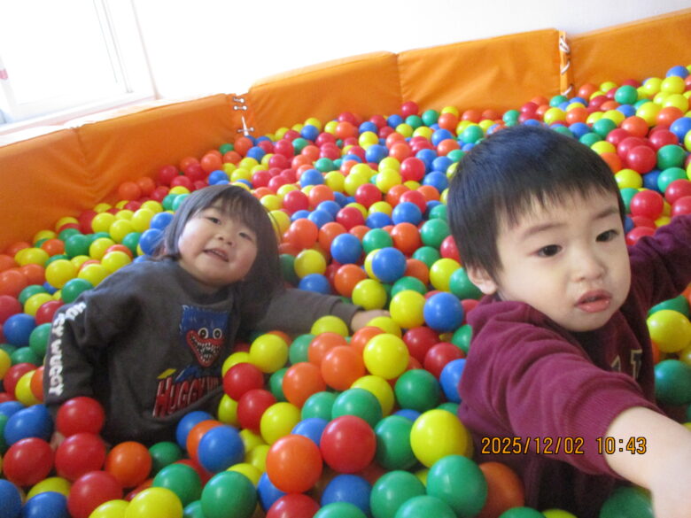 ボールプールに潜ったり泳いだり身体いっぱい使って遊んでました。