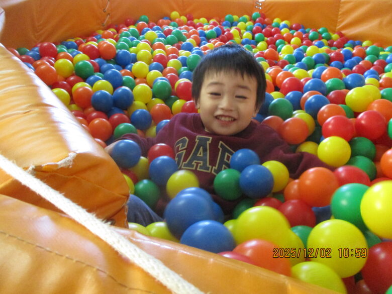 ボールプールに潜ったり泳いだり身体いっぱい使って遊んでました。