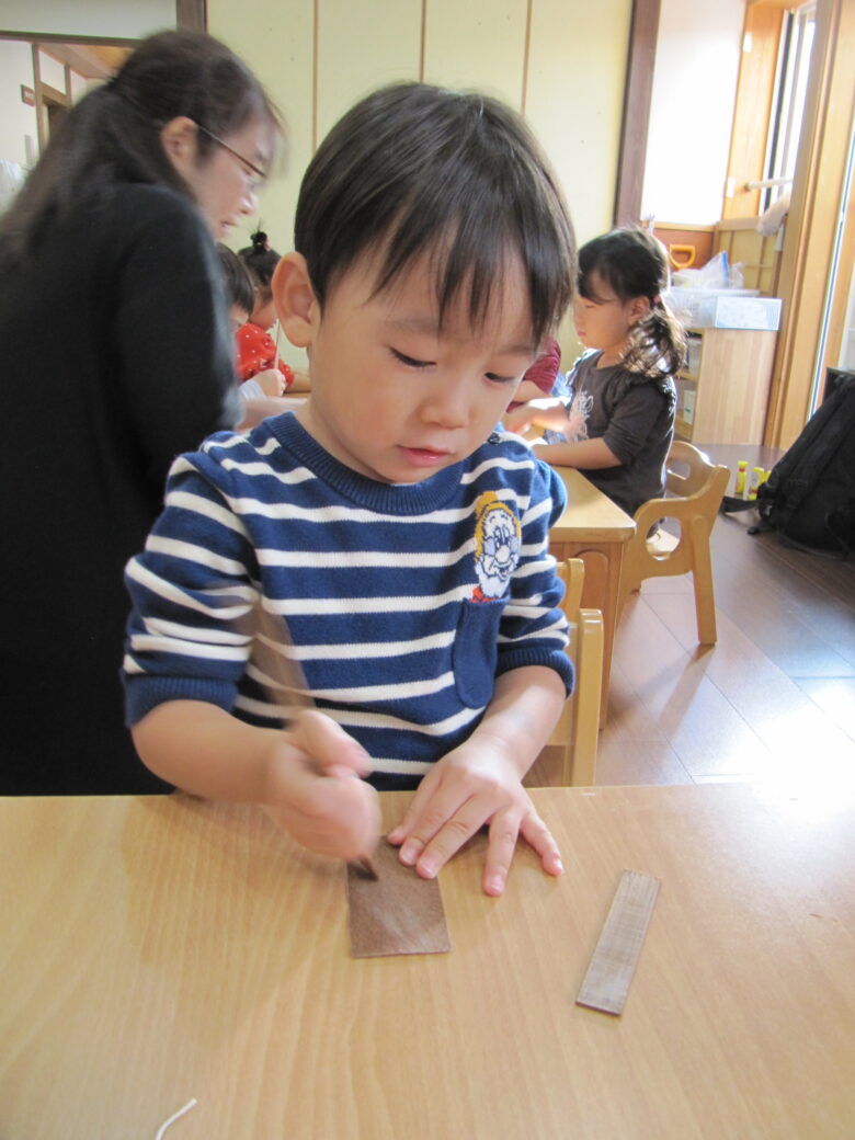 「こうやるんでしょ」と自らしゅっしゅっとやすりにこする子や慎重に慎重にやる子など、個性的な子ども達でしたよ。
