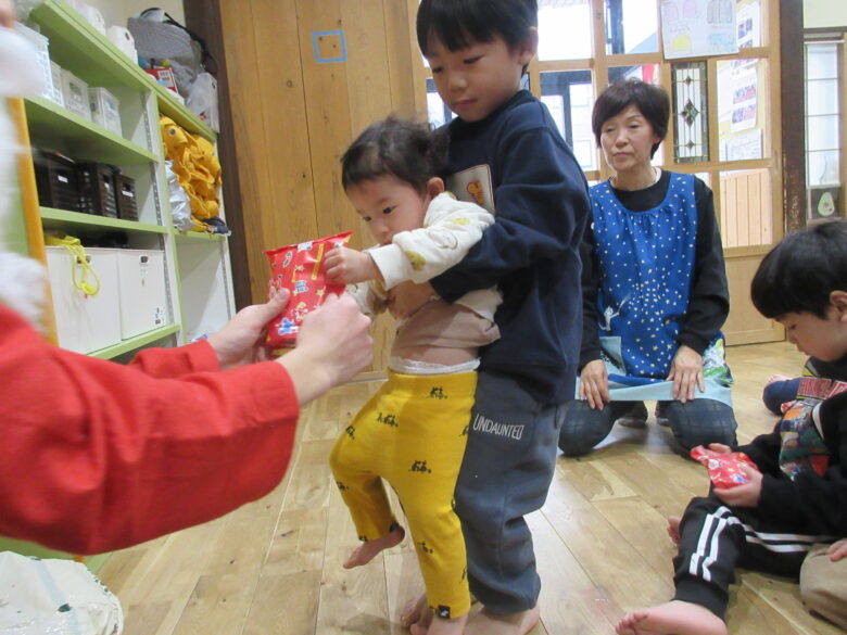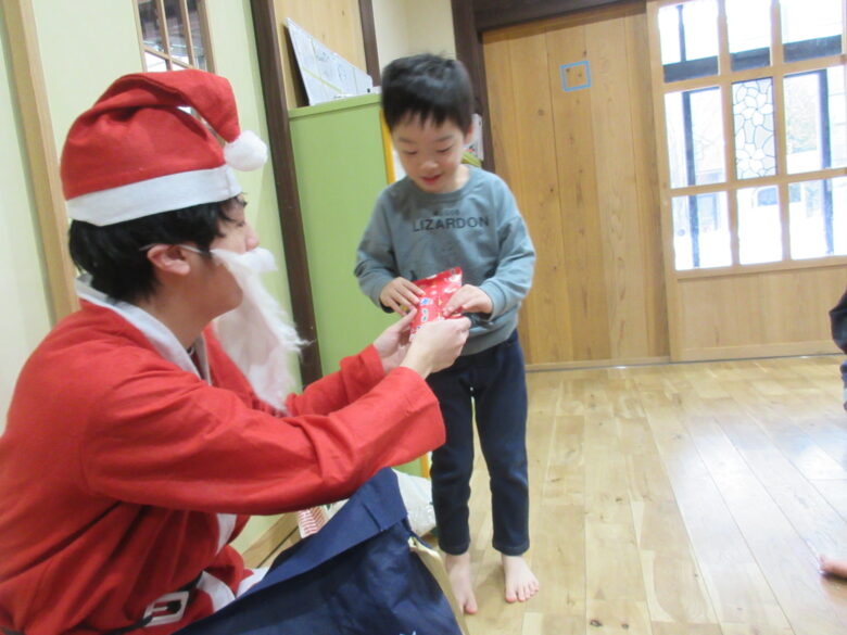 親しみのあるサンタの声に、ちょっぴり照れながらもプレゼントを受け取っていましたよ。