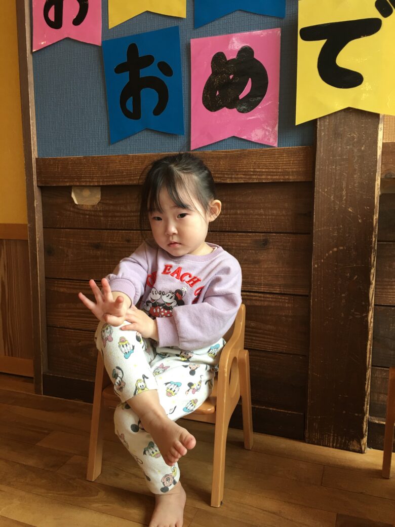 何歳になりましたか?と聞くと3歳と言いながらも、3の指は難しかったみたいで4の指を見せてくれました(笑)