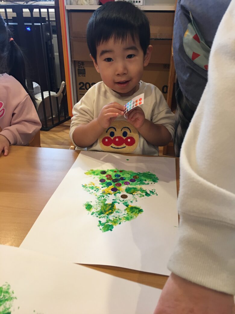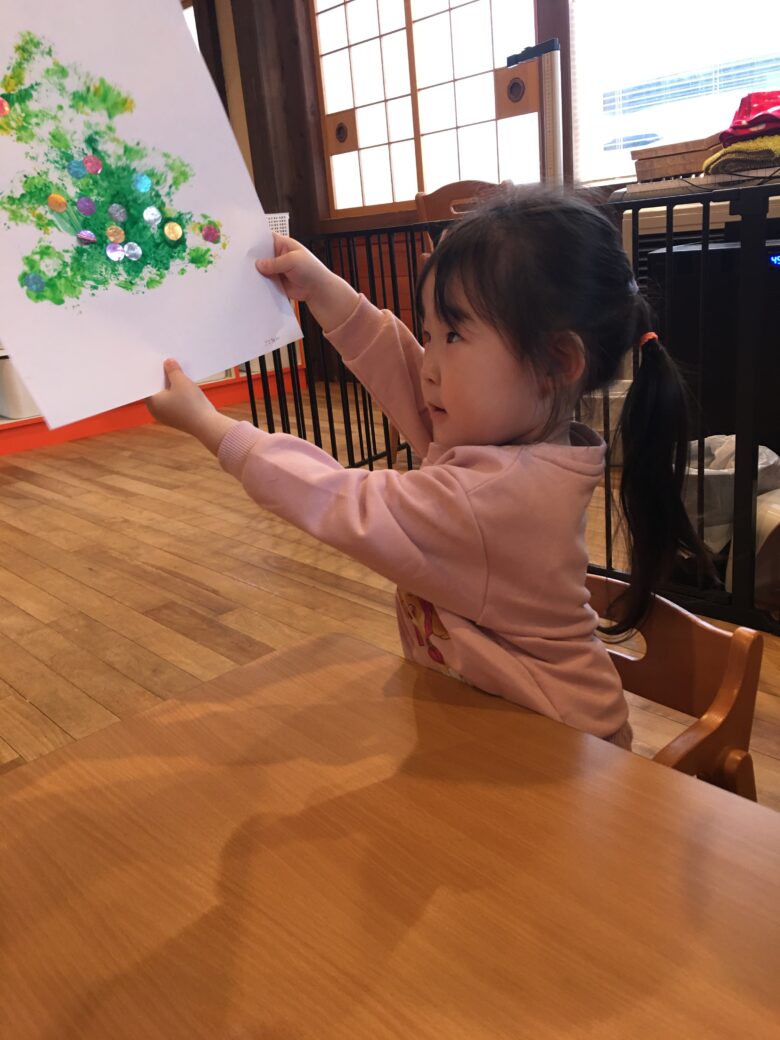 前日に、スタンプ遊びで画用紙にクリスマスツリーを描きました。 そして、今日はそこにキラキラしたシールを貼りました。