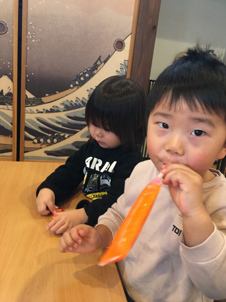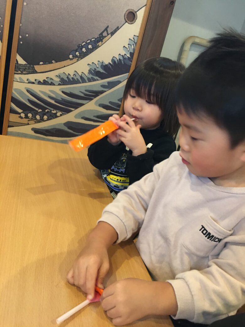 製作が終わった後は、みんなで『吹き流し』を作りました。 折り紙に、子ども達の思い思いの絵を描きました。 その後は、保育士の手を借りて完成させました。 完成すると喜んで吹いて、小さなお友だちにも見せていましたよ。 子どもの中には、お家でお父さんに吹いて見せた子もいたようです。