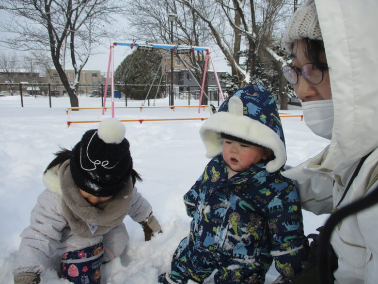 「それ~!」と小さいお友だちに雪を渡してくれるくるみ組さん💗