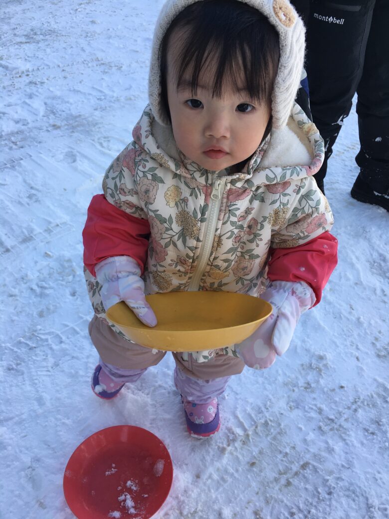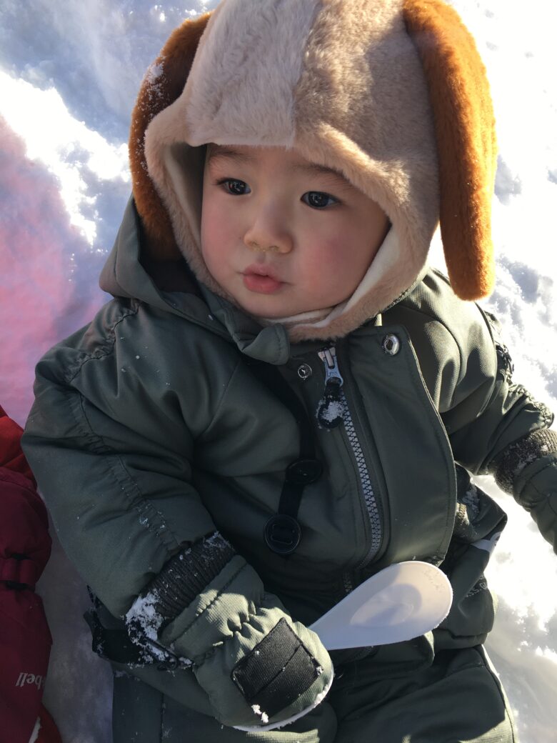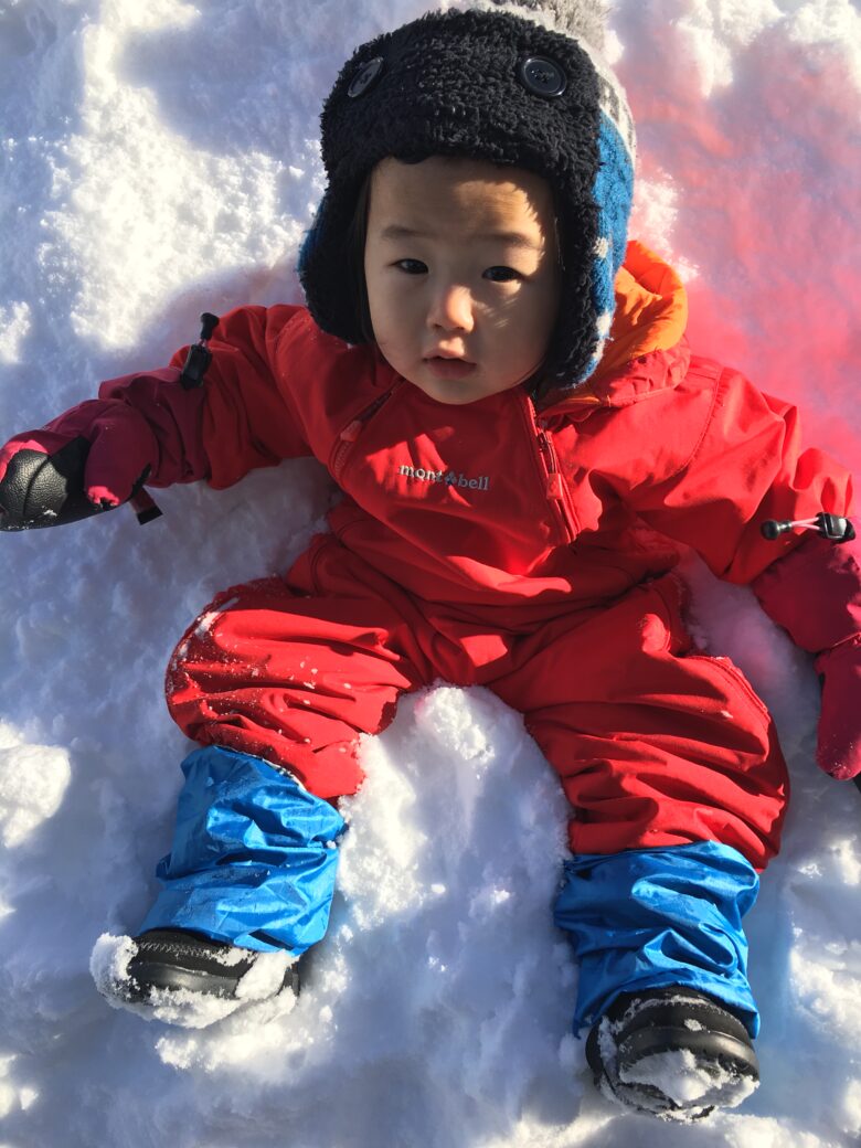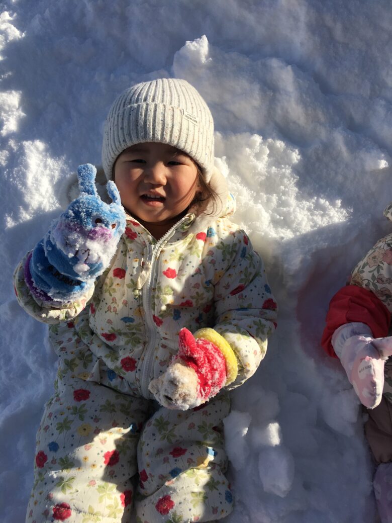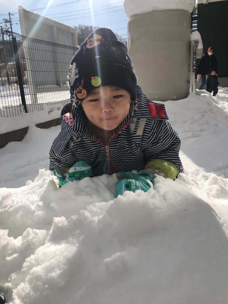雪山に座って気持ち良さそう。そのままお尻滑りを楽しんでいました。