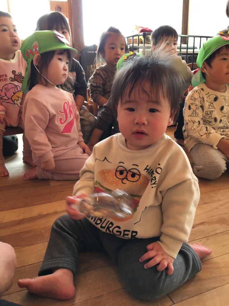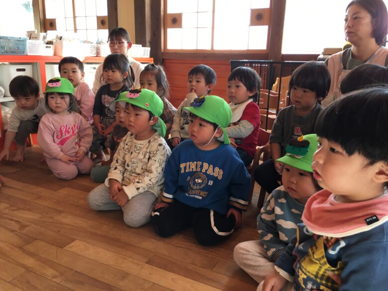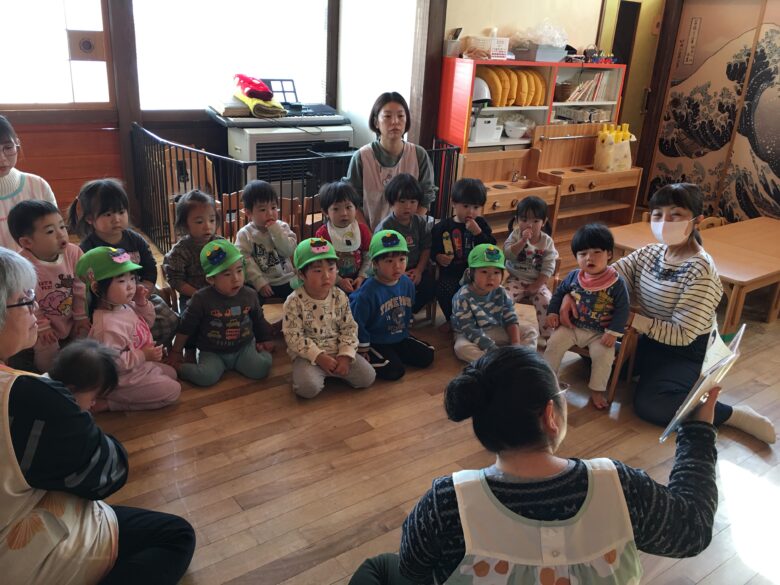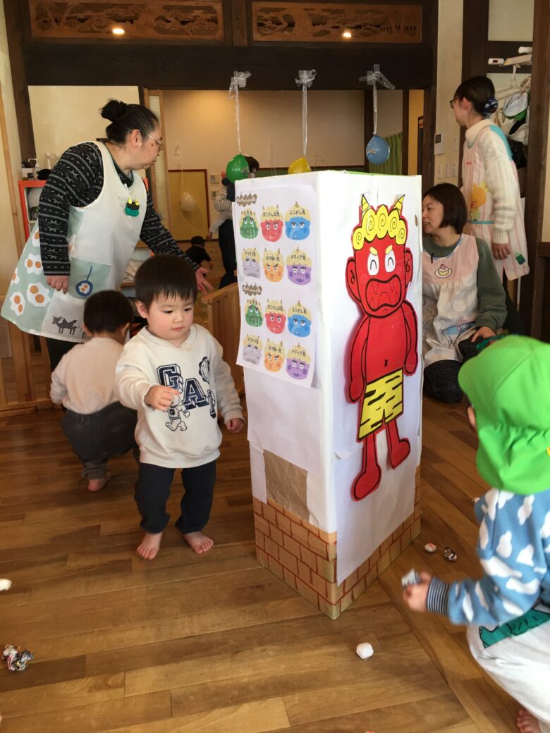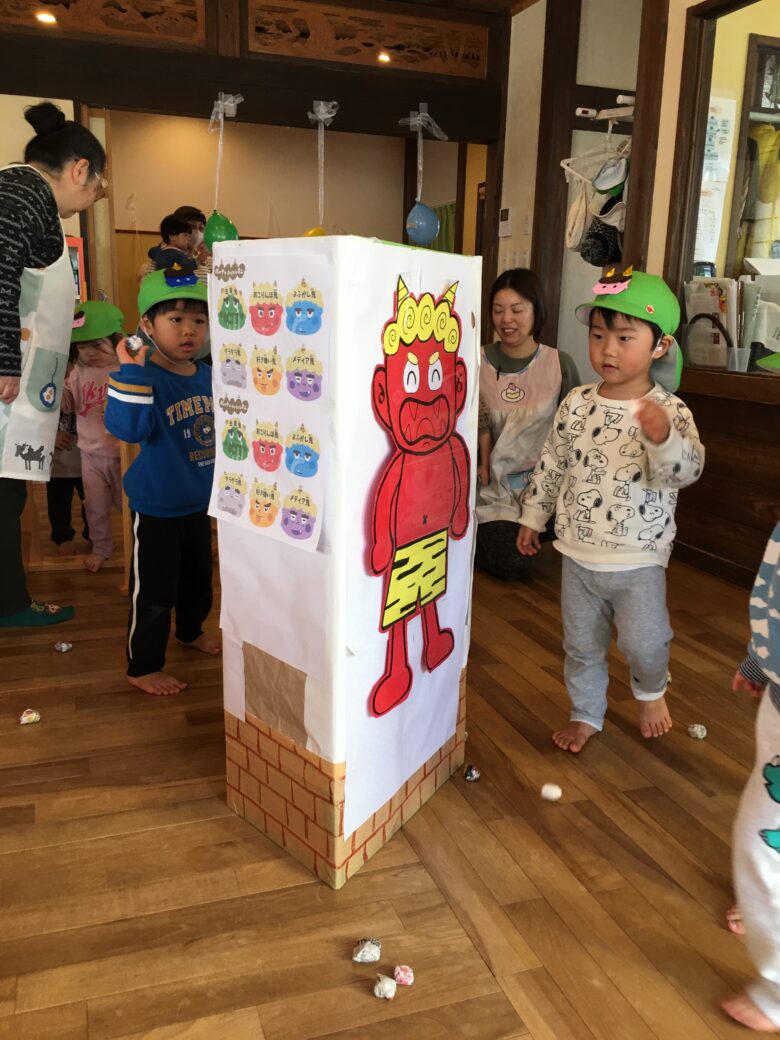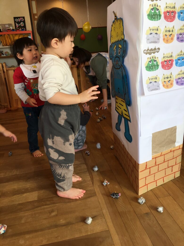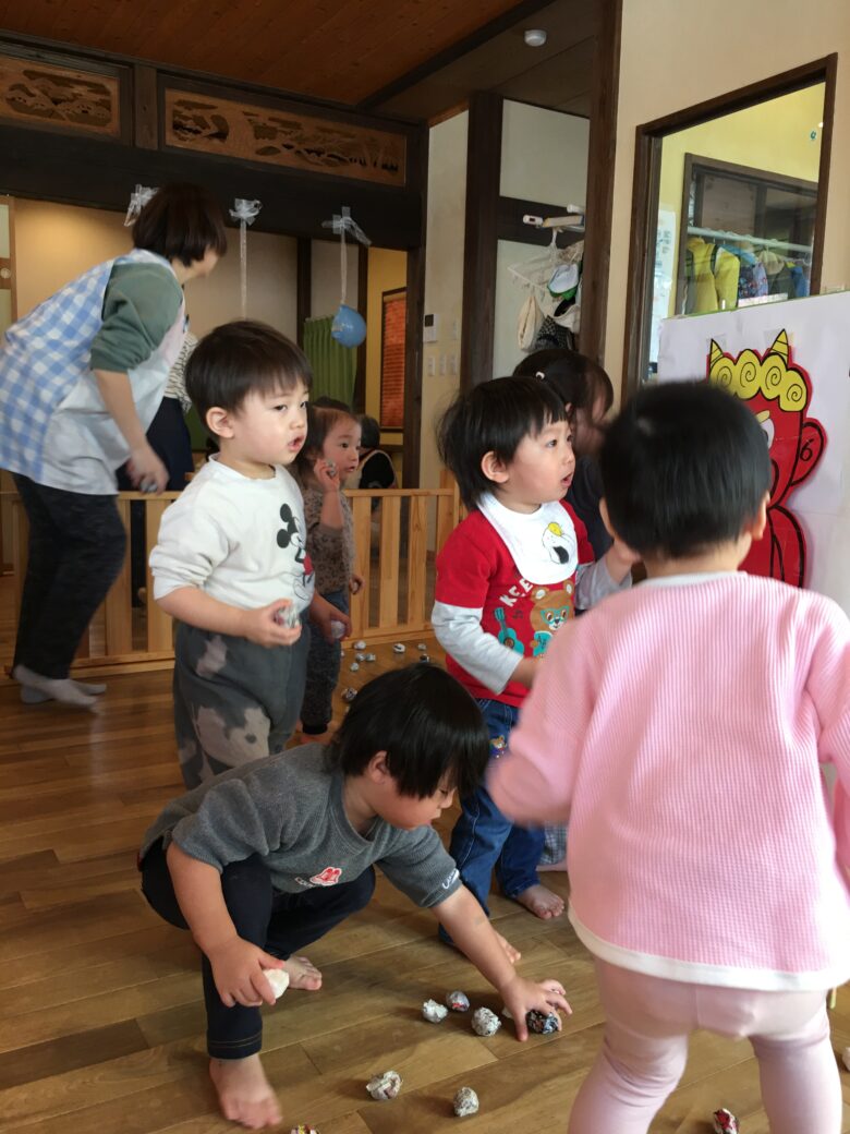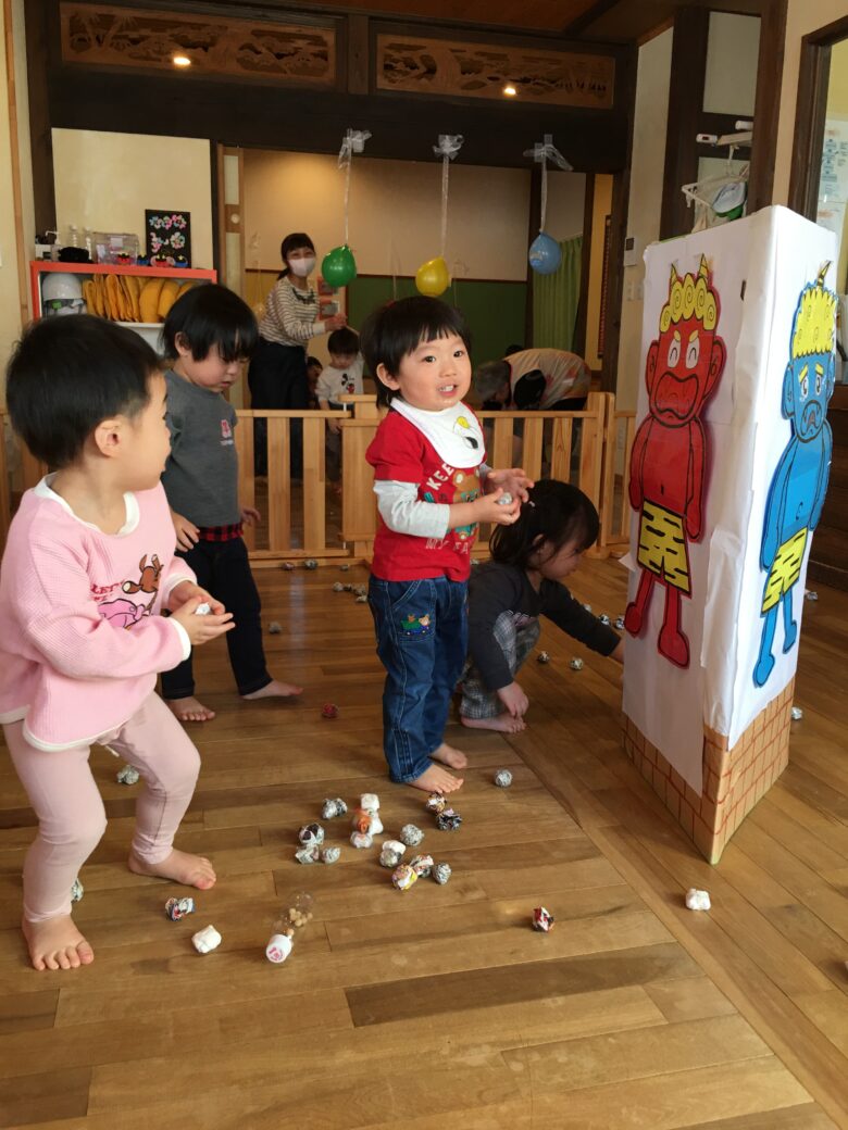 節分の絵本をみて、節分の由来の話を聞いてからまめまきをしました。