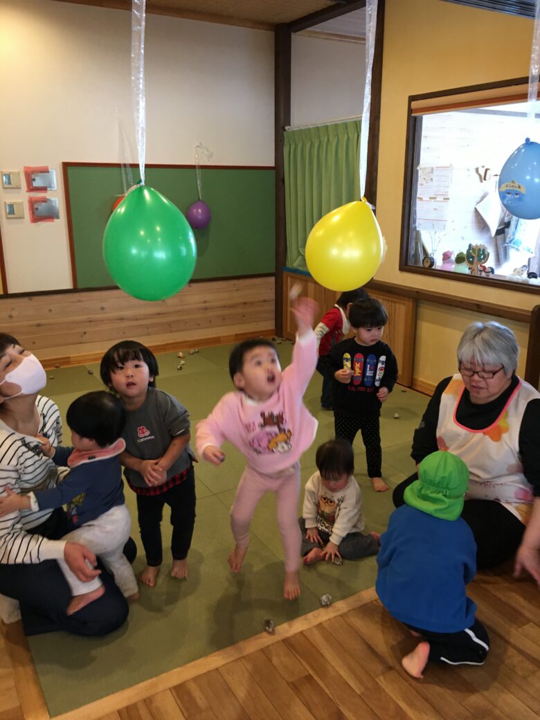 心の中の鬼、おこりんぼ鬼、よふかし鬼、虫歯鬼、好き嫌い鬼、ダラダラ鬼、メデイア鬼等、みんなの心の中にいる鬼退治。風船に貼ってある鬼に向かって豆まきをしました。