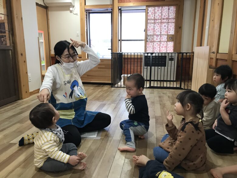 おでこや頭、頬などゆっくり触れています👐 保育士のお手本を見てみんな上手にできました✨