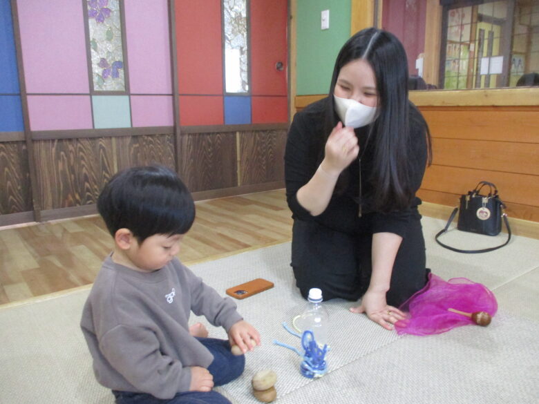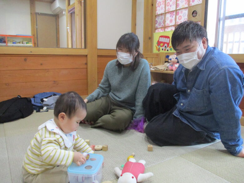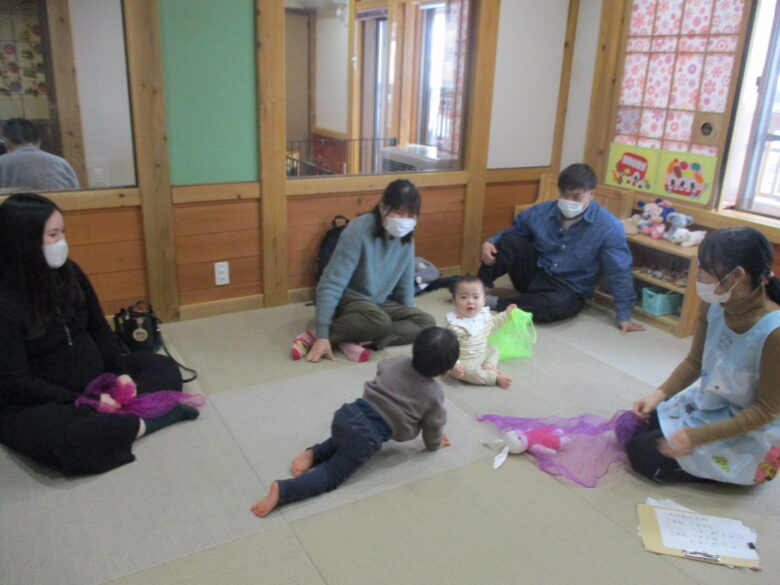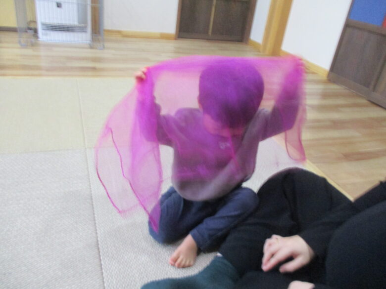 今日は保育参観が行われました。どんぐり組では保育士と一緒にわらべうたをして遊びました。薄い布を使って頭にふわっとかけるわらべうたをすると「ばあ」と顔を出して楽しんでいました。