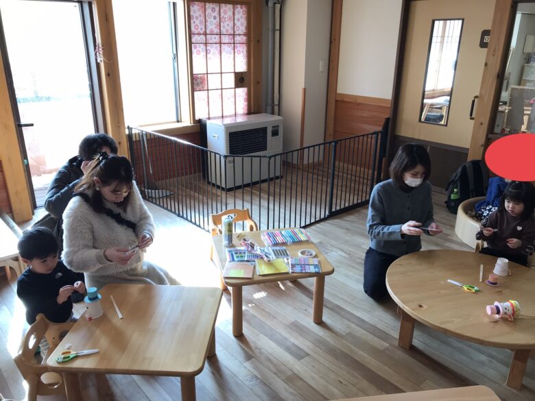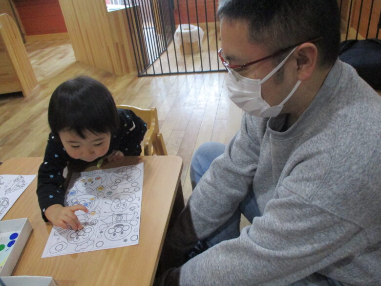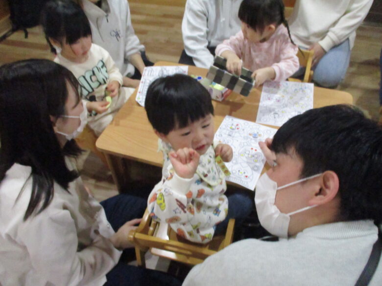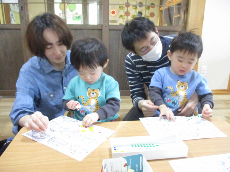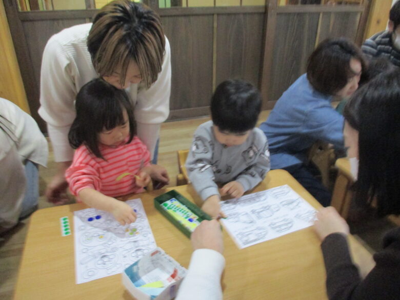 くり組はキリンやトンボのリズム遊びとシール遊びをしました。お父さんお母さんと一緒に楽しく身体を動かしたり、座って上手にシールを貼って楽しみました。