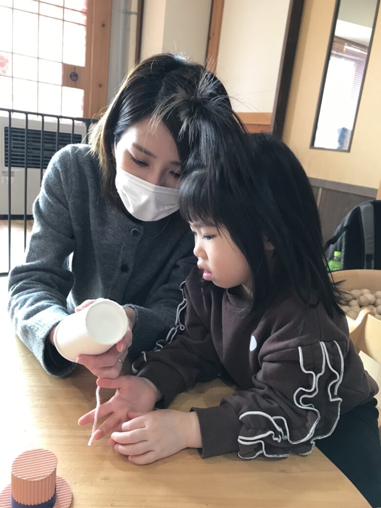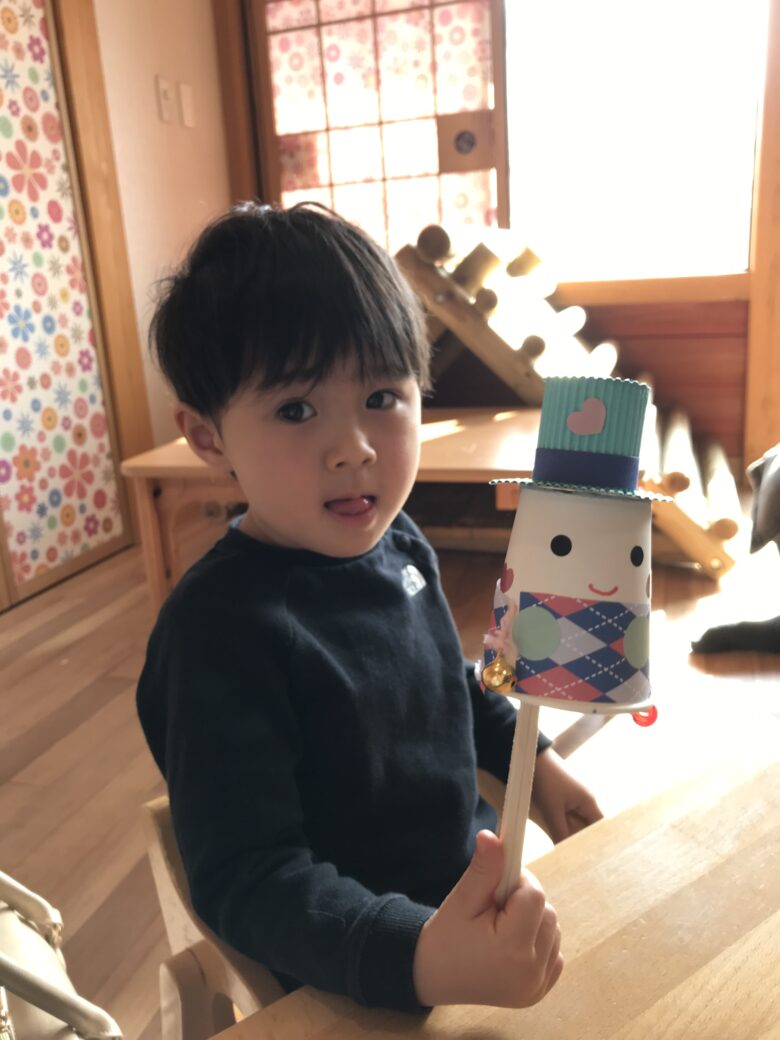 くるみ組は楽器の制作を行いました。紙コップや毛糸、折り紙、シールなどを使いかわいい顔の楽器を作りました。それぞれ好きな材料を選んで、上手に作っていましたよ。完成すると揺らしてキレイな音がなって喜んでいました。