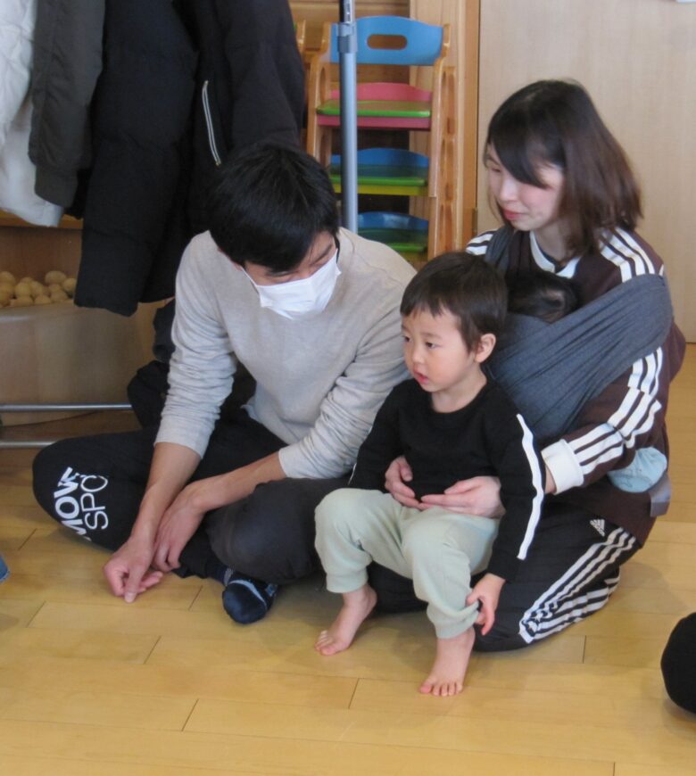0歳児は、親子で触れ合い遊びを行いました。ゆったりと触れ合う事で、ほんわかした