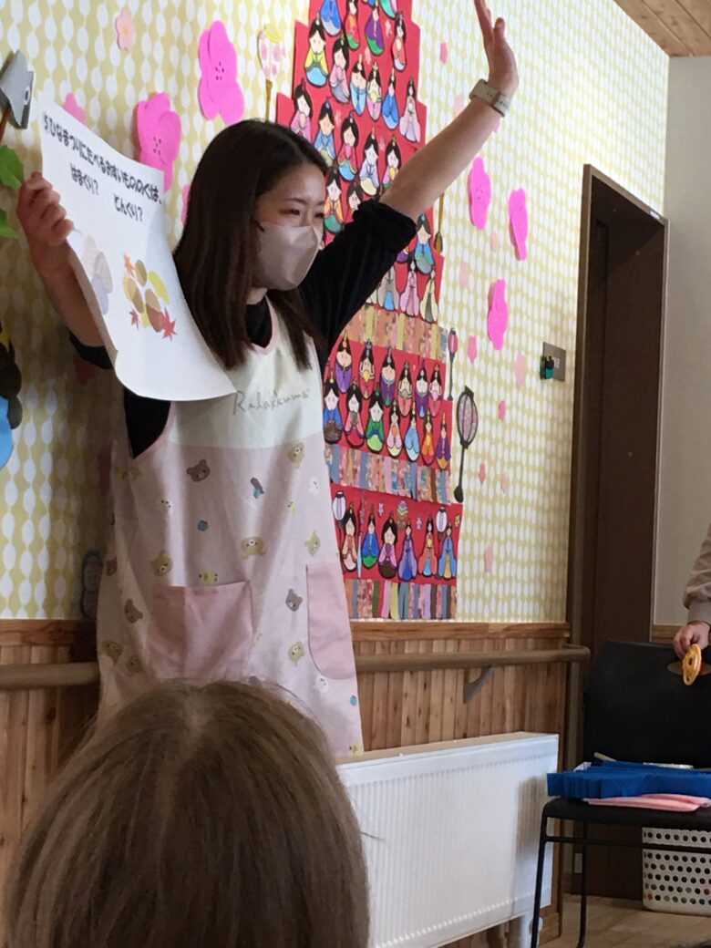 ひな祭りにちなんだクイズに答えた後は、お楽しみのひなあられを食べたり、甘酒を飲みました。