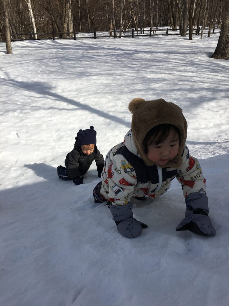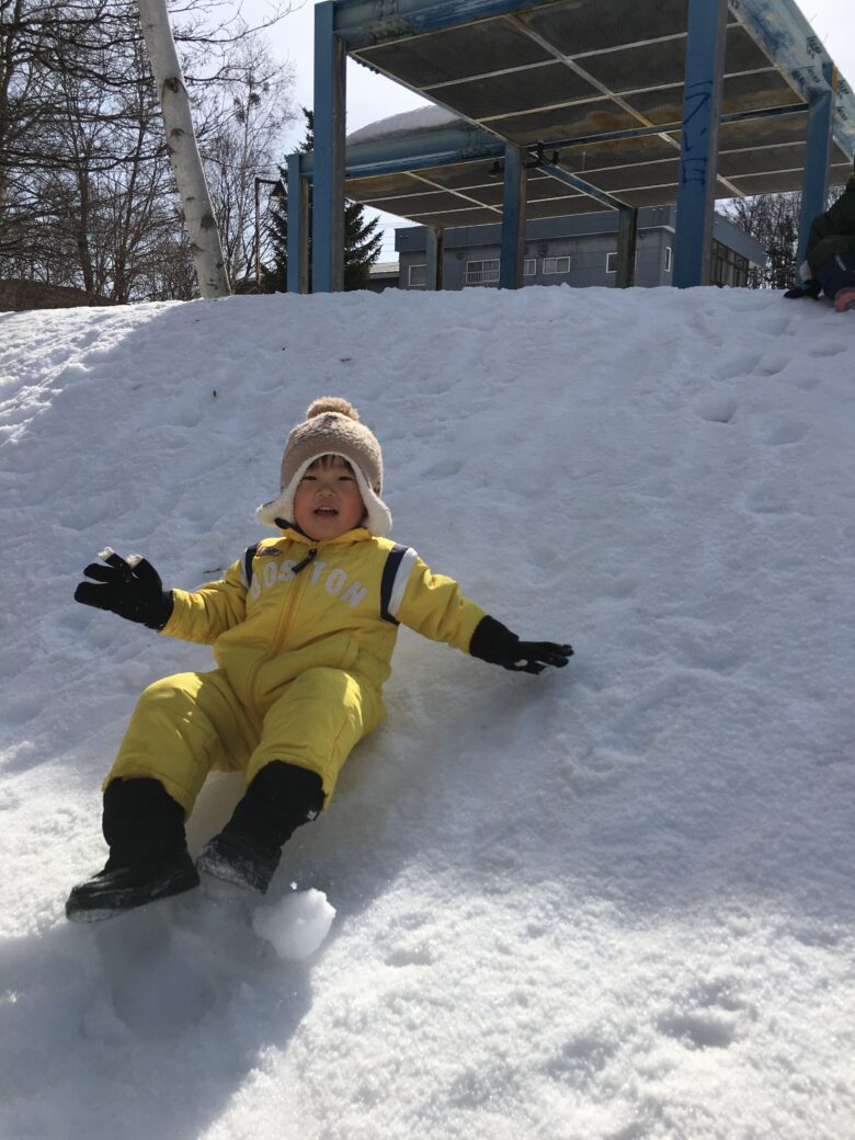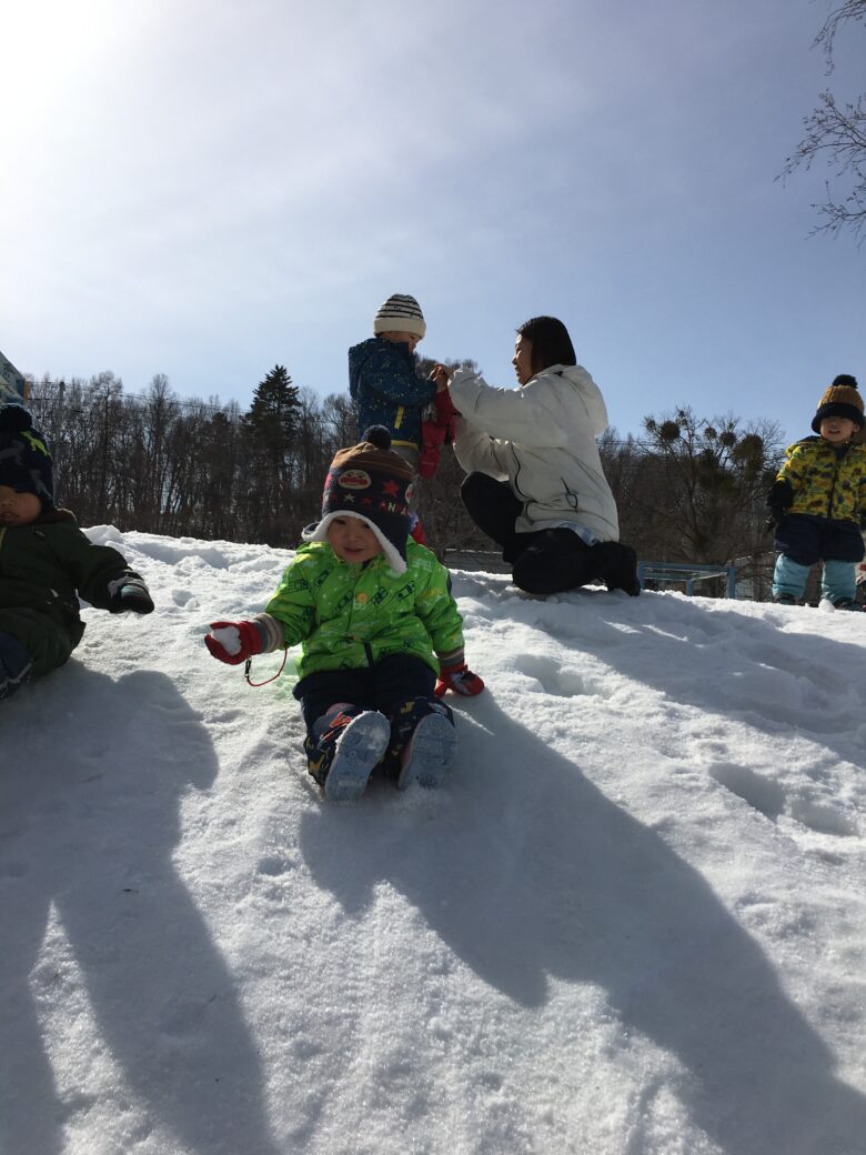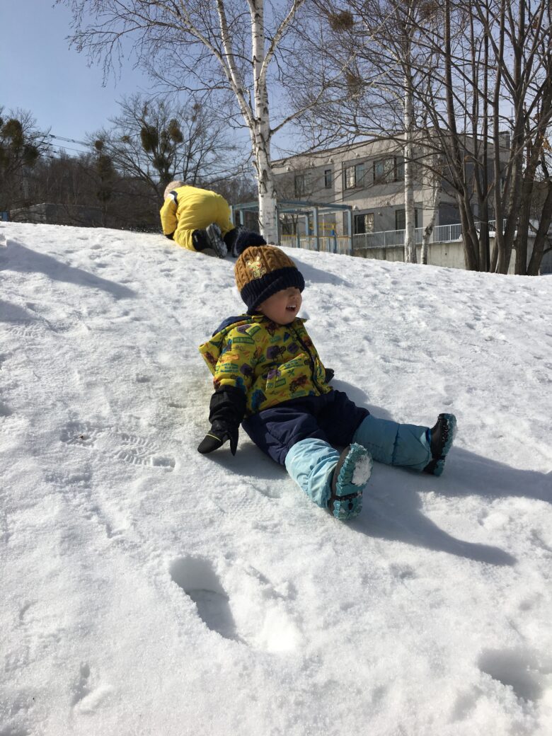 四つ這いで登ってから、尻滑りを楽しんでいました。