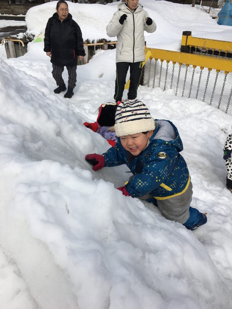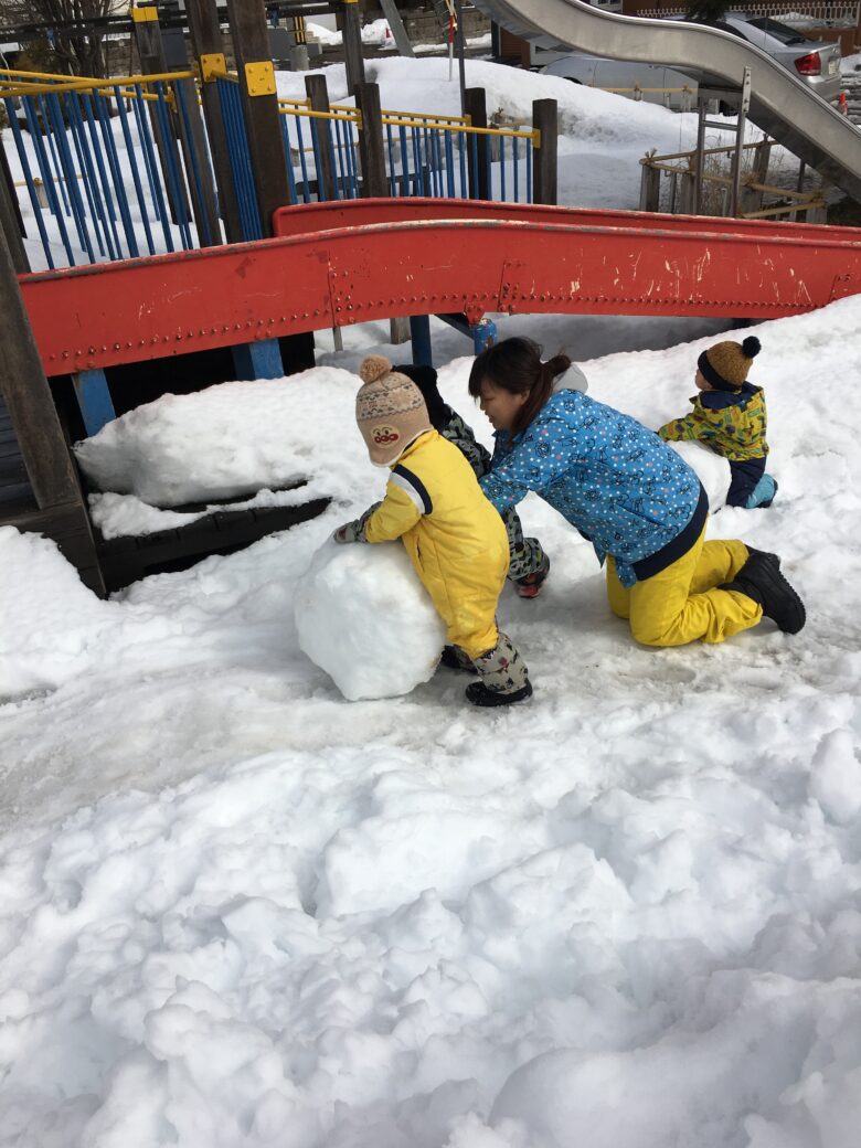 今日もむくどり公園に行ってきました。そり滑りの合間に雪だるま作り、みんなで協力して作りました。