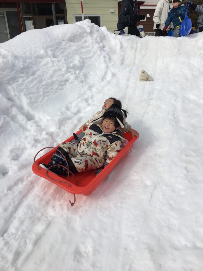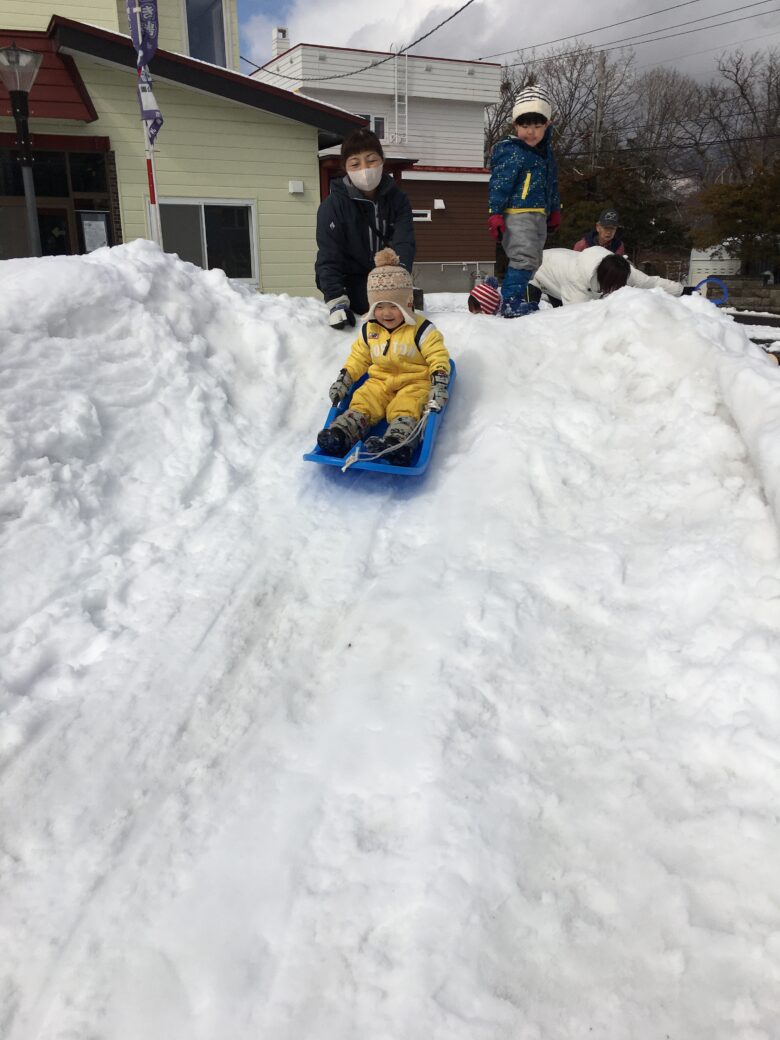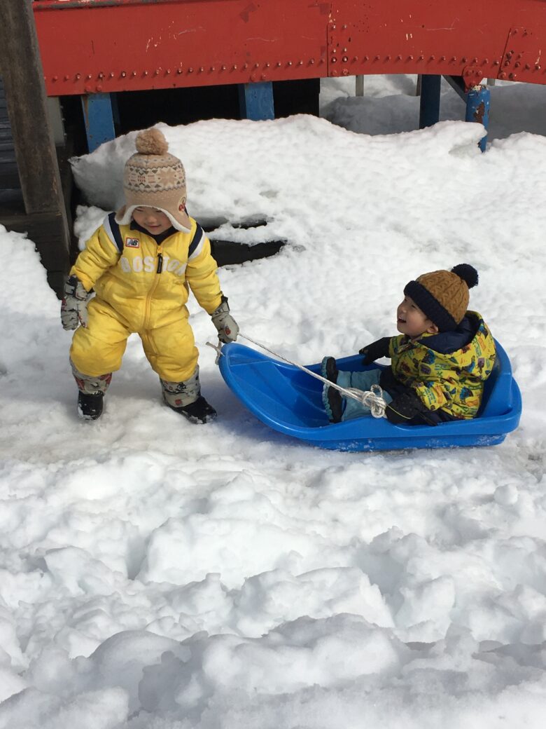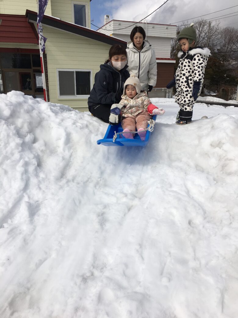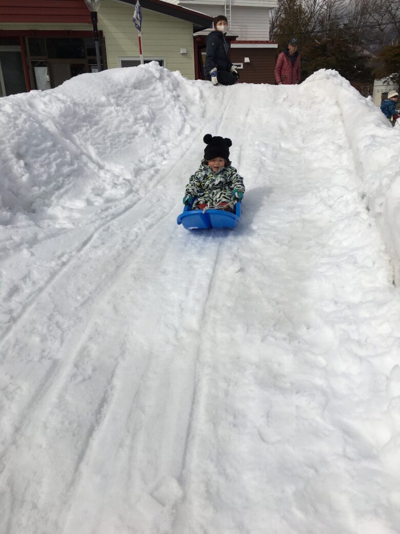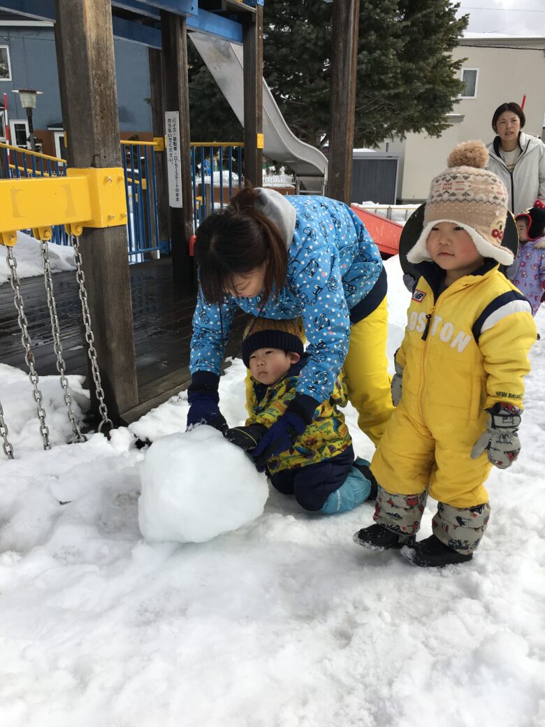 今日もむくどり公園に行ってきました。そり滑りの合間に雪だるま作り、みんなで協力して作りました。