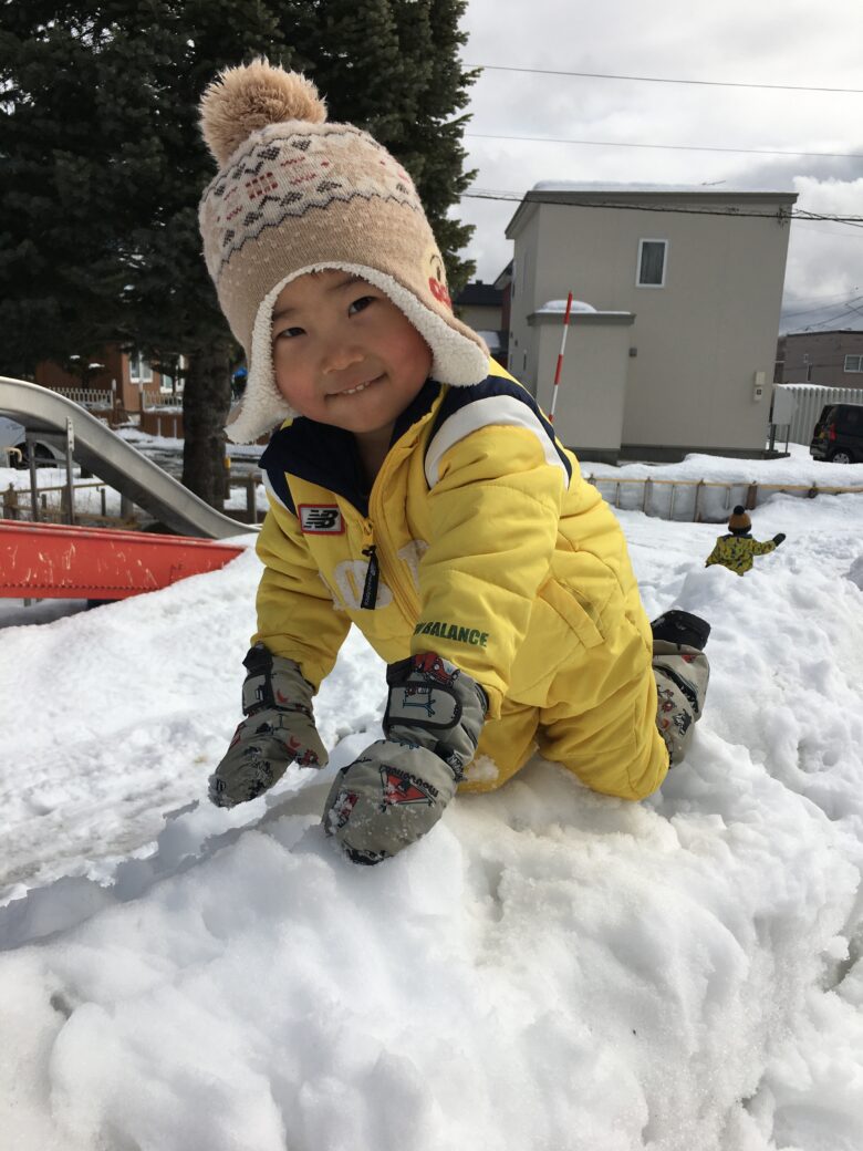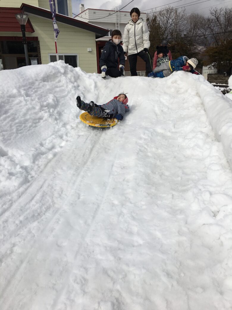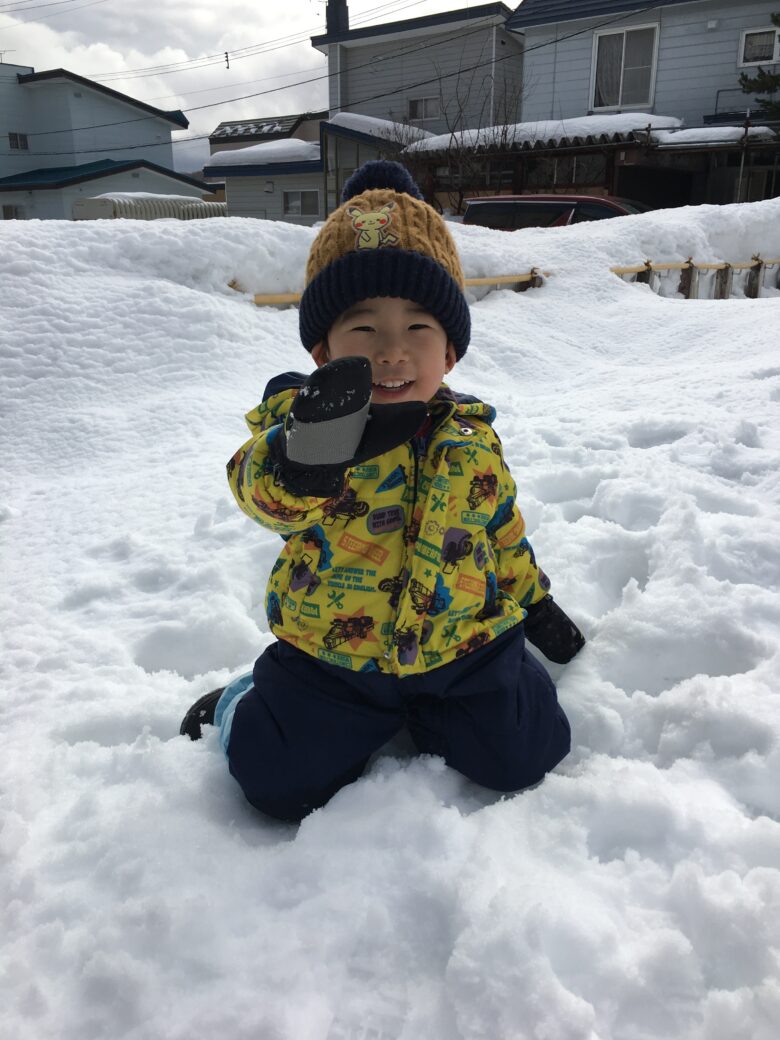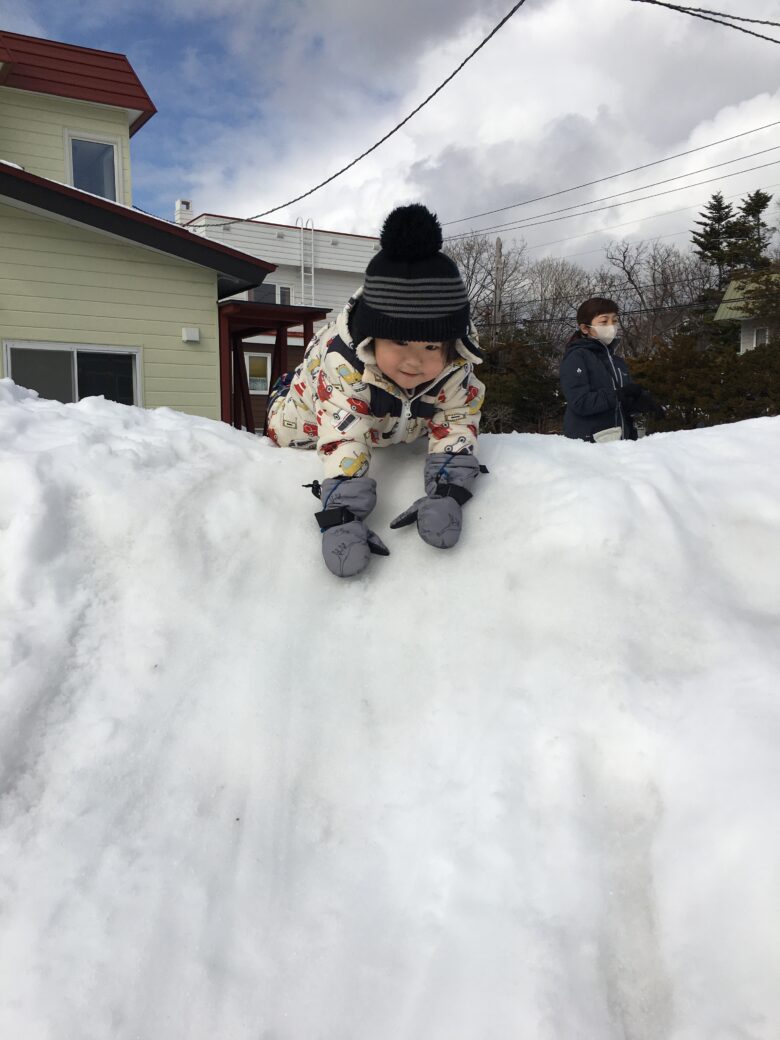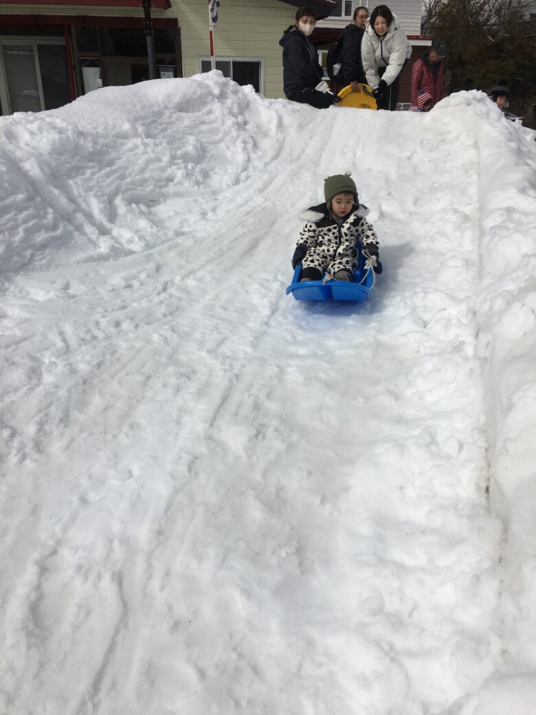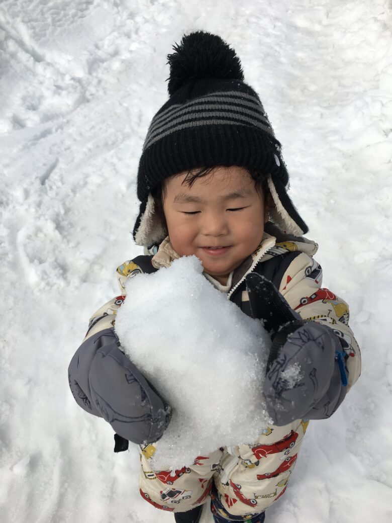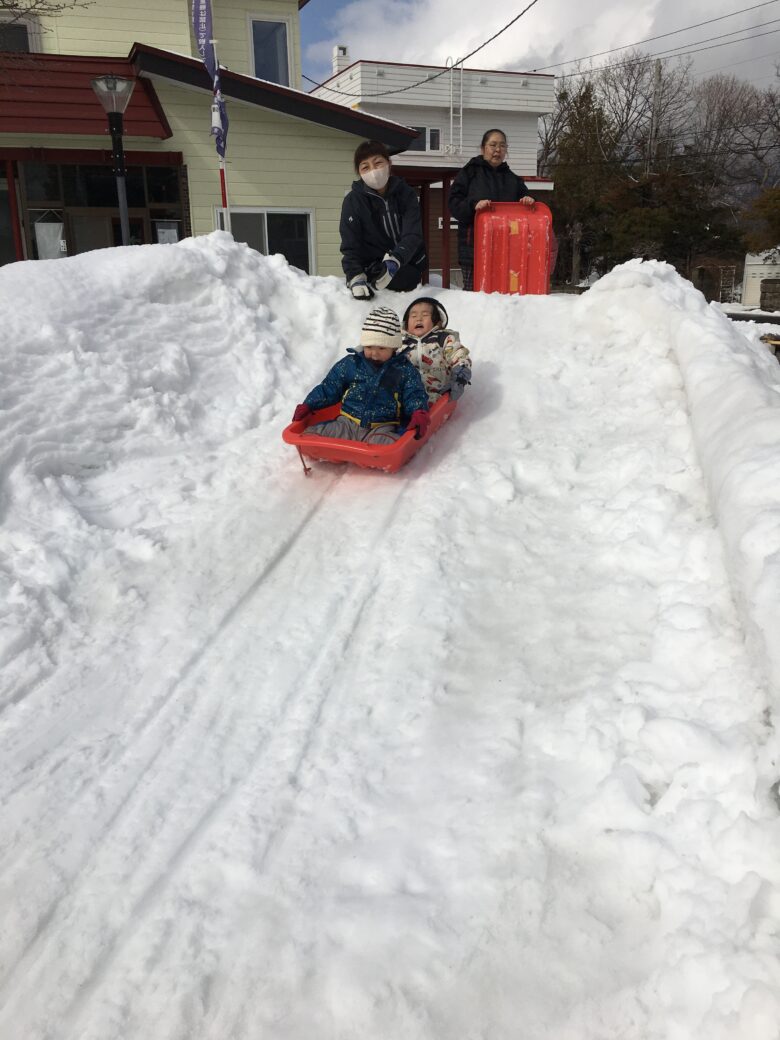 今日もむくどり公園に行ってきました。そり滑りの合間に雪だるま作り、みんなで協力して作りました。