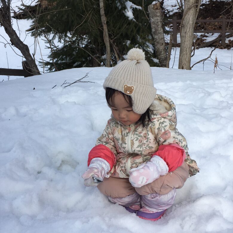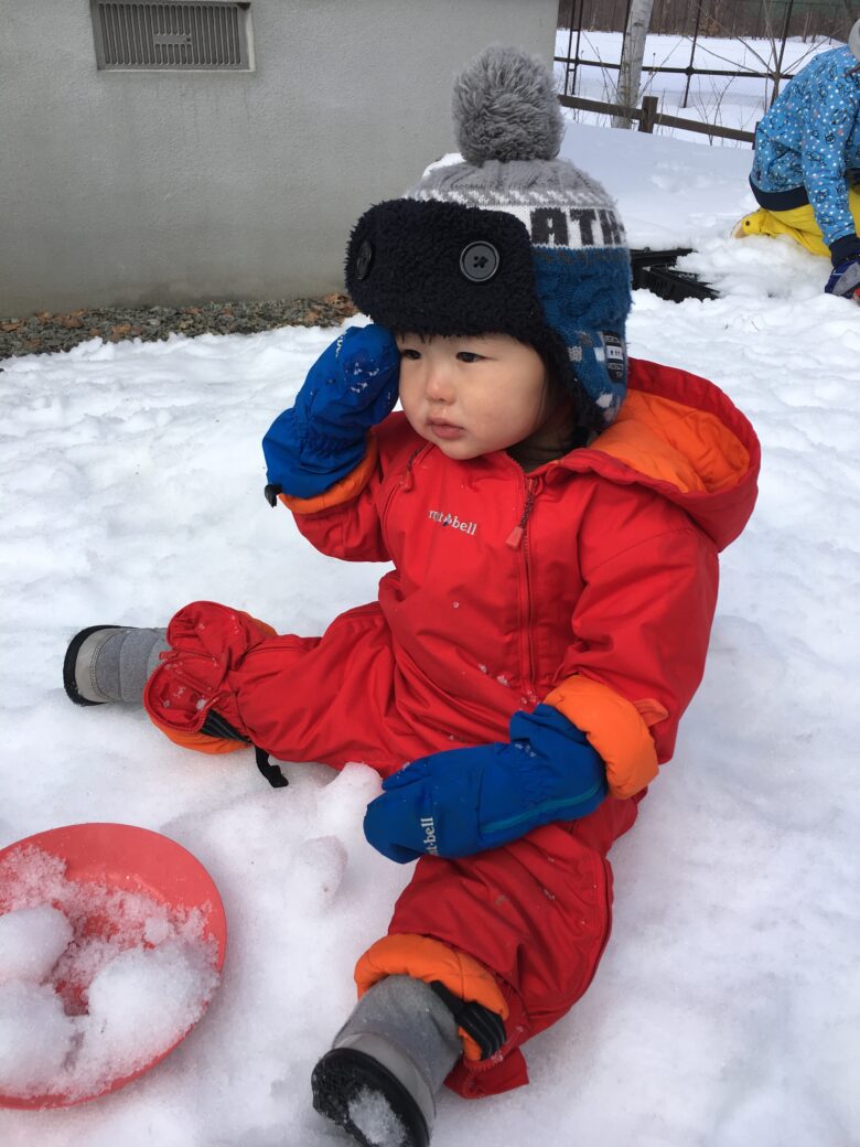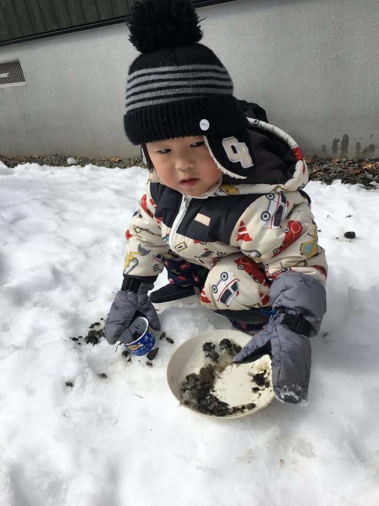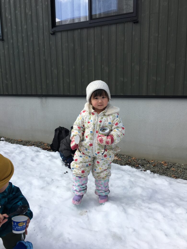 昨日作った雪だるま、今日もまだいてくれて大喜び。目がないね~と言って目をつけてくれました。