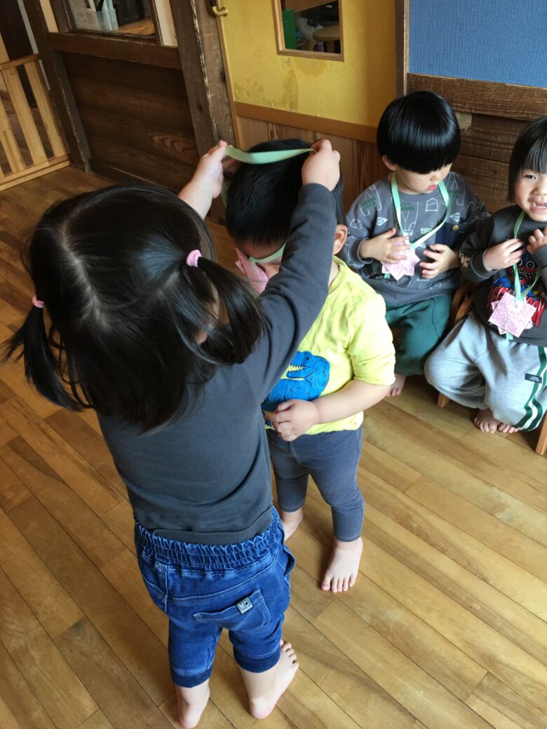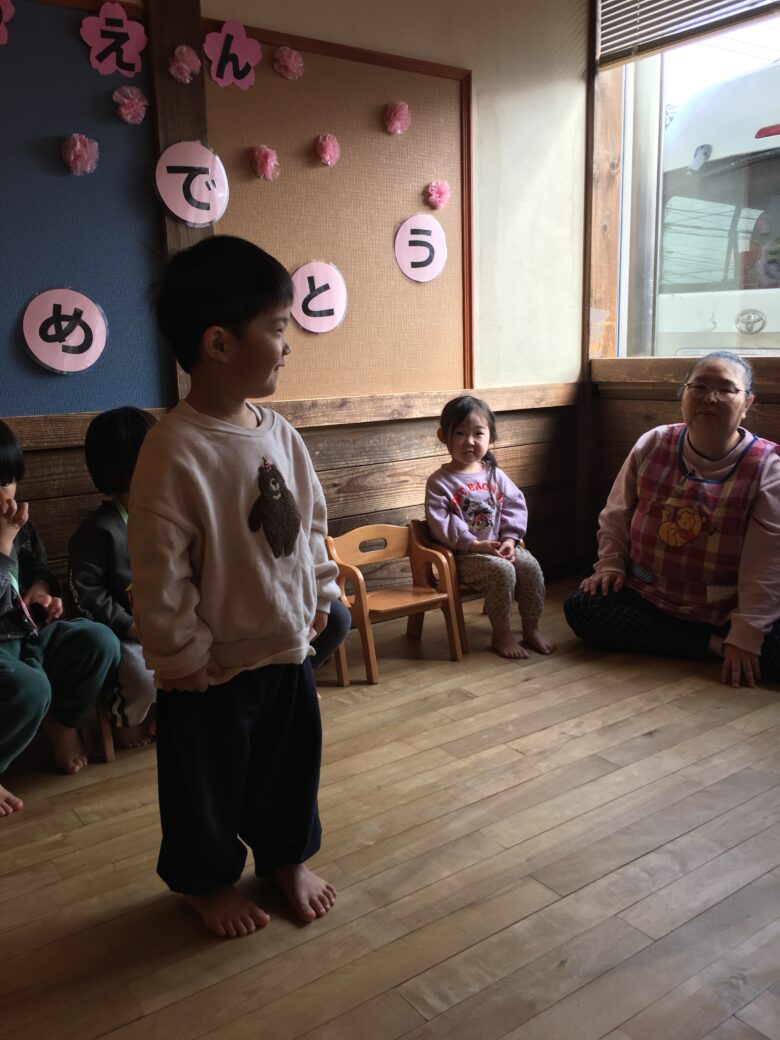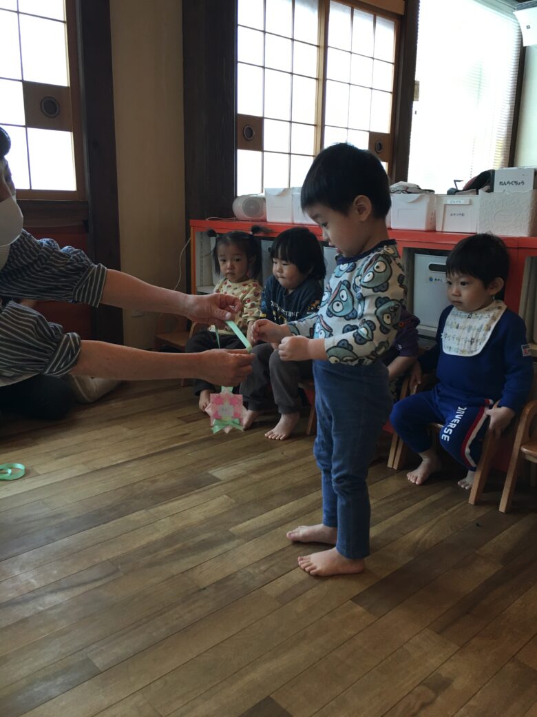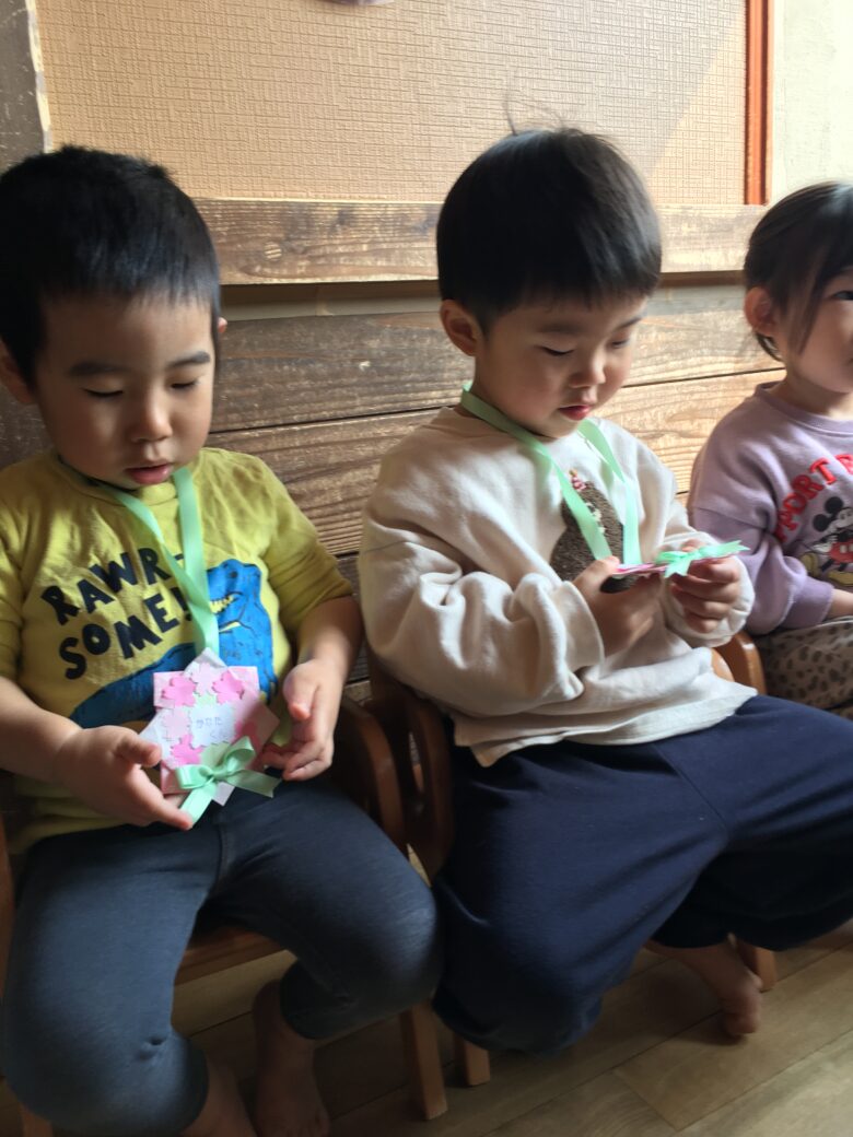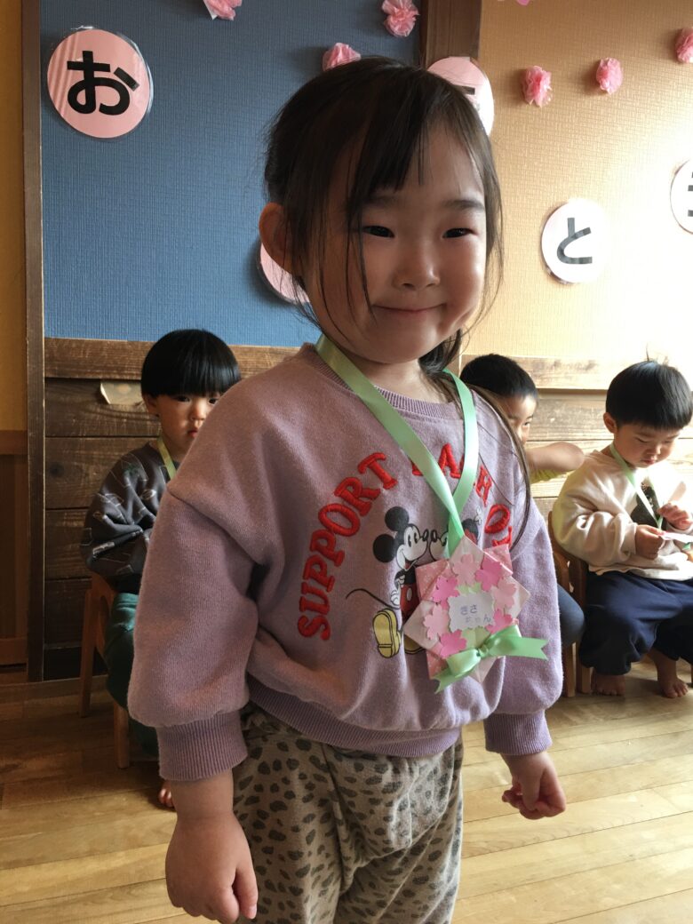 くるみさんのお別れ会がありました。担任と一緒に入場して、くるみさん一人一人にインタビューをしました。保育園で、一番好きな遊びを答えてくれました。「モックロック・積み木・・・」が多かったです。