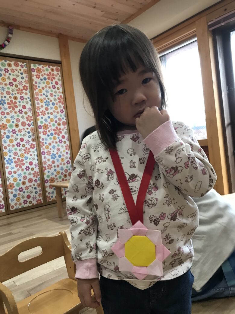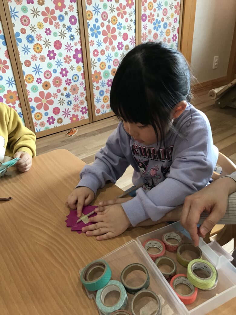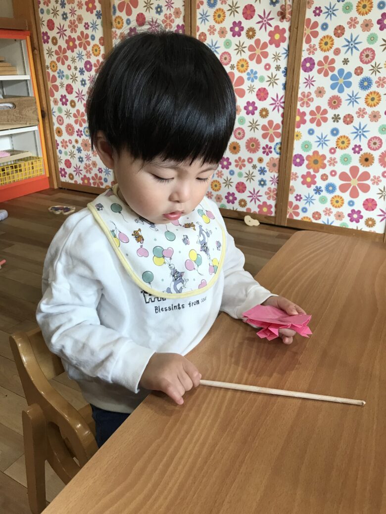 くるみ組さんへのプレゼント作りの様子です。折り紙のお花を保育士と一緒に作りました。