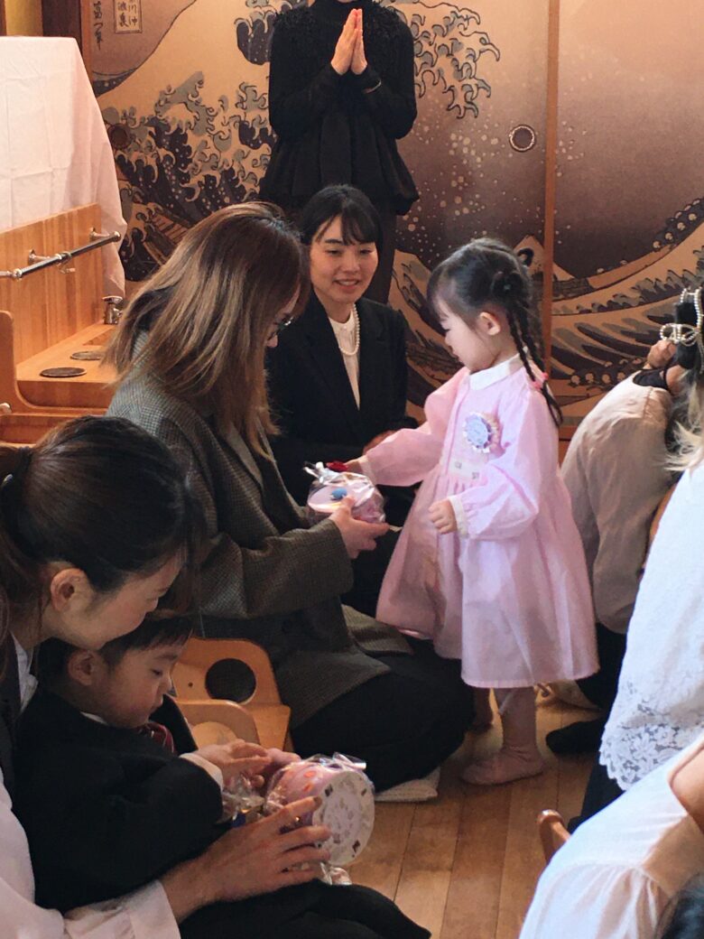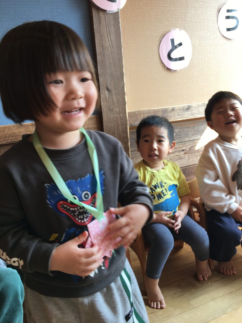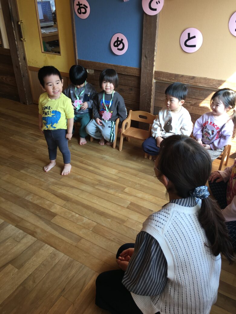 くるみさんのお別れ会がありました。担任と一緒に入場して、くるみさん一人一人にインタビューをしました。保育園で、一番好きな遊びを答えてくれました。「モックロック・積み木・・・」が多かったです。