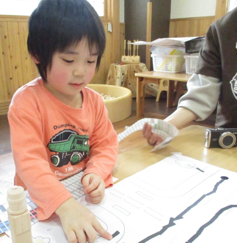 家を置いたら、どう走らせたいか、線を引き・・・スタート地点に黒丸シールを貼り、線の上に細い黒いシールを貼ります。