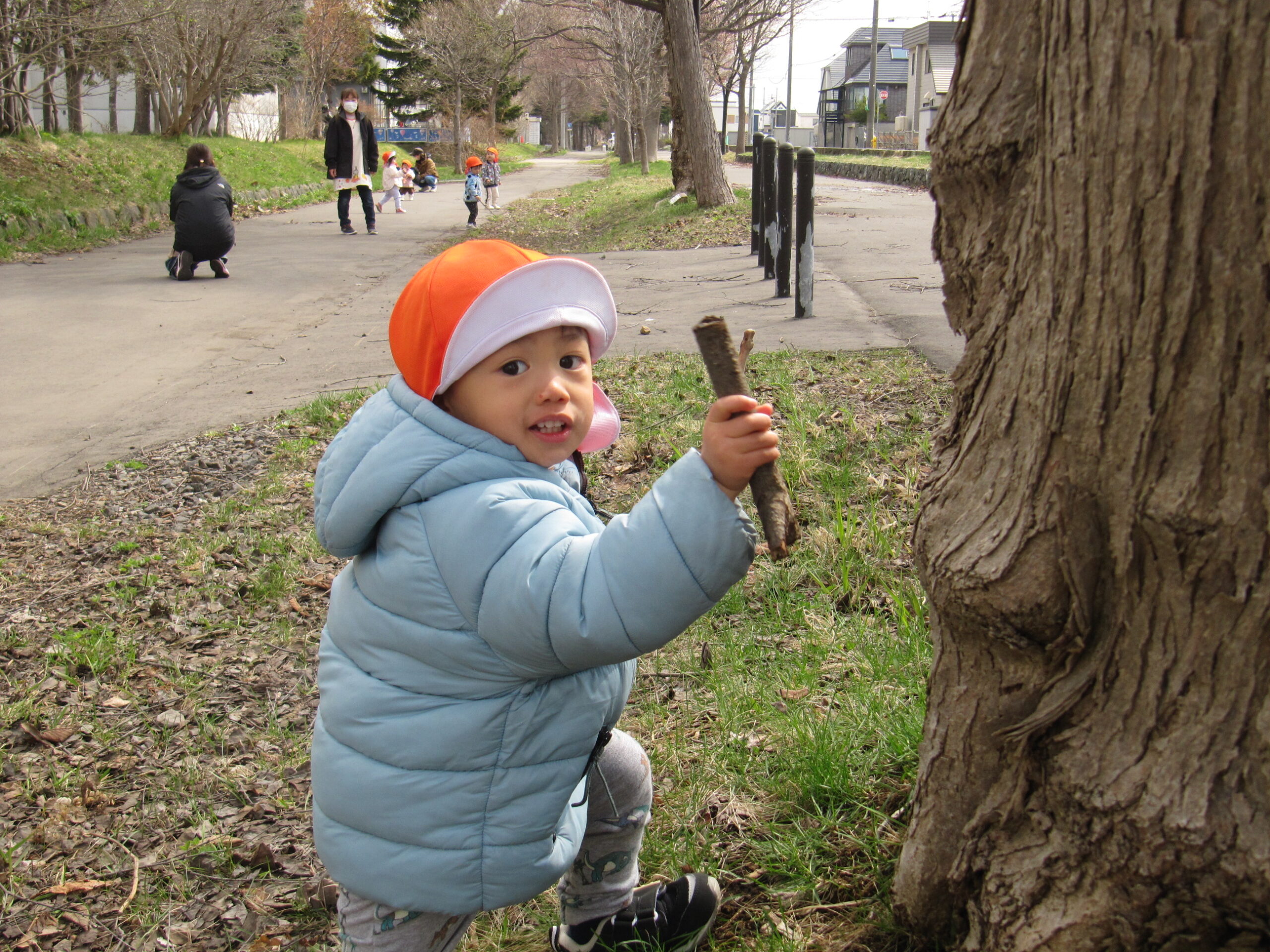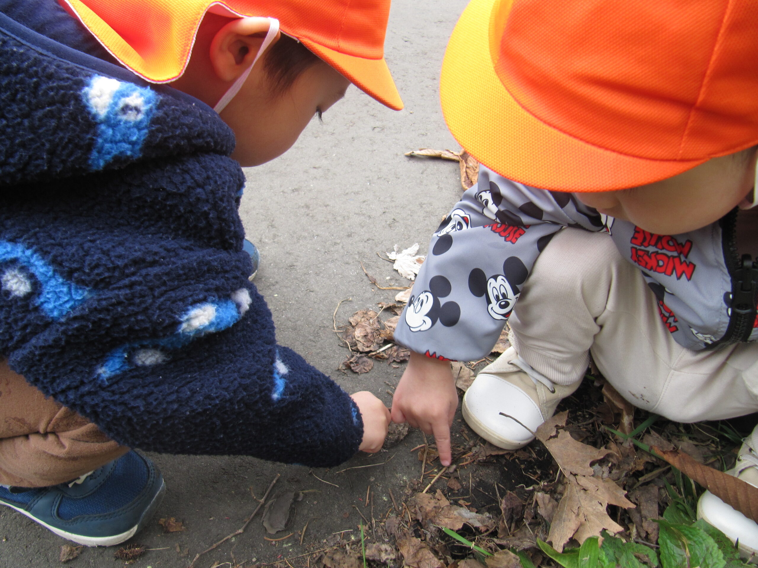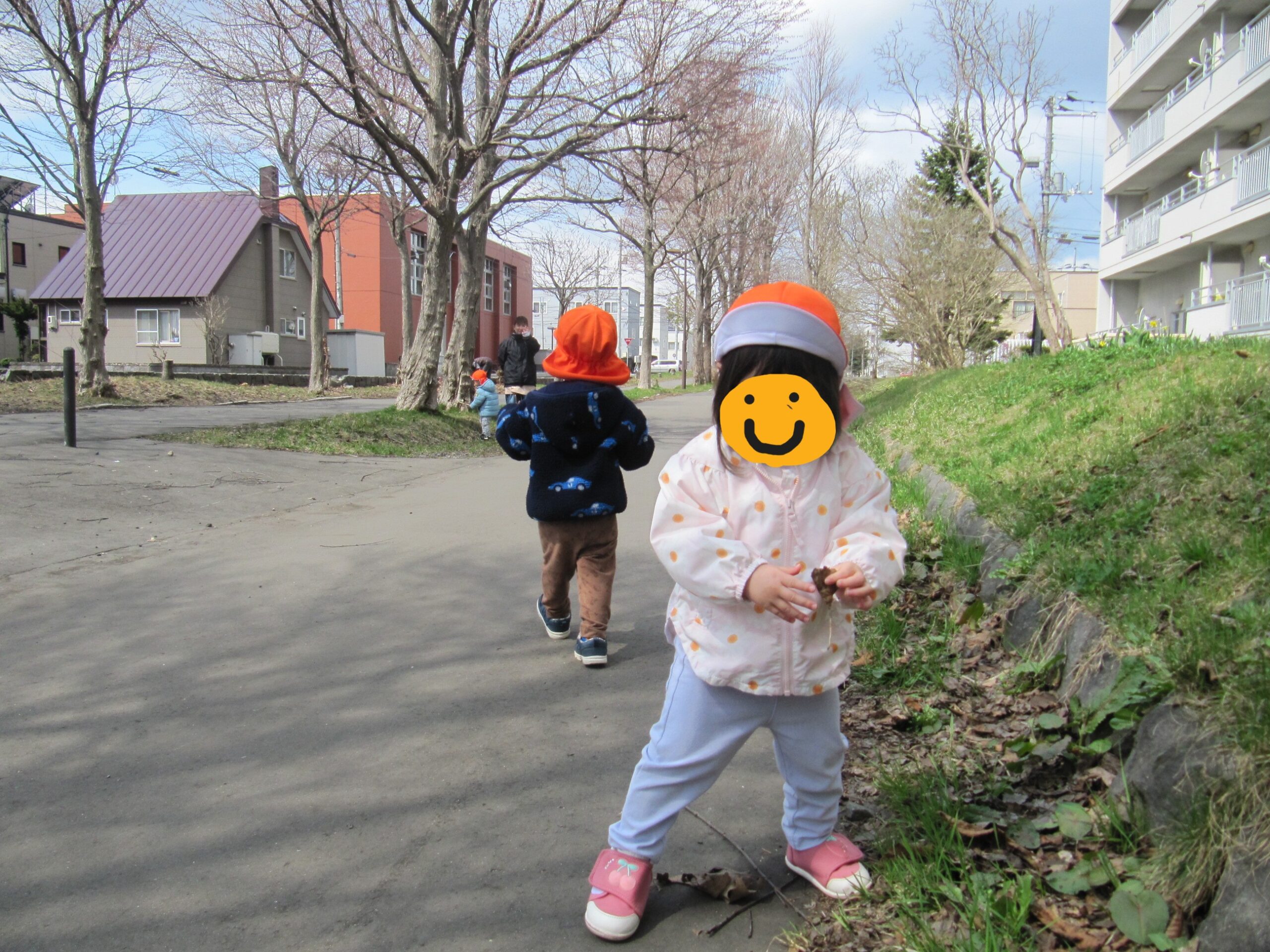 曇り空でしたが信号を渡って地区センター隣の遊歩道までお散歩に行きました。かわいいお花をそっと指で触ってみたり、枯れた葉っぱをめくったらだんご虫やミミズが隠れていて興味津々の子どもたちでした😊