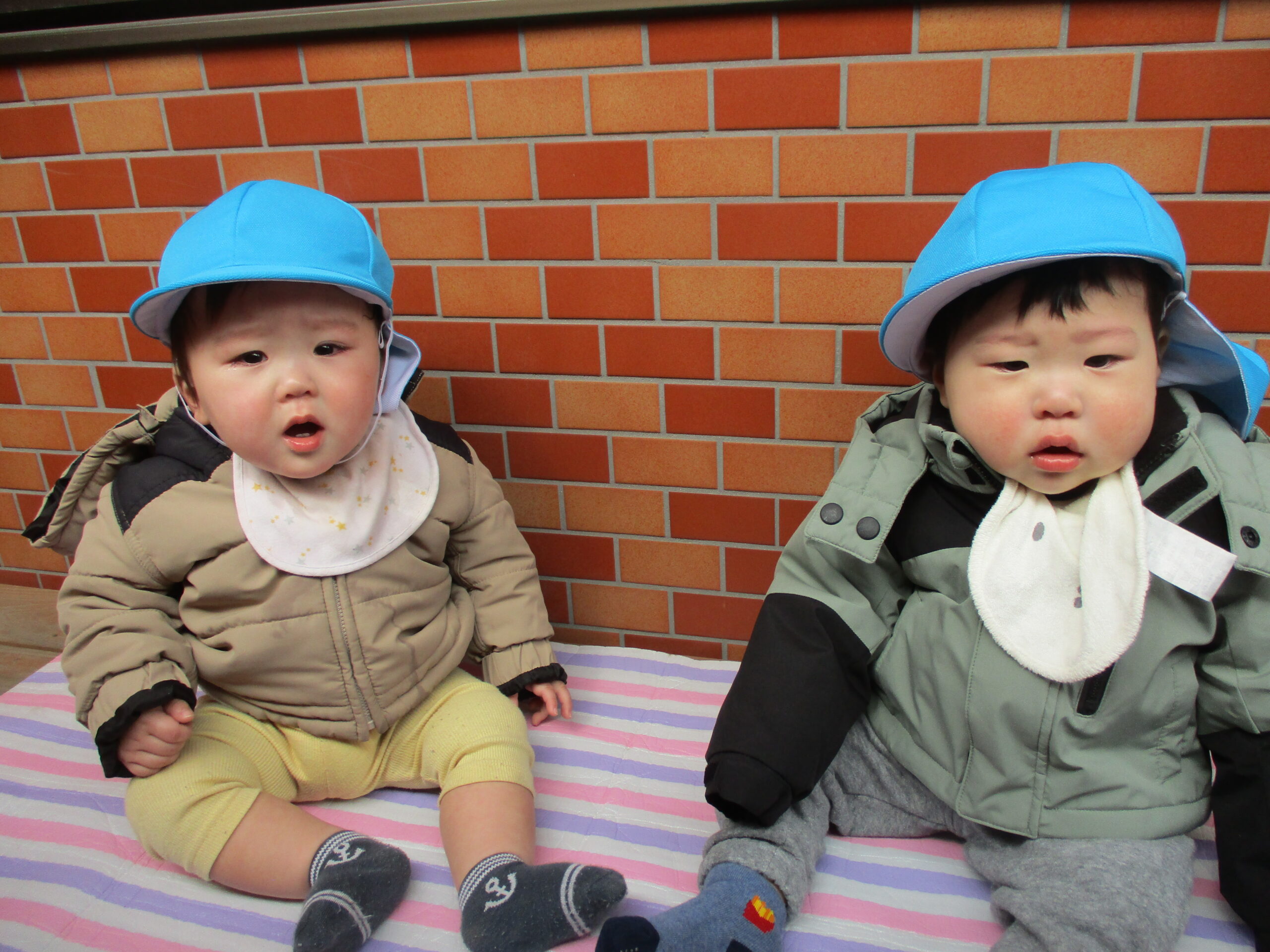 春の季節を少しでも感じられるよう、ベランダで過ごしました🌸 2人でシートに座っている姿がとっても可愛いです💓