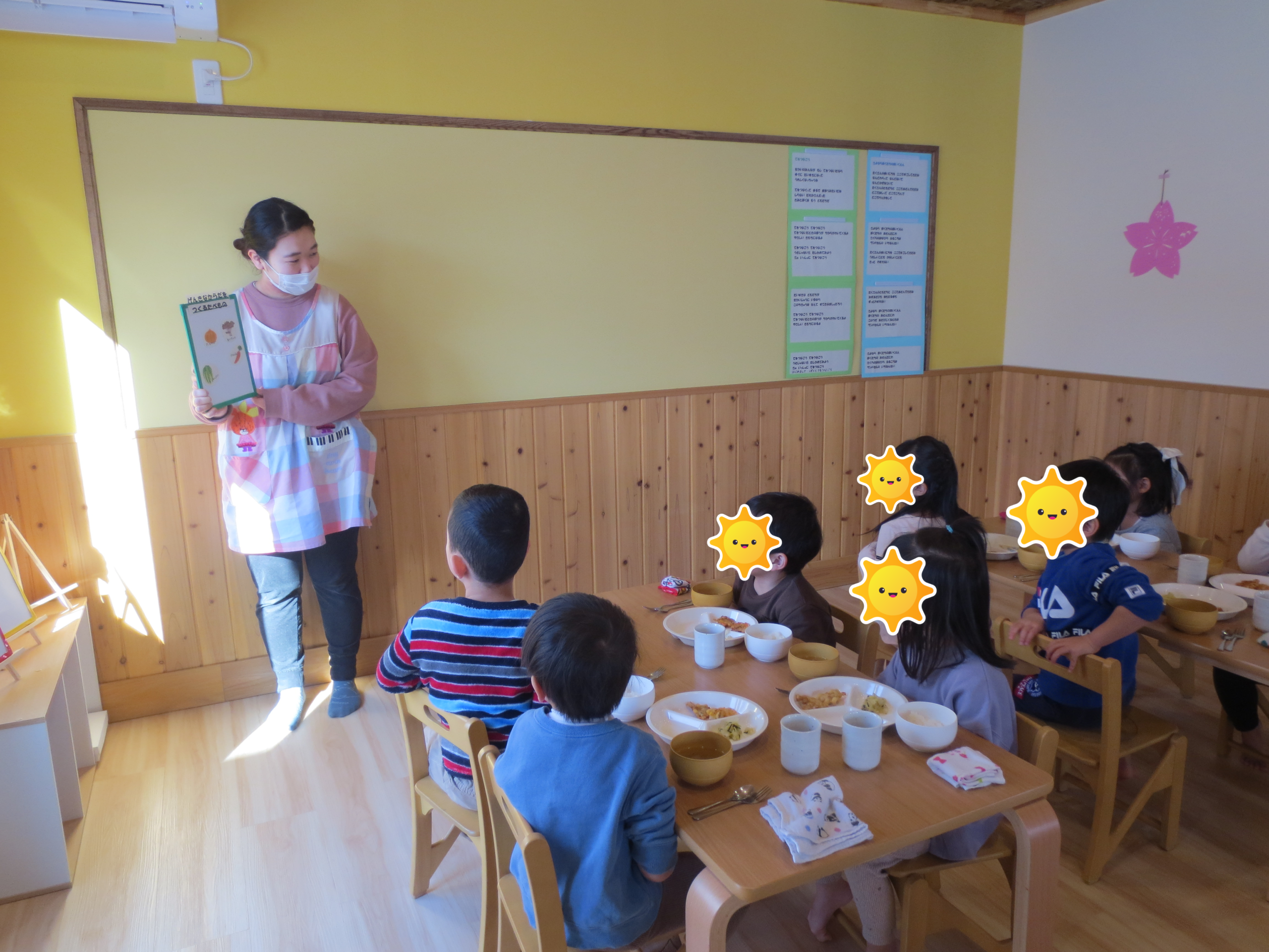2月の半ばに3・4・5歳児クラスで、食育活動の一環として“えいよう”の話しを栄養士から教わりました。