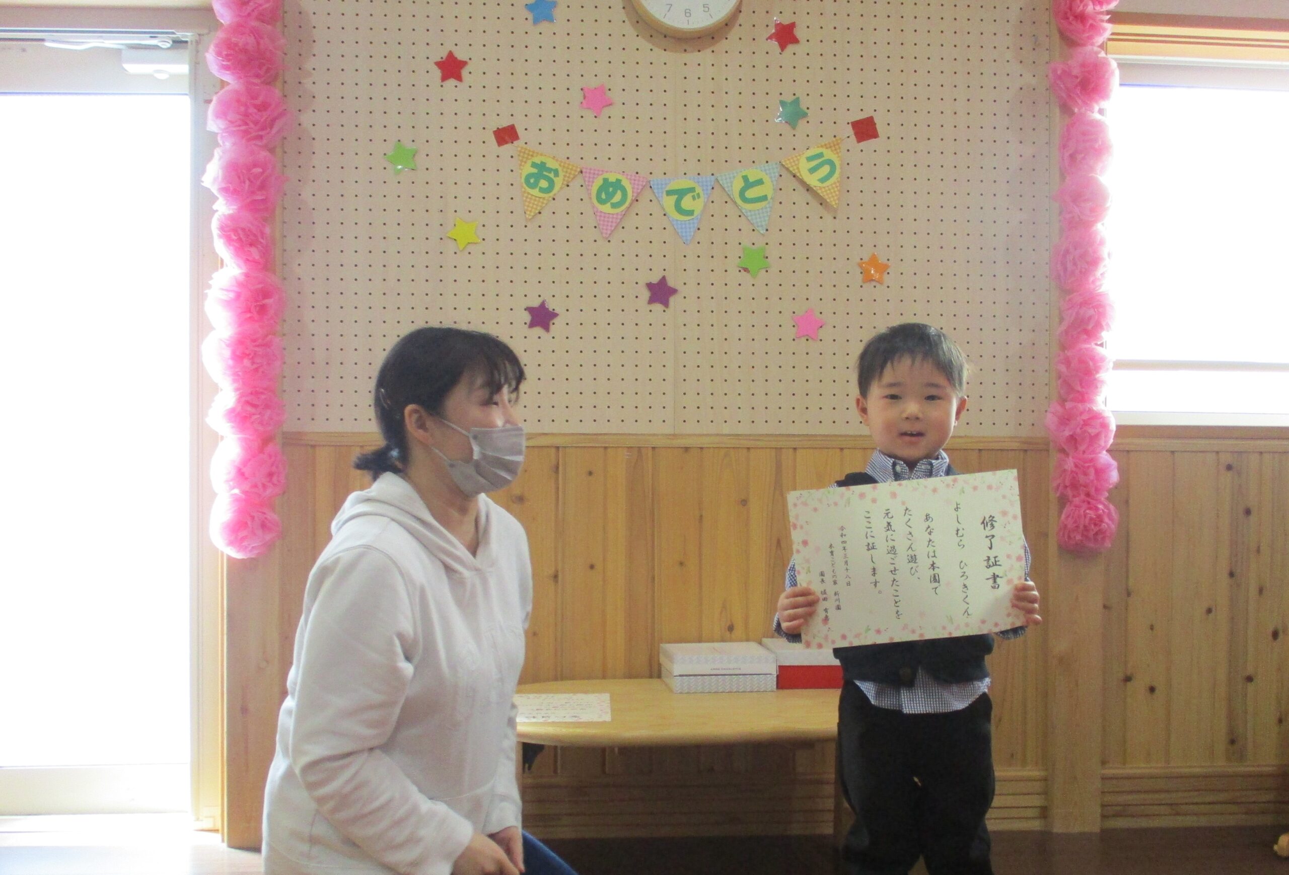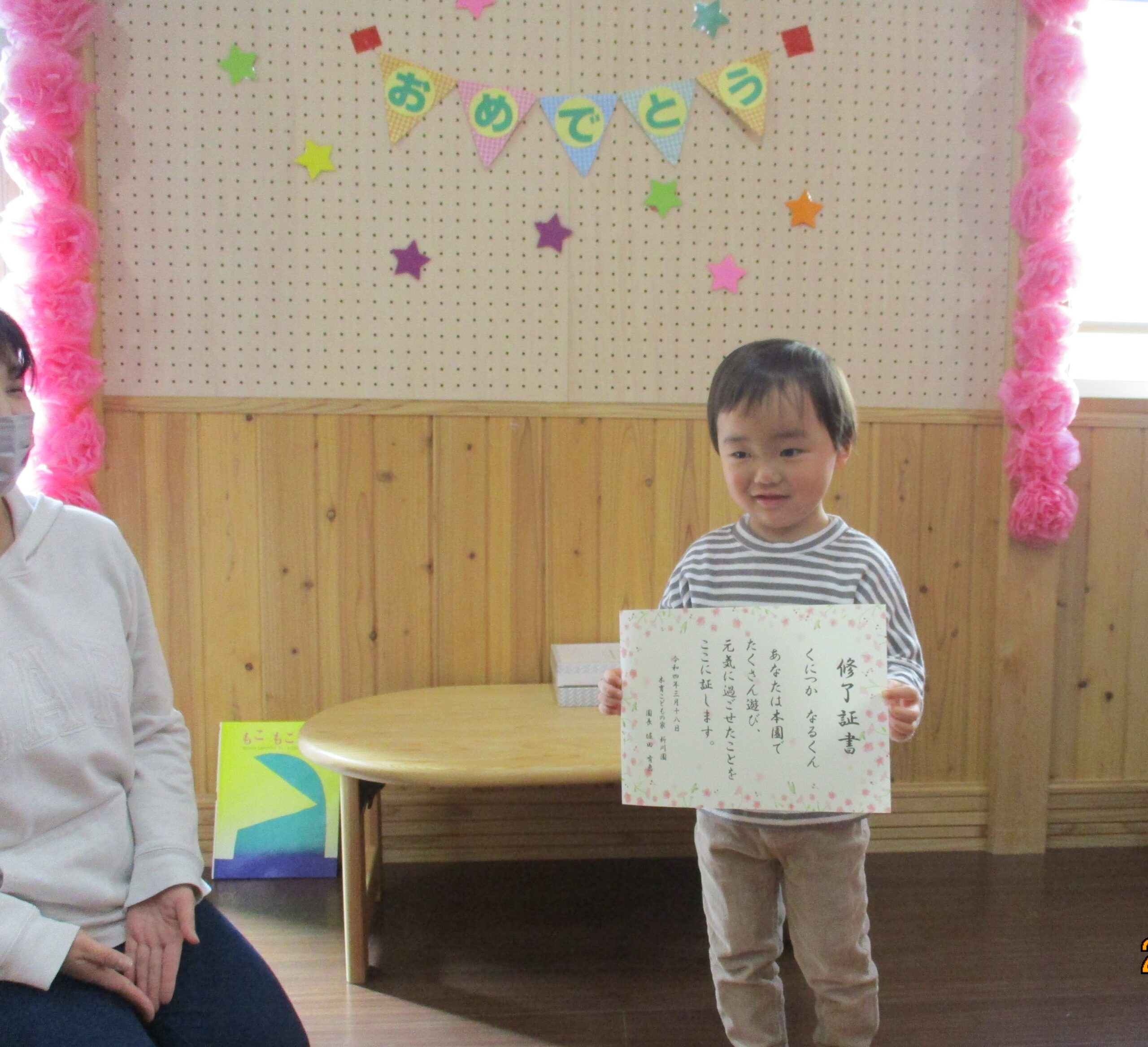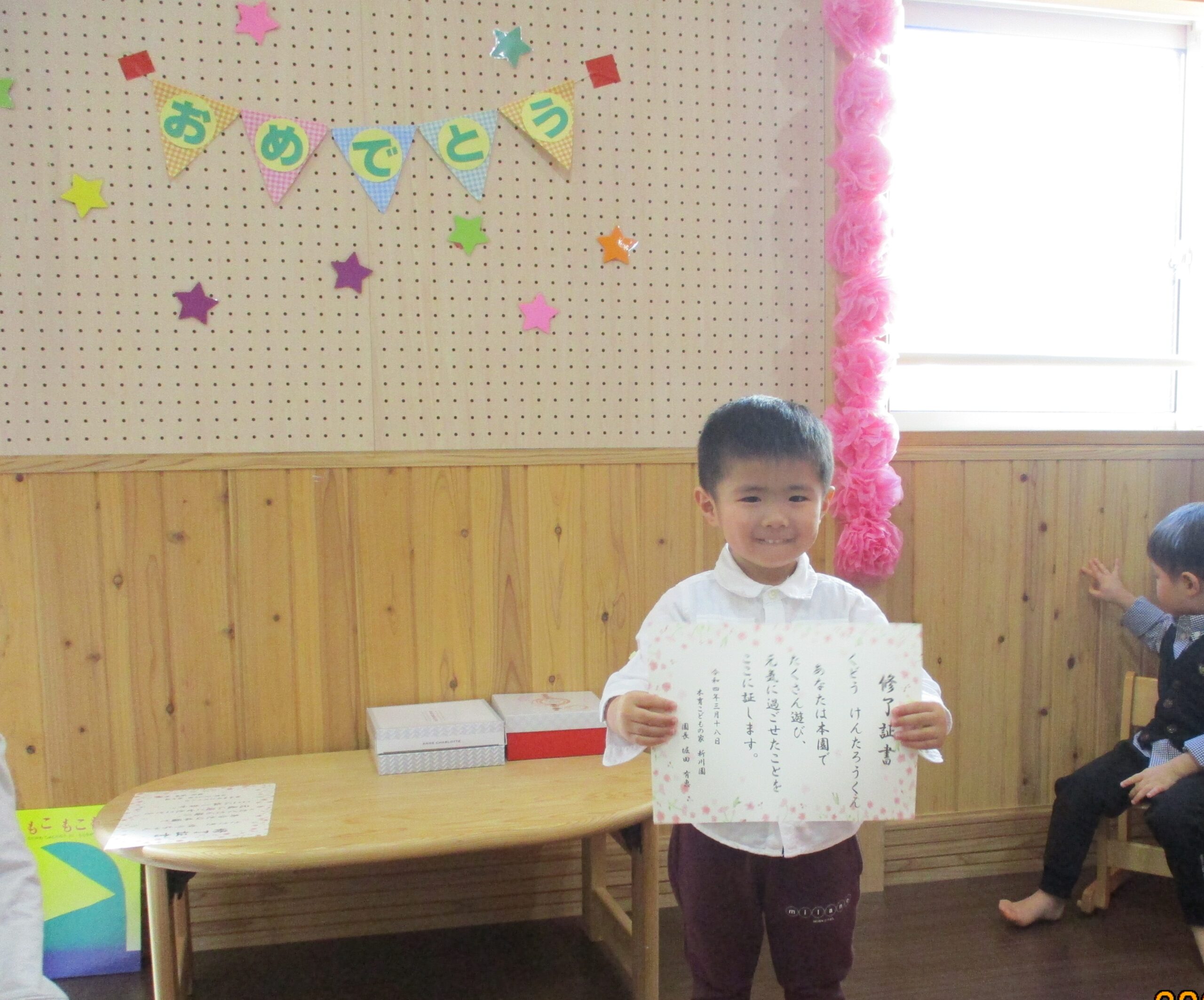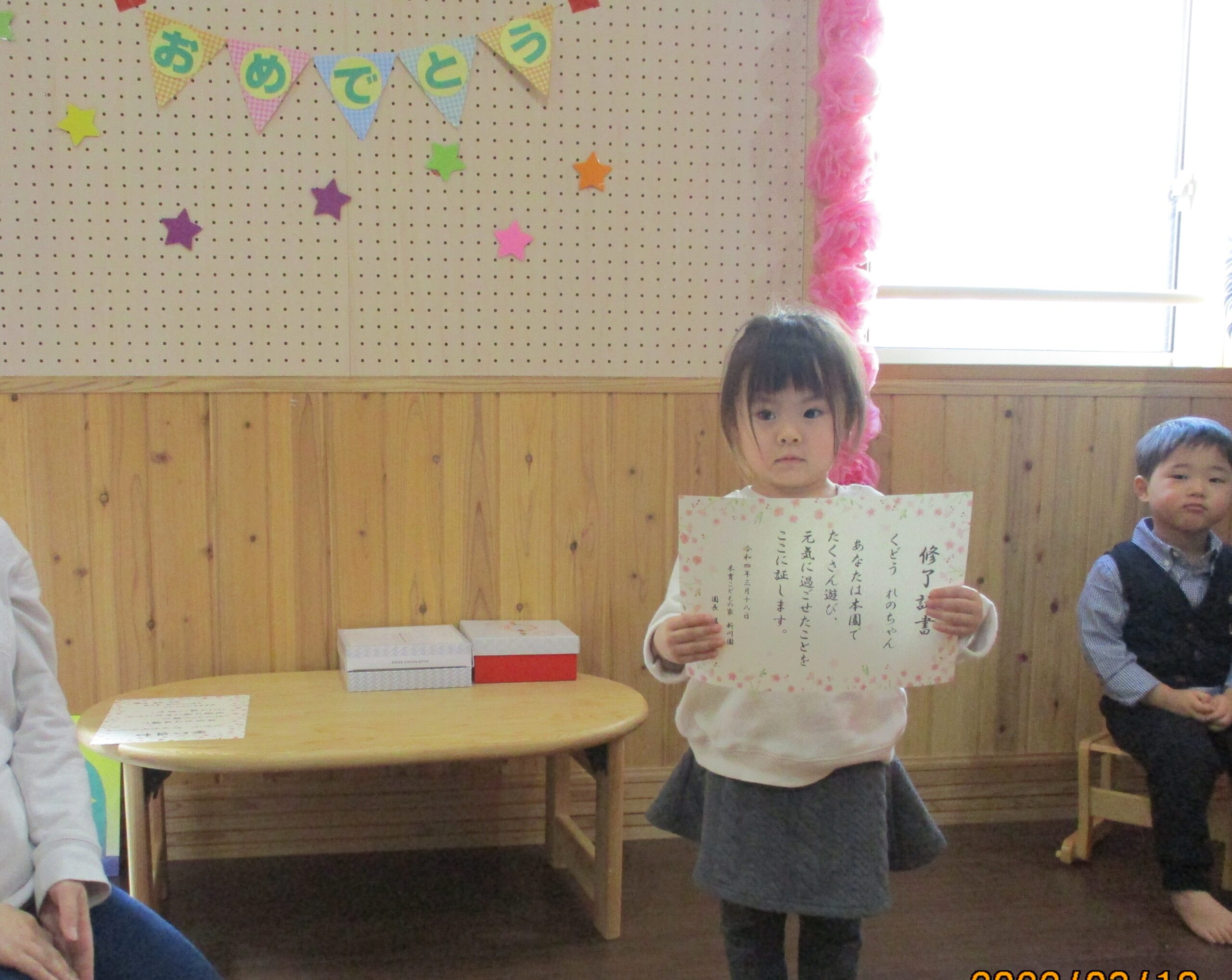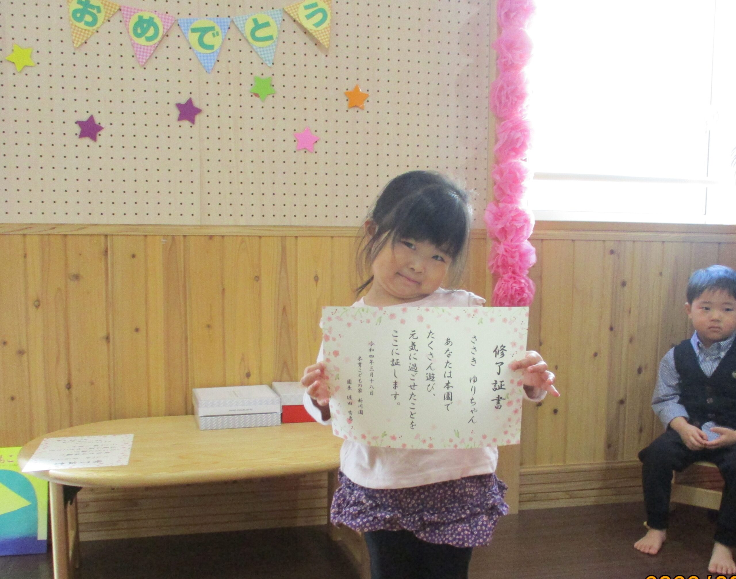 くるみ組(2歳児)のお別れ会です。 小規模保育園は2歳児までしかいられないので、4月からそれぞれ別々の幼稚園や保育園に通う事になります。 なので・・プチ卒園式的にお別れ会を開きました。 2歳児だけどとlっても凛々しく見えました😊