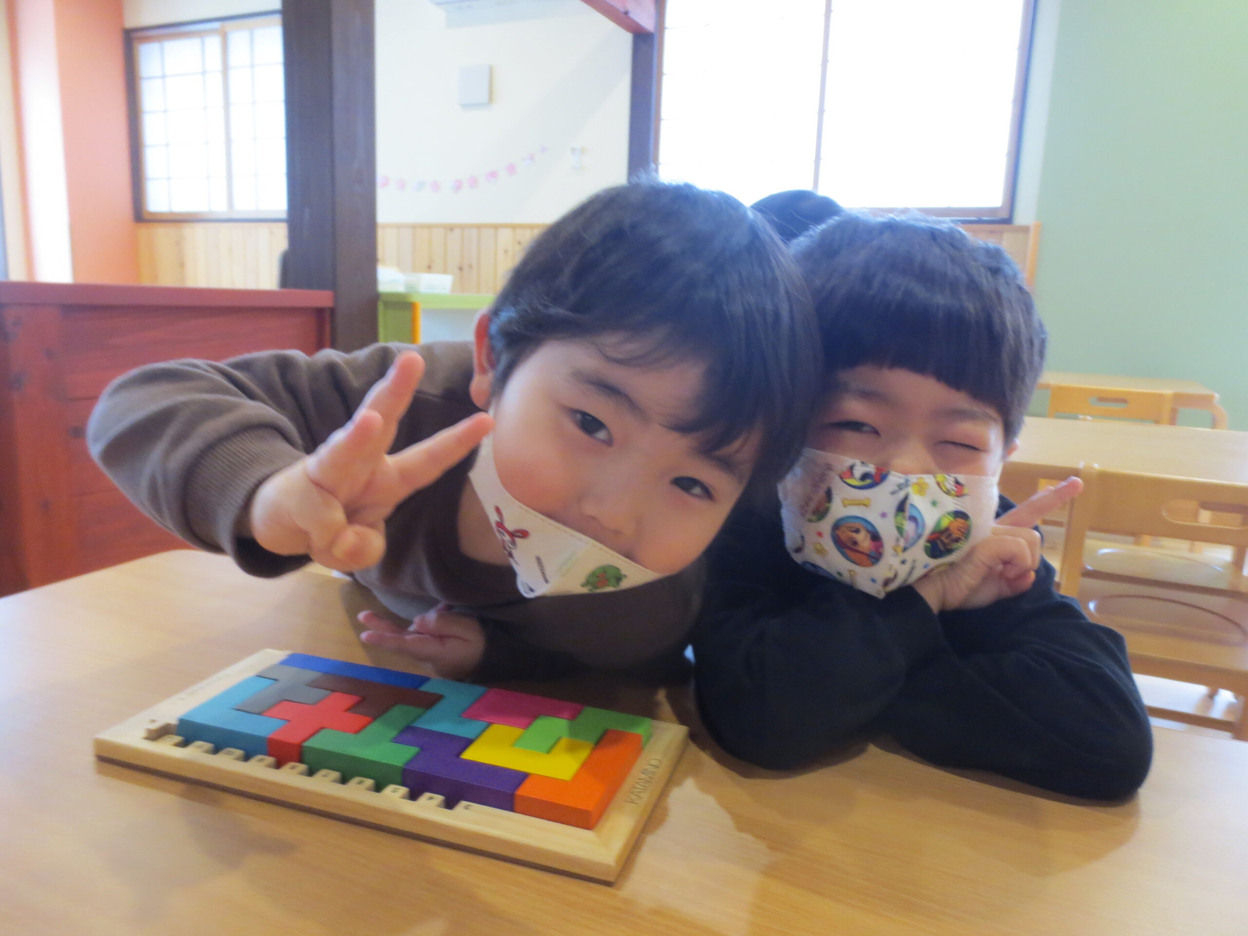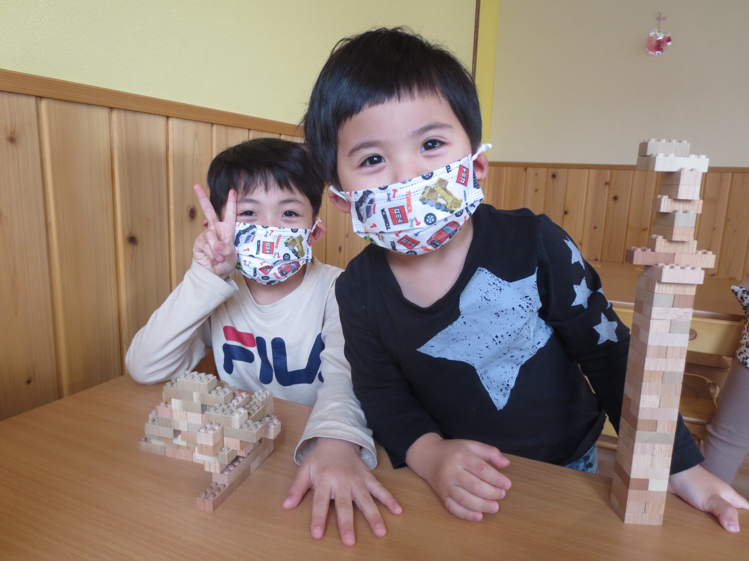 3・4・5歳児のお部屋では、お友だちと一緒に木のおもちゃで遊ぶ姿が見られ
