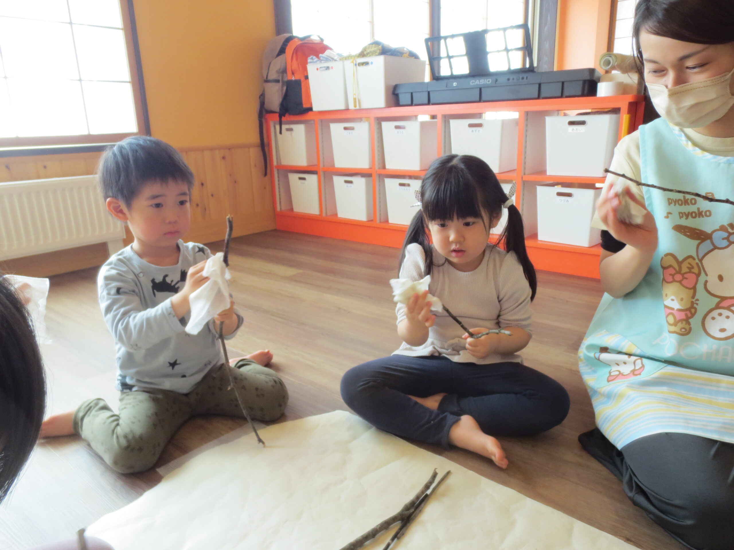 子どもたちは「これ、何に使うのかな~?」「何か作るのかな~?」とお友だちと一緒に考えながら、木の枝1本1本をきれいに拭きあげてくれましたよ(^^)/
