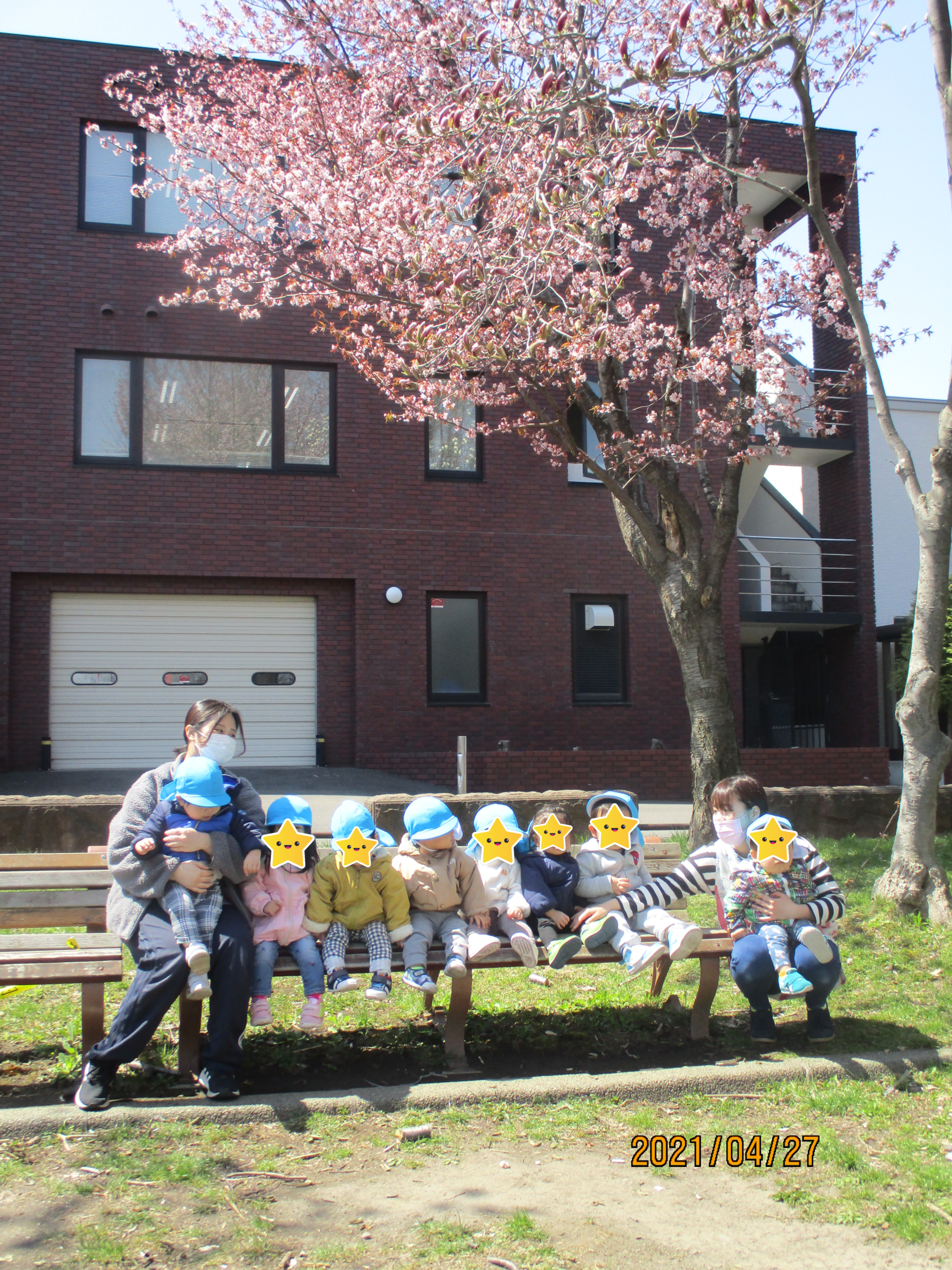 今日はお天気も良く、暖かくなったので近くのわらべ公園に桜の花を見にくり組、くるみ組一緒に出かけました。 クラスごとに桜の前で「ハイ、ポーズ❕」 桜の花も太陽の日を浴びて、たくさん花を咲かせていました。