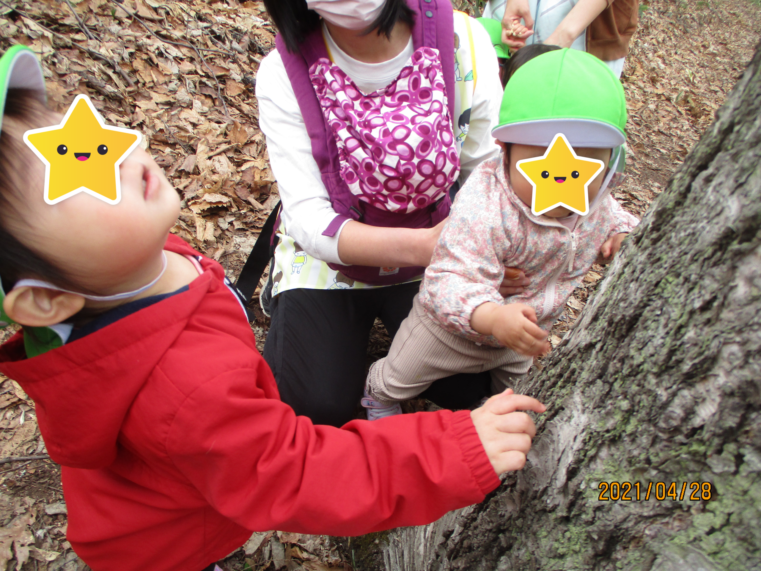 大きな木にビックリ!! ツンツンと触って手触りや凹凸などを確かめる子ども達。 「この木はなんの木かな?」と保育士とお話しをしました♪