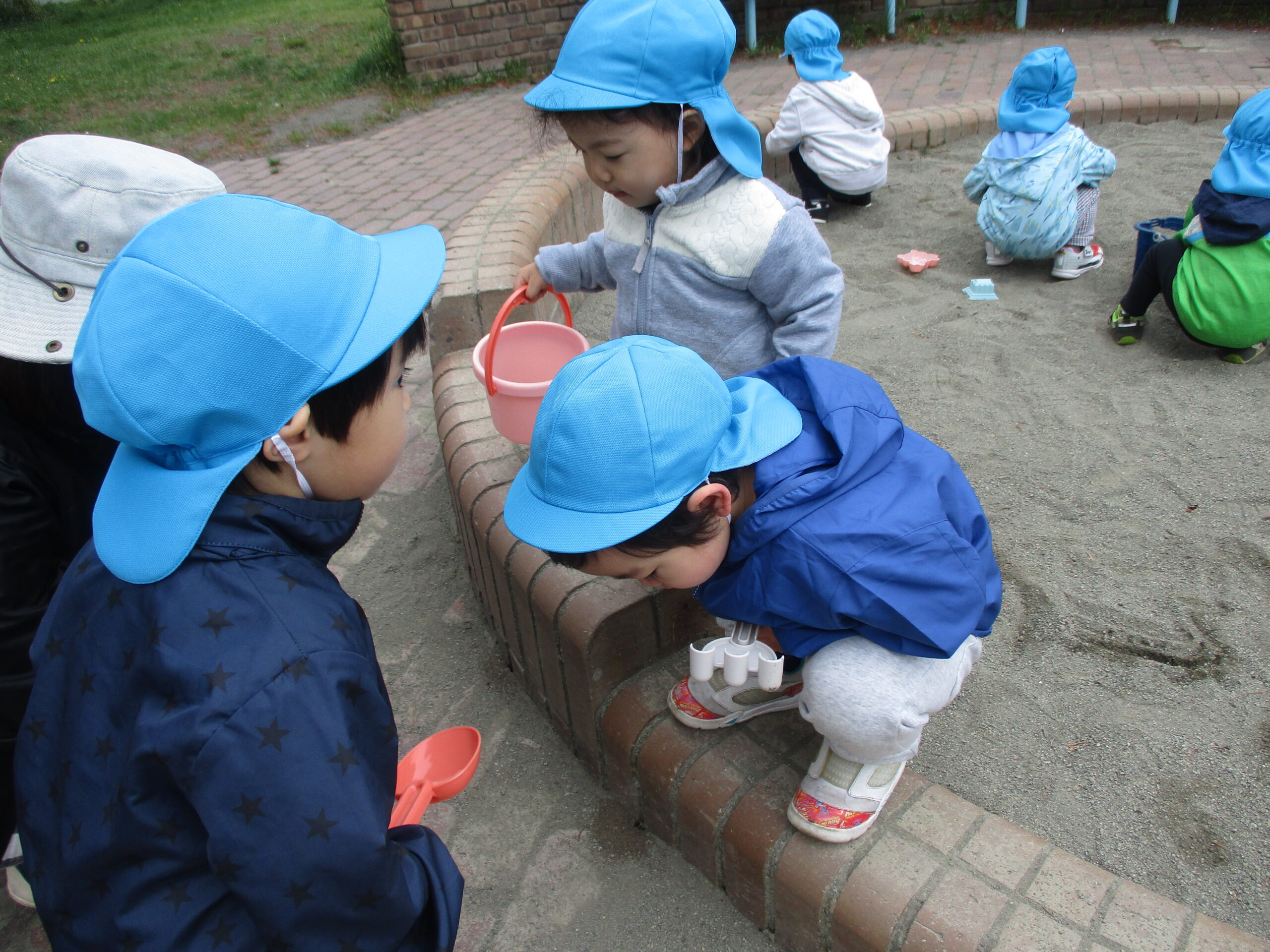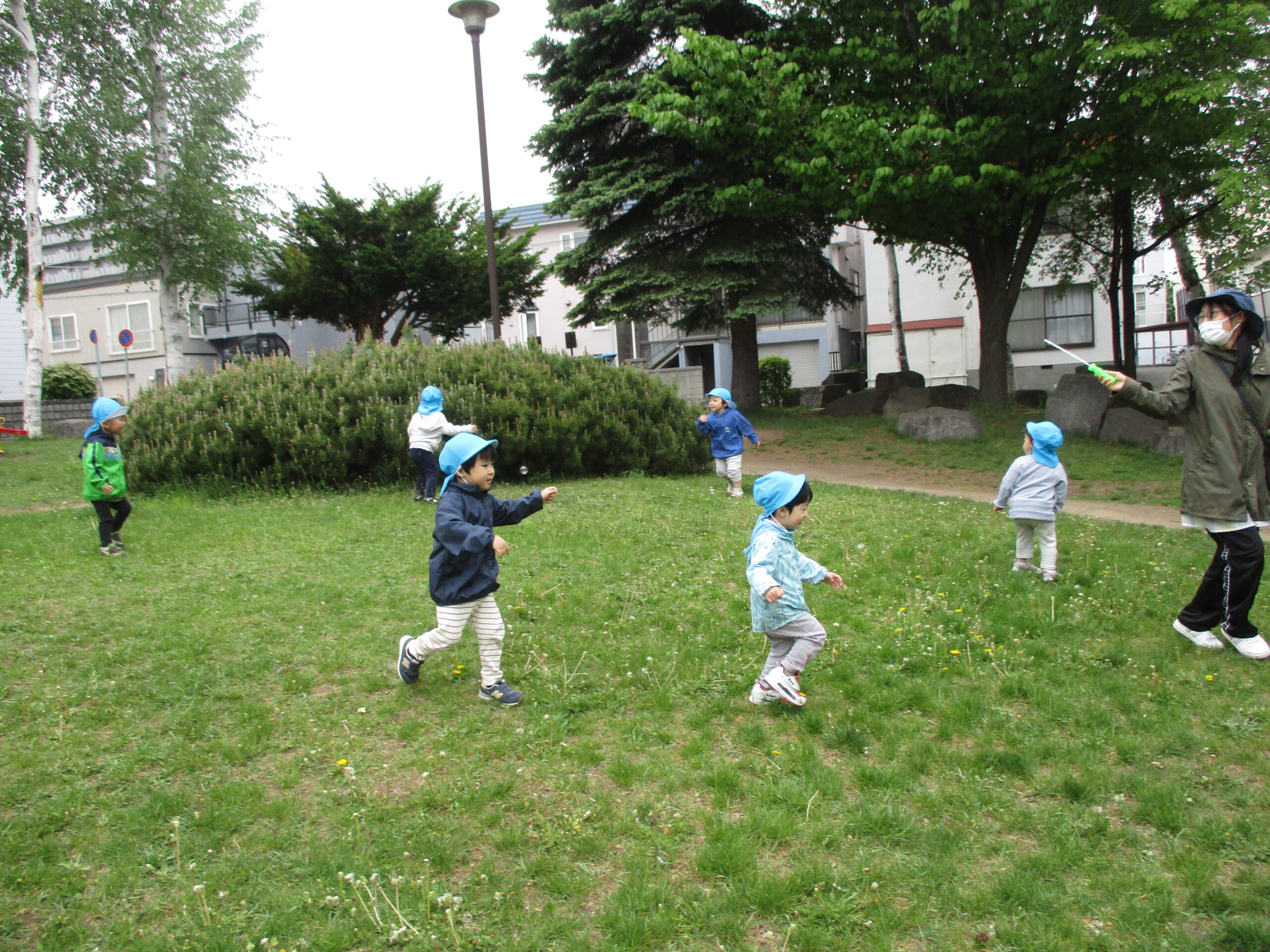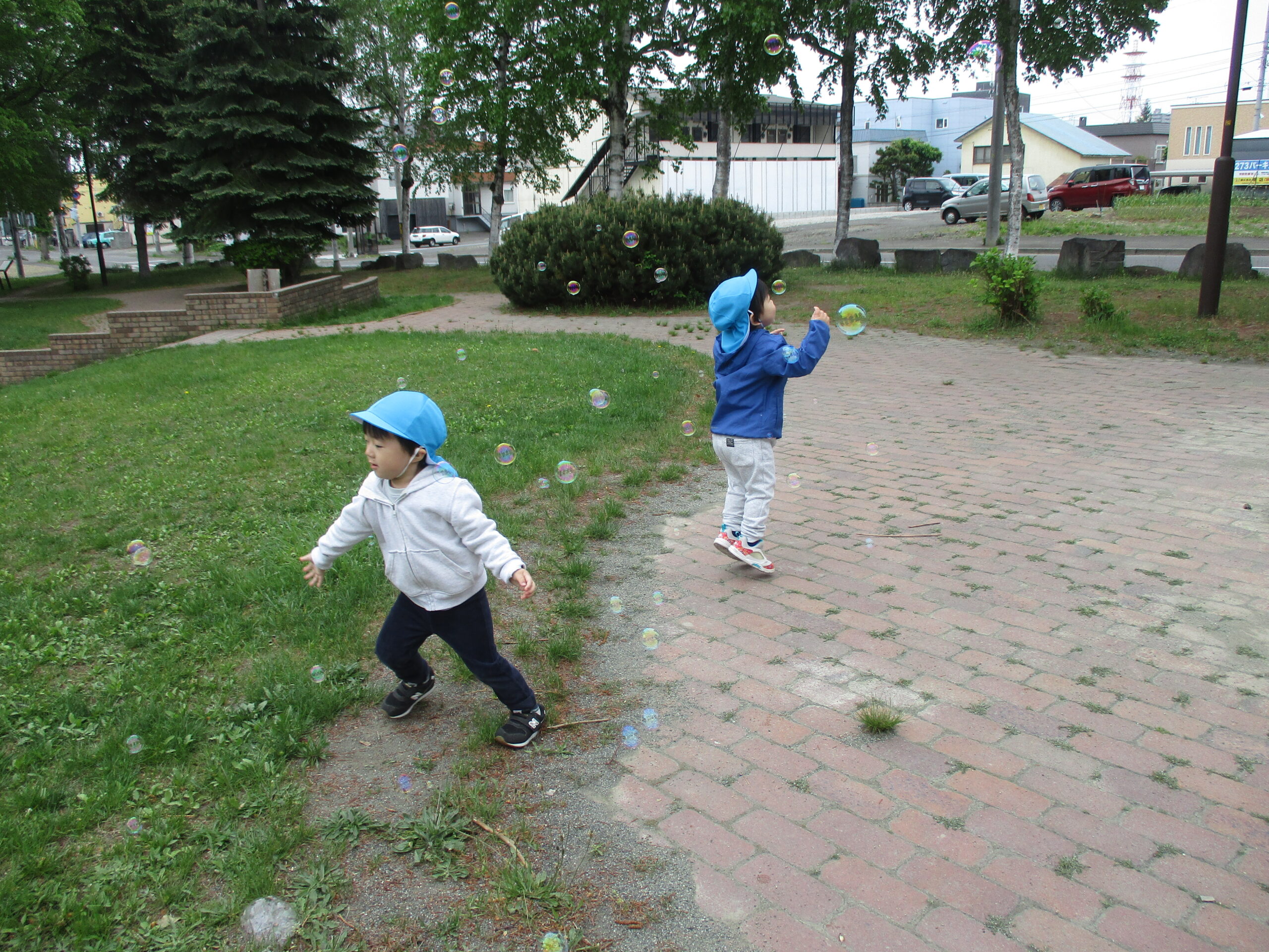 公園では、シャボン玉をしたり、砂遊びをして遊んだり、広場を皆で走りまわったりして、思い切りはしゃいでいましたよ。