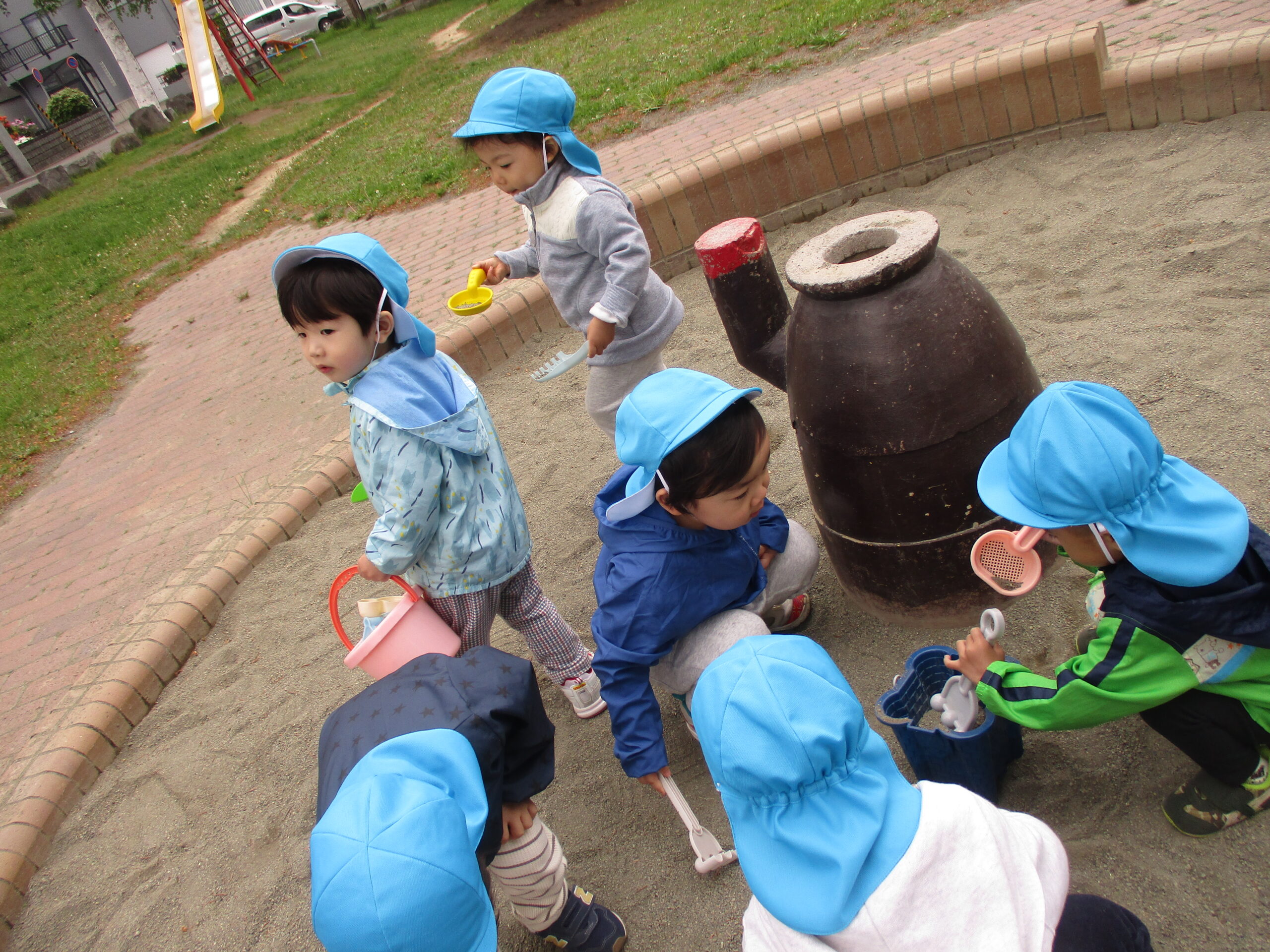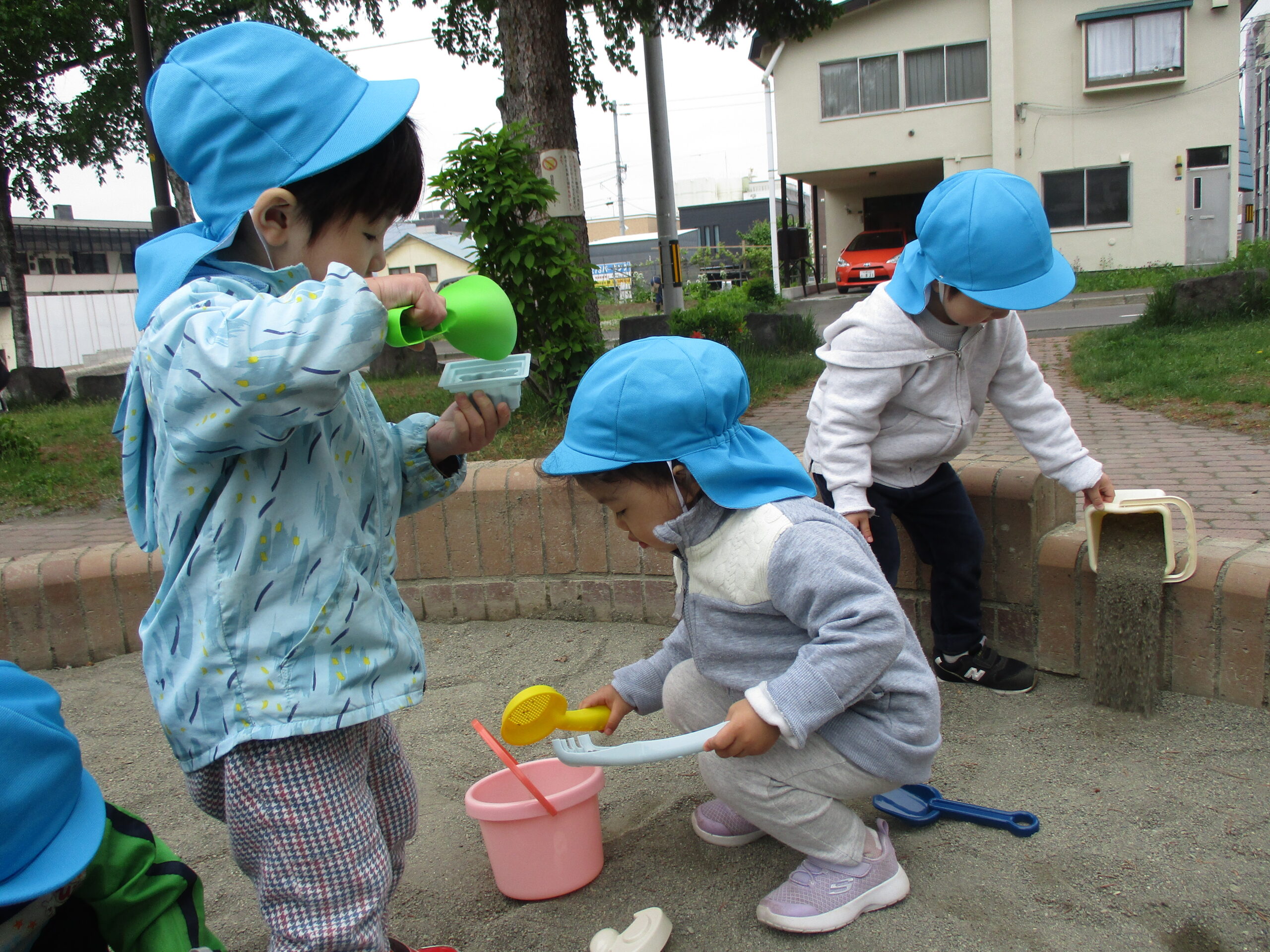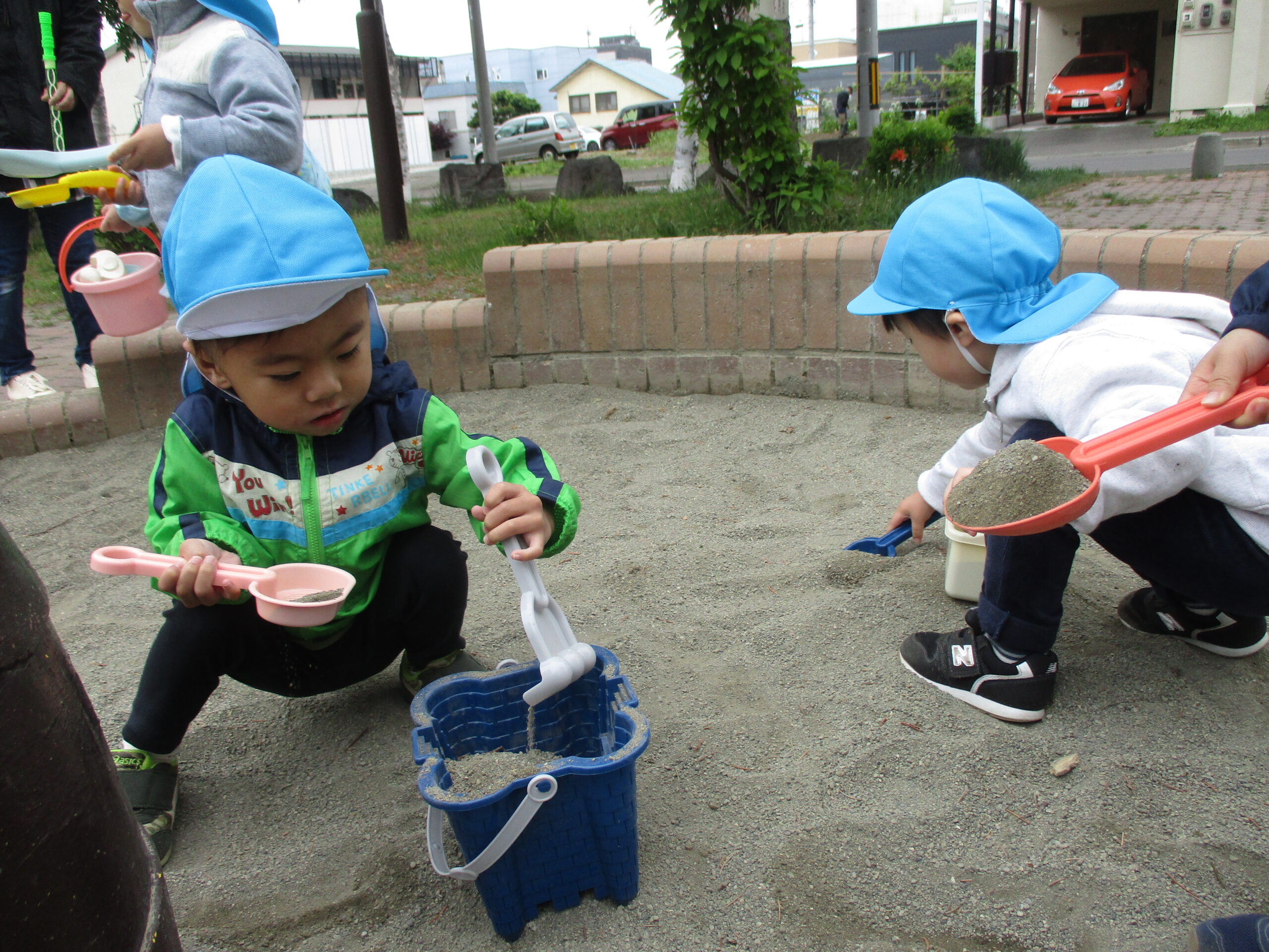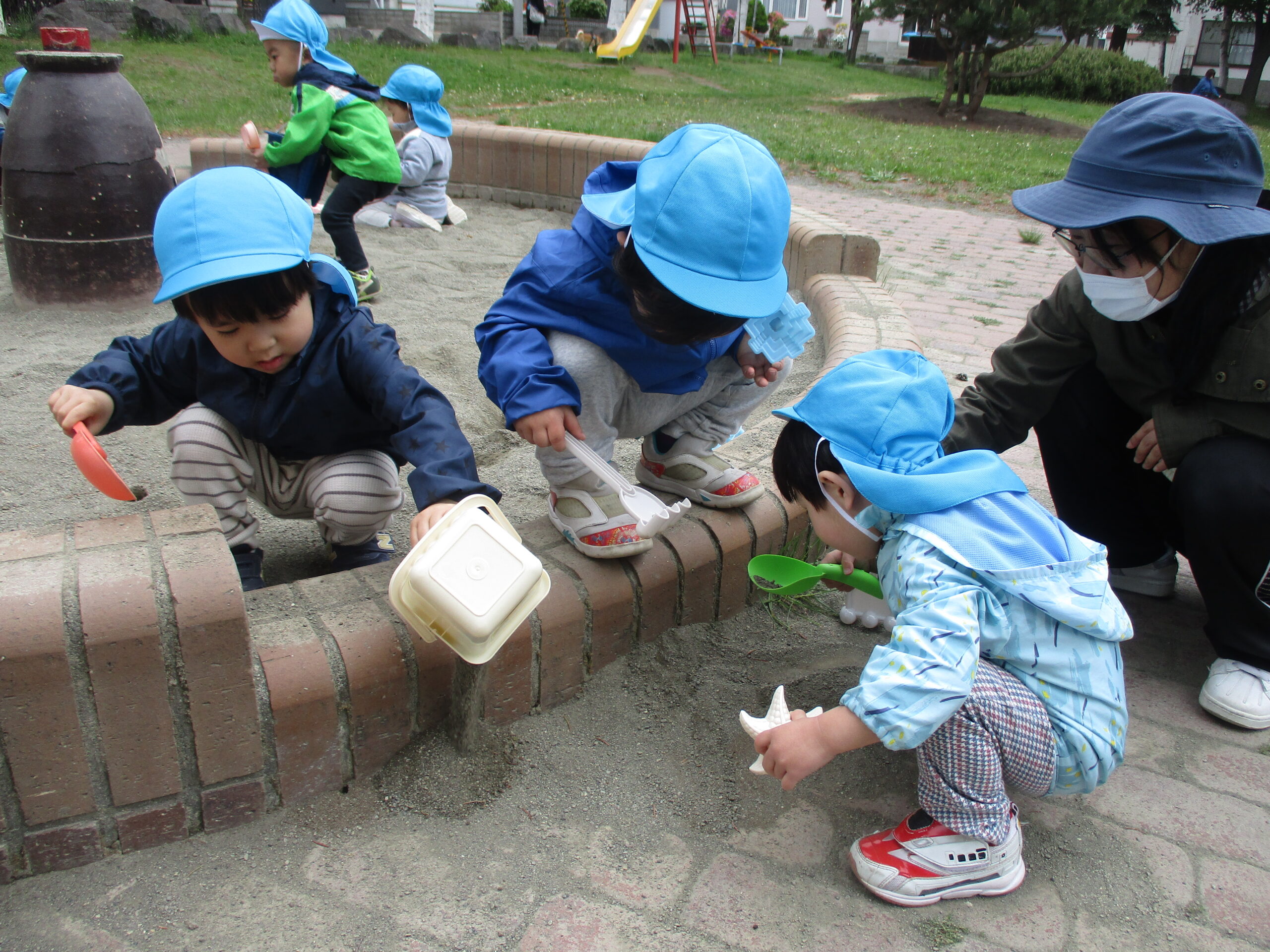 公園では、シャボン玉をしたり、砂遊びをして遊んだり、広場を皆で走りまわったりして、思い切りはしゃいでいましたよ。