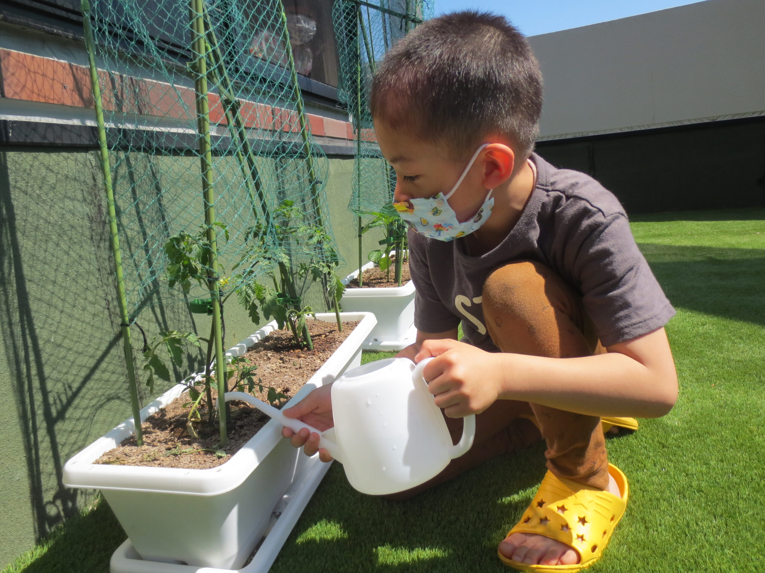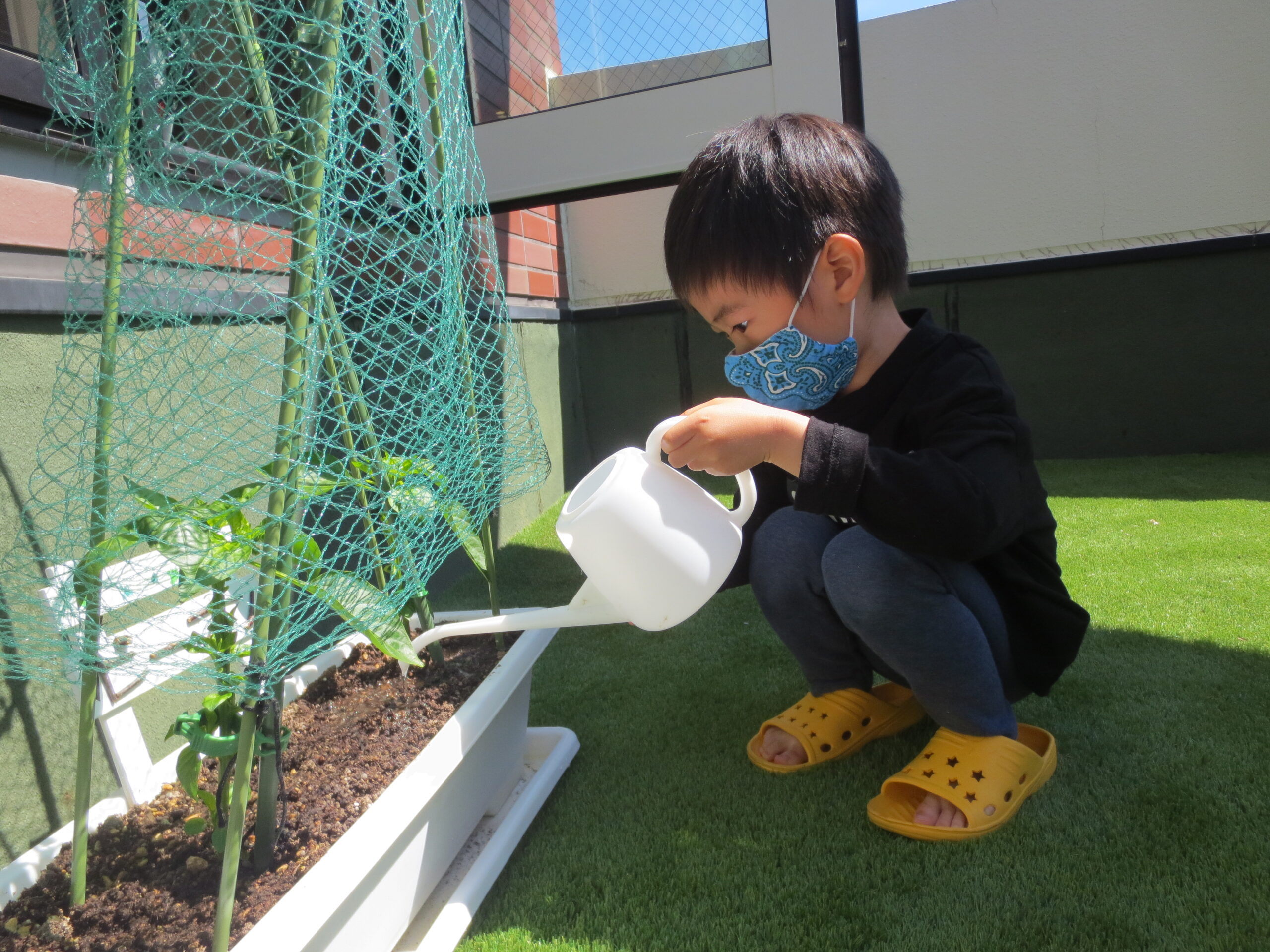 テラスに出ると「お花咲いたかな~?」「ミニトマトできたかな~?」とお友だちと話しながら観察をしています。