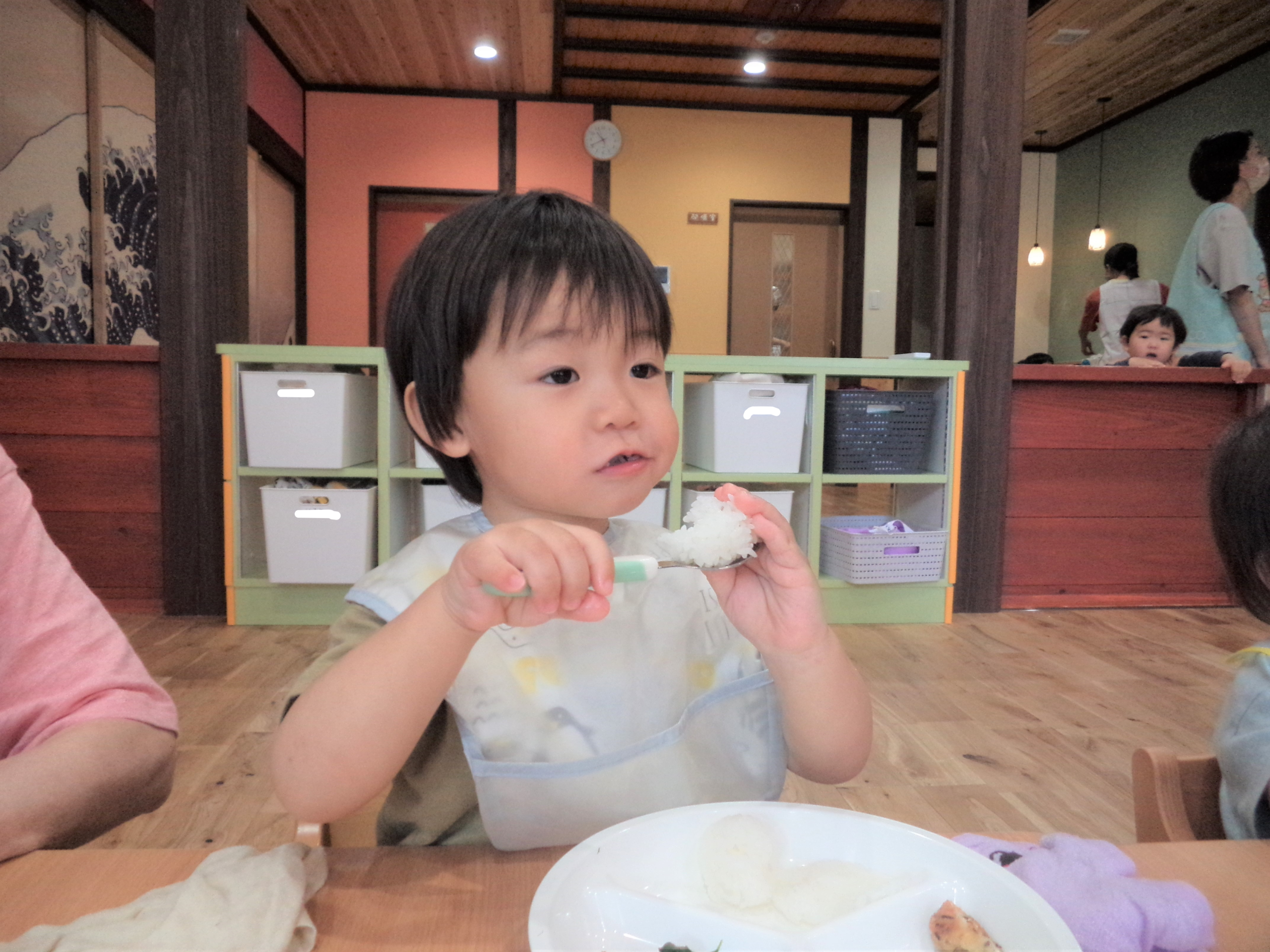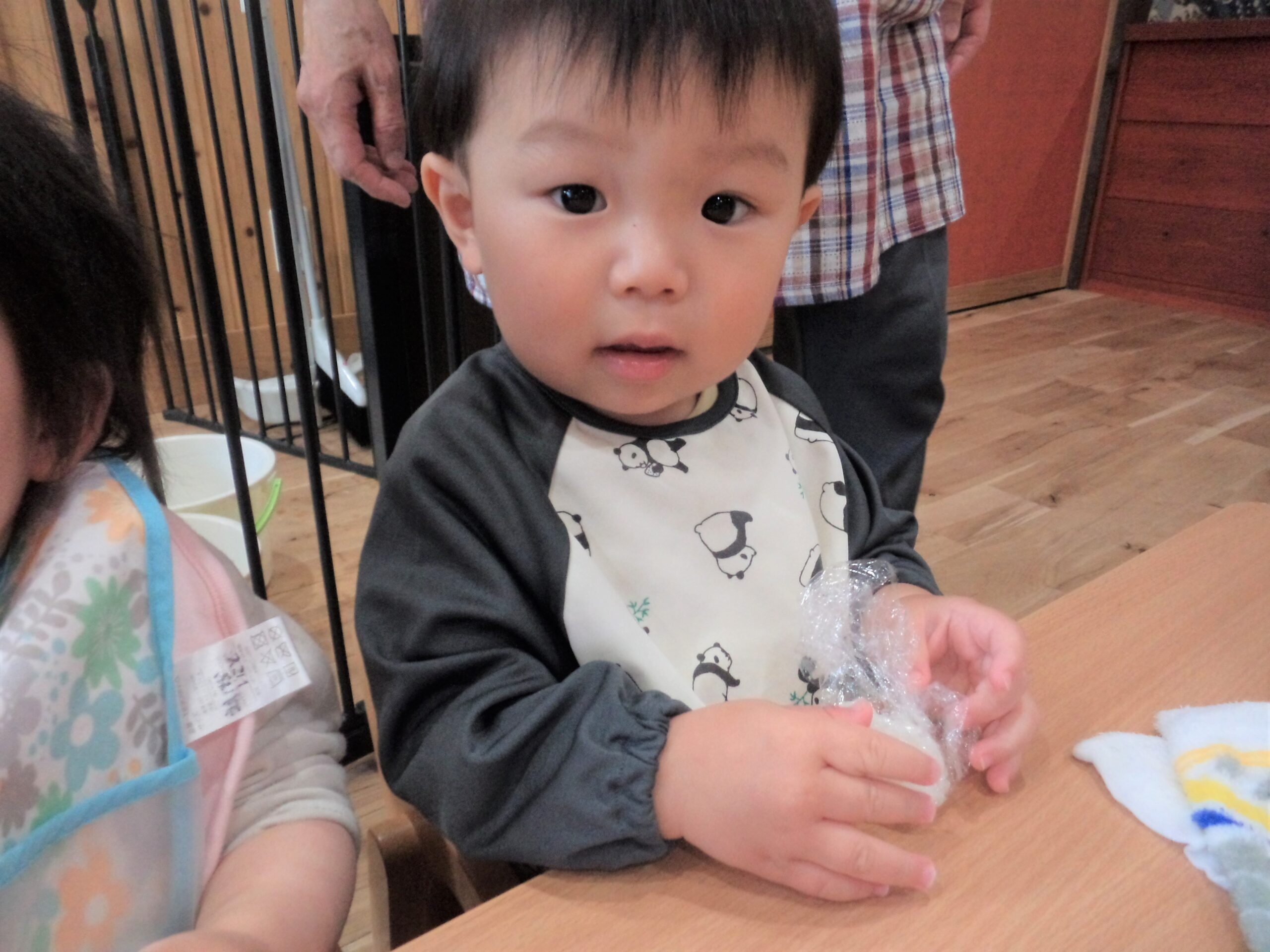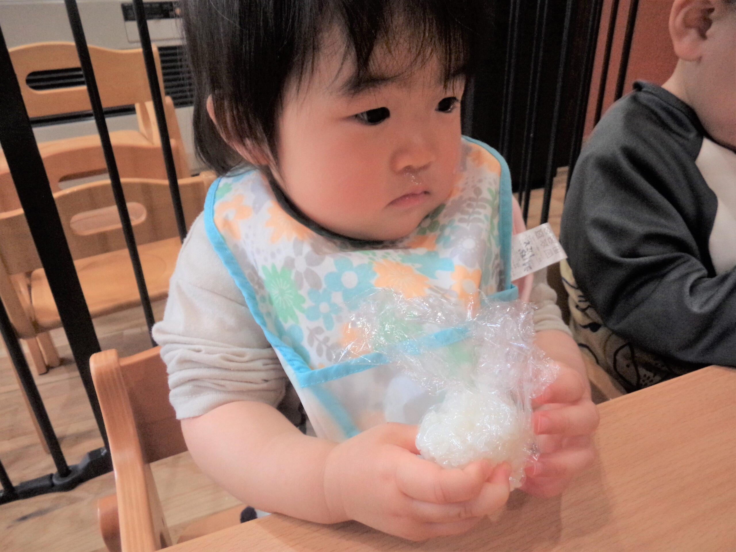 ラップにくるまれたご飯を見て、不思議そうでしたが、