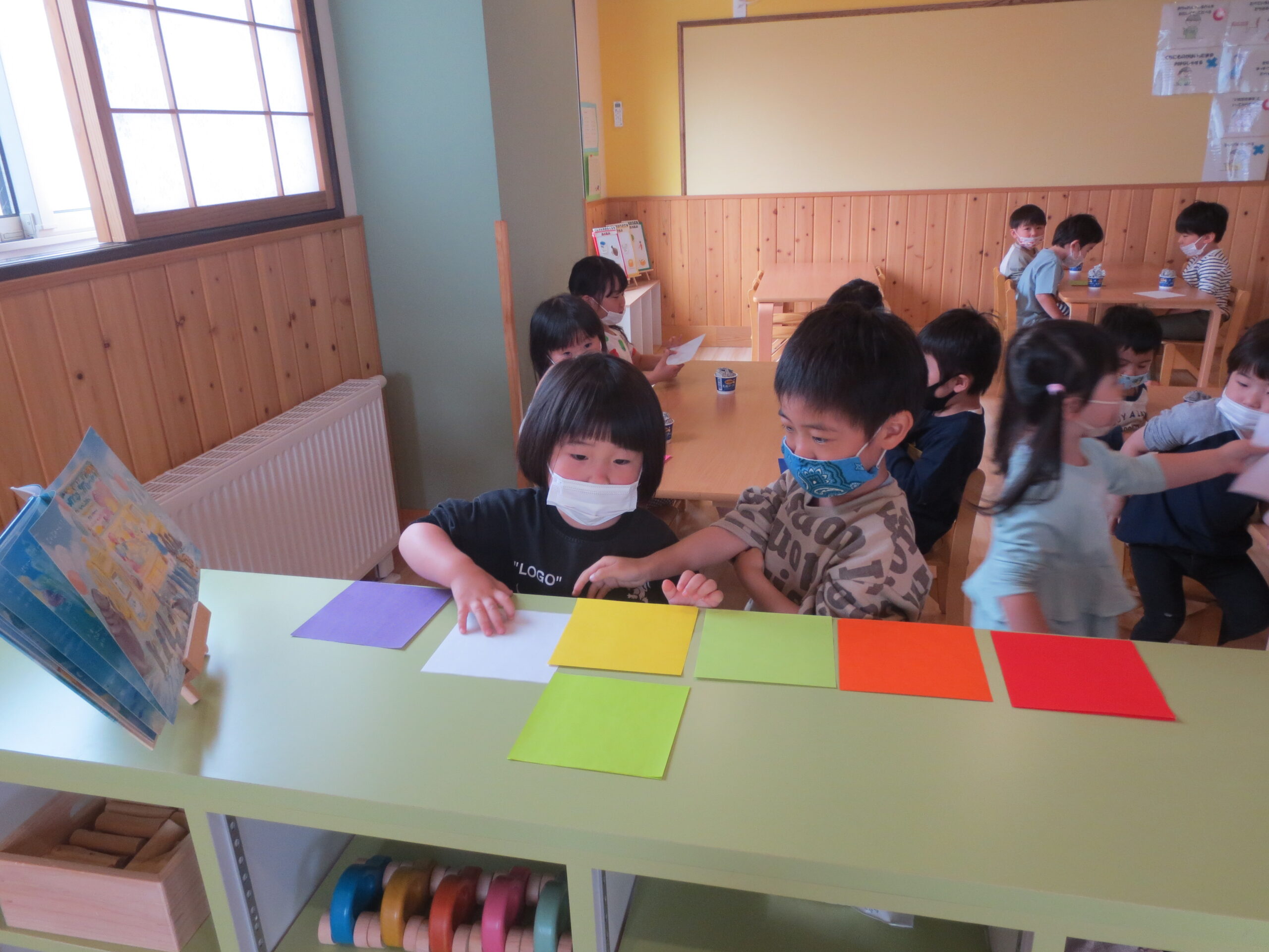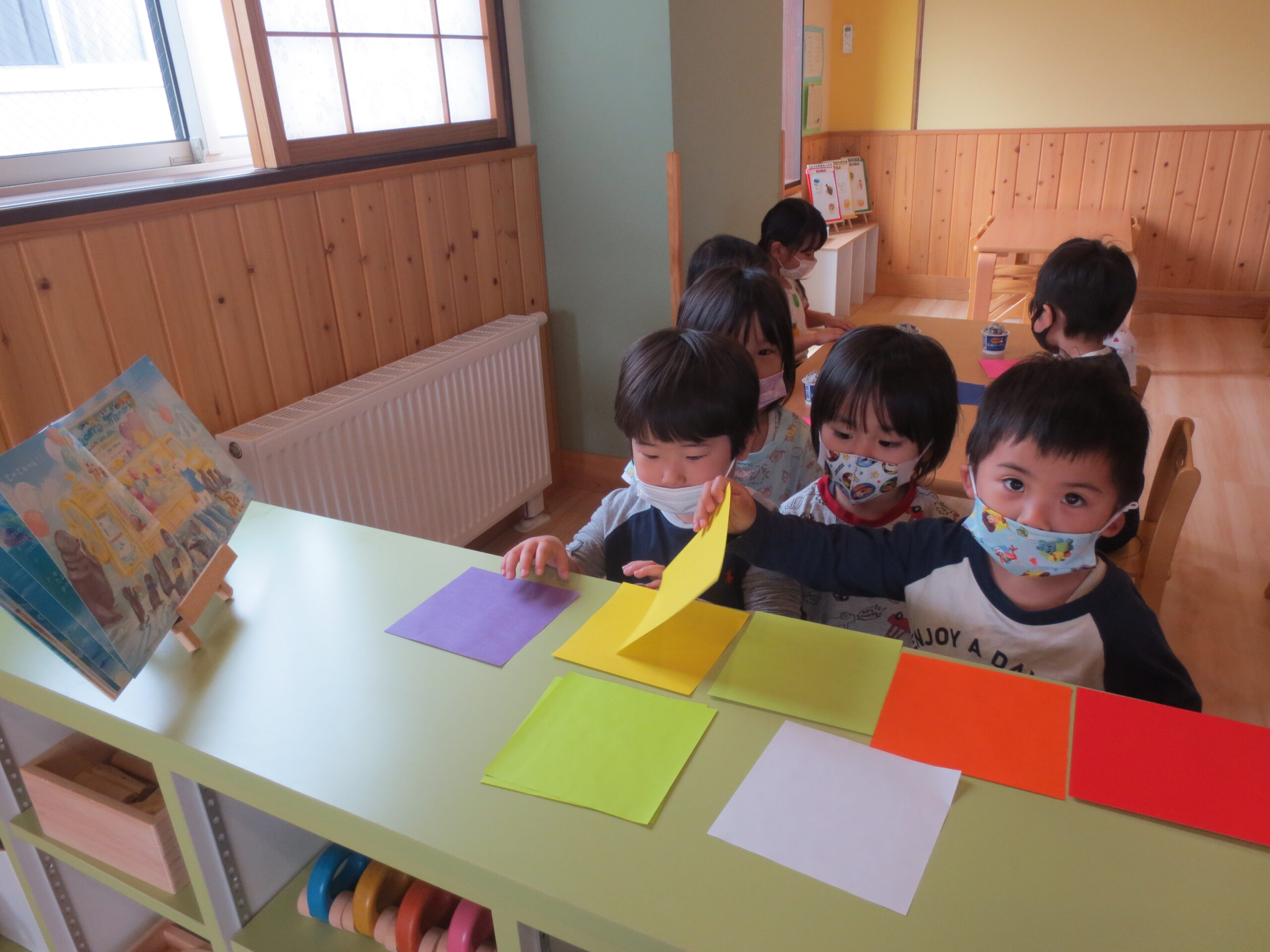 それぞれ何味のアイスにするかをイメージしながら好きな色の折り紙を選びます。