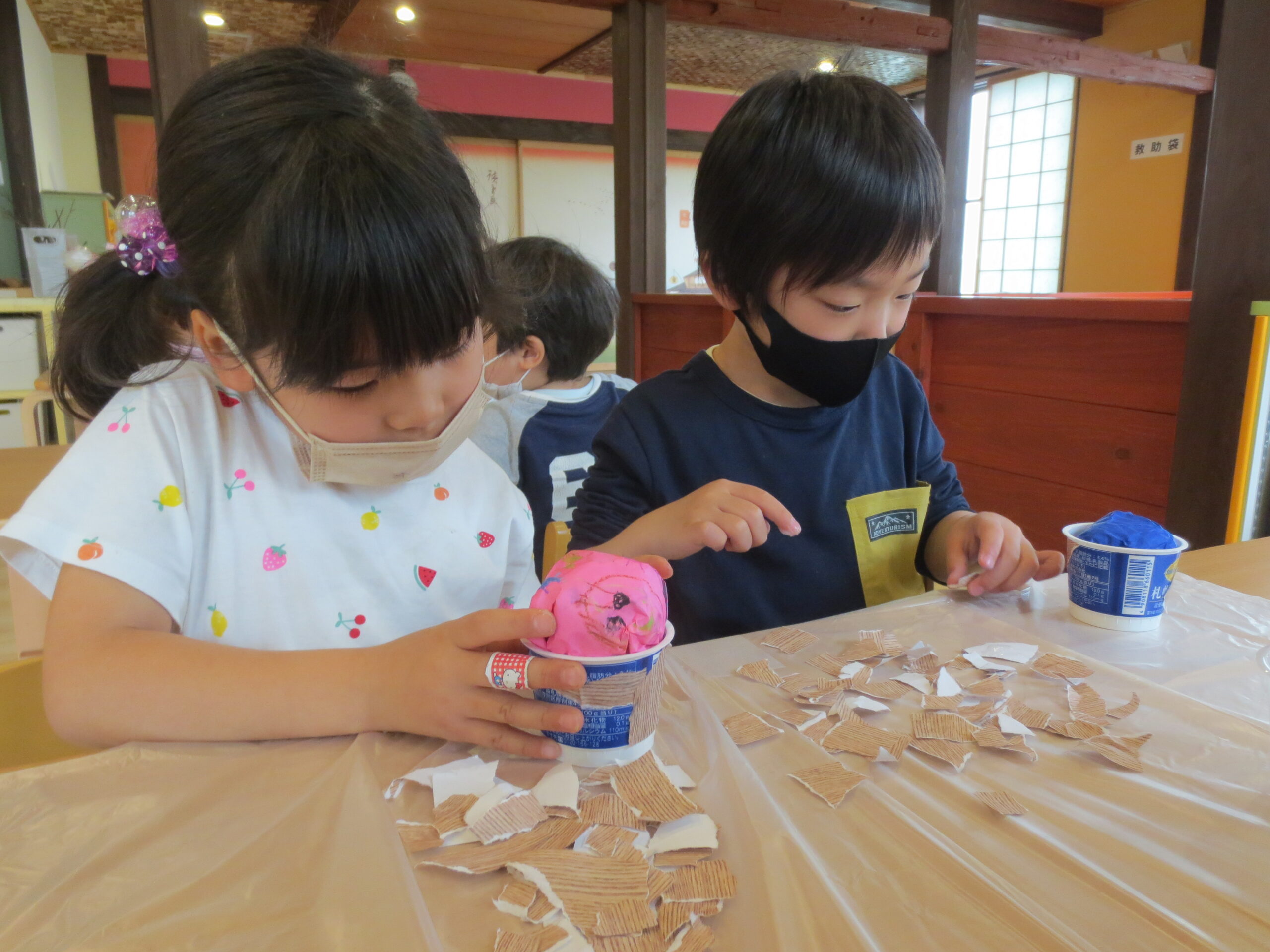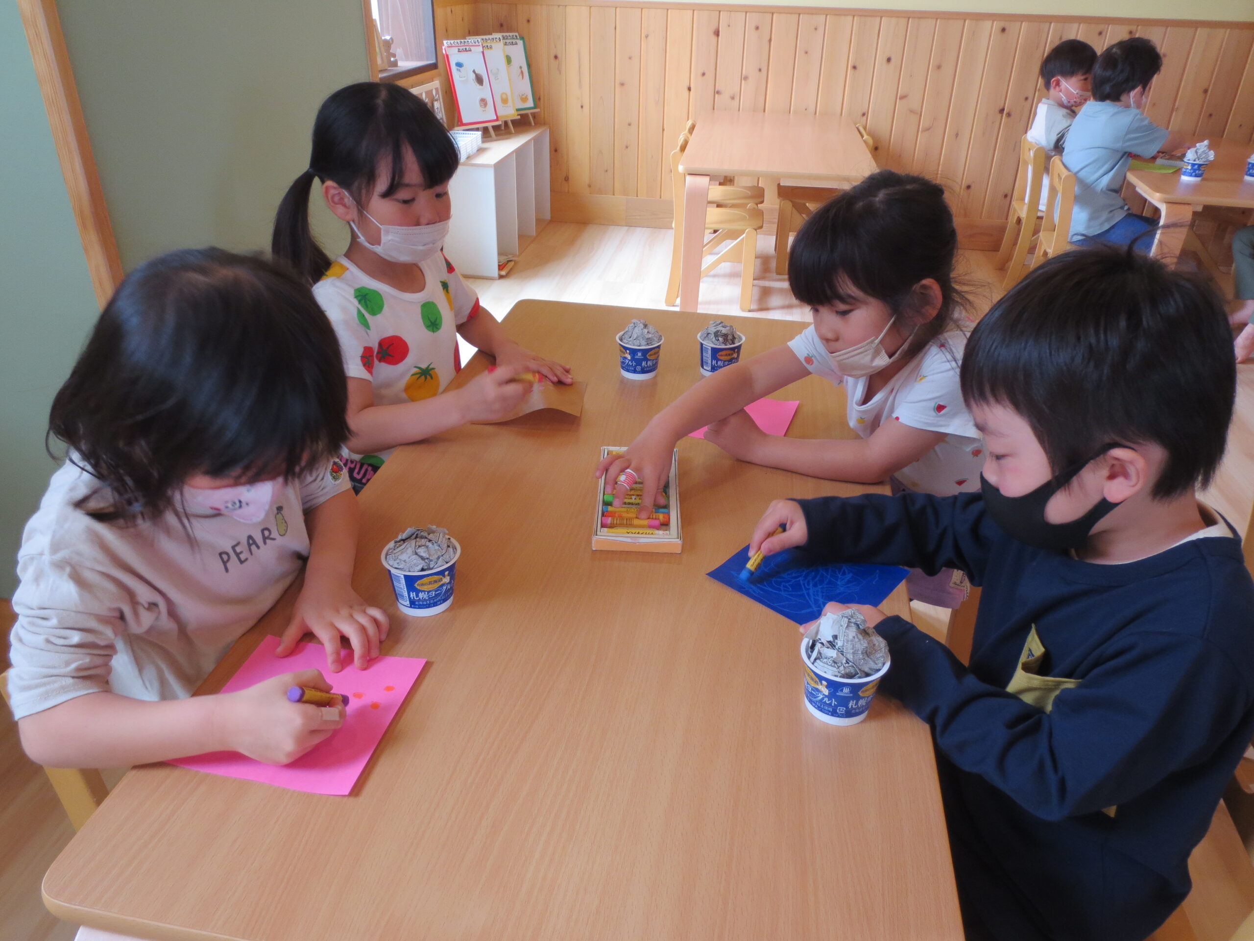 そこで・・・新聞紙と折り紙を用意すると、「これでアイス作ろう💗」と子どもたちの目はキラキラしていました!