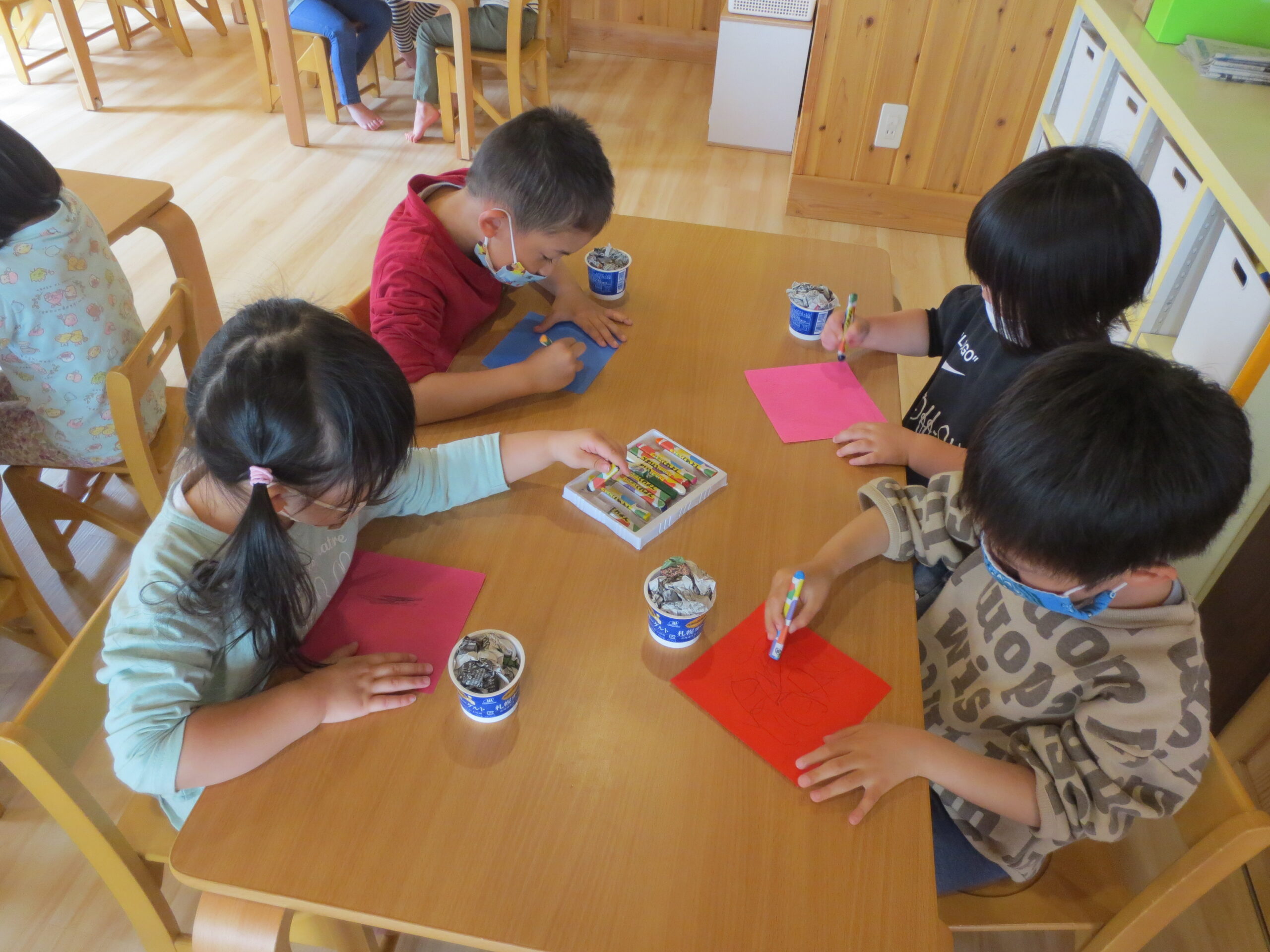 新聞紙を丸めてアイスの形にした後は、選んだ折り紙にクレヨンでアイスのトッピングを描いていきます!