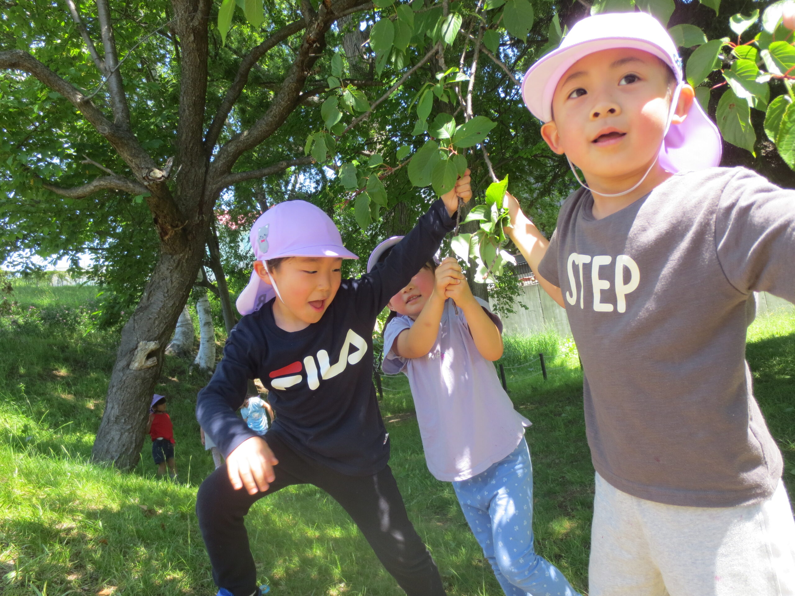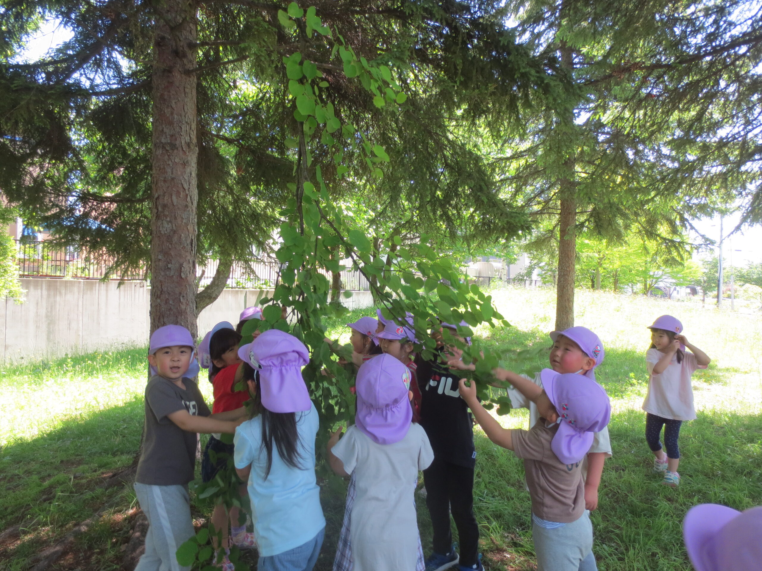 今日は、ももぐみ・さくらぐみ・かえでぐみの子どもたちが葉っぱを引っ張ったりぶら下がったりしながらたくさん体を動かして遊んでいました!!