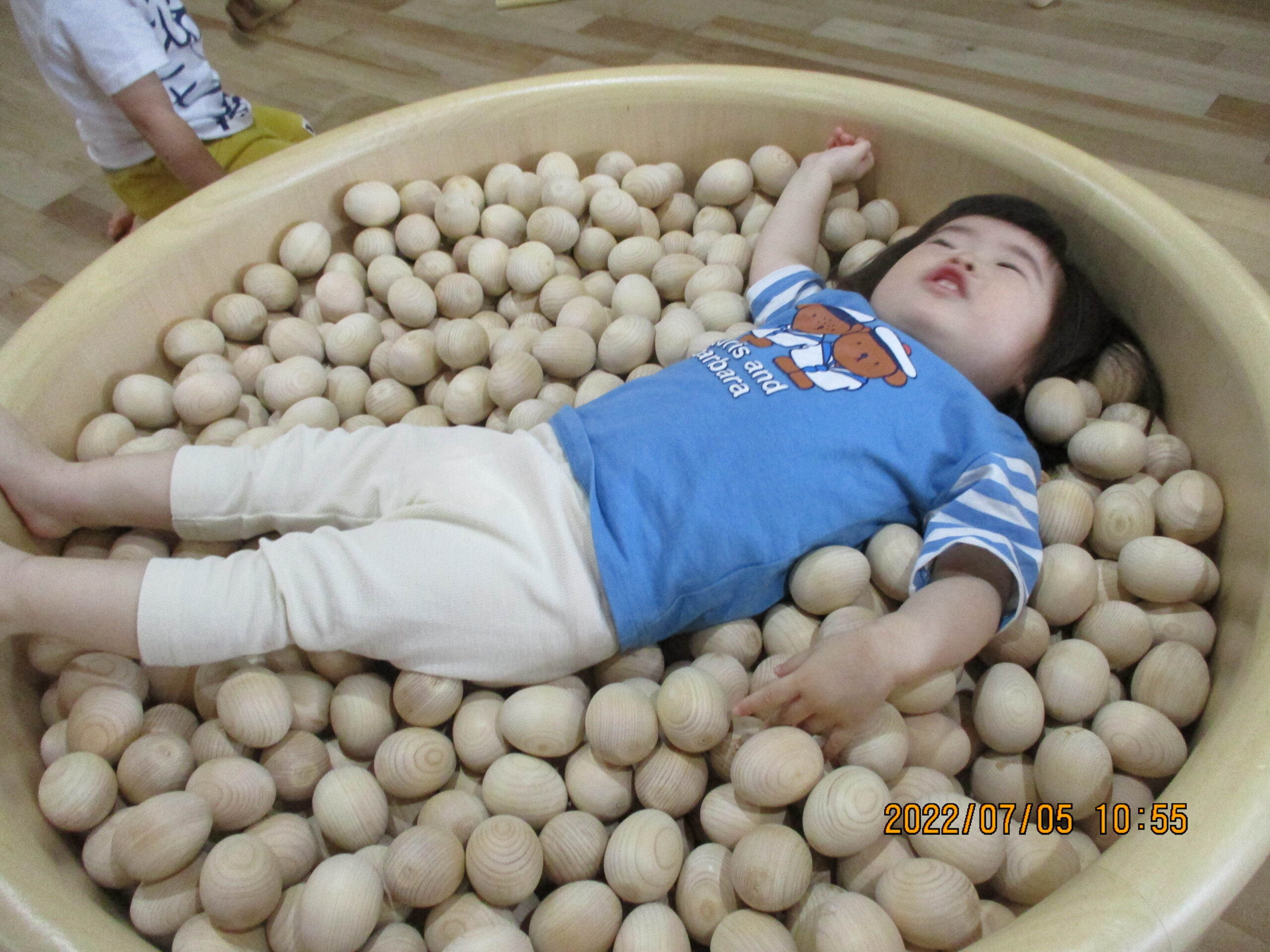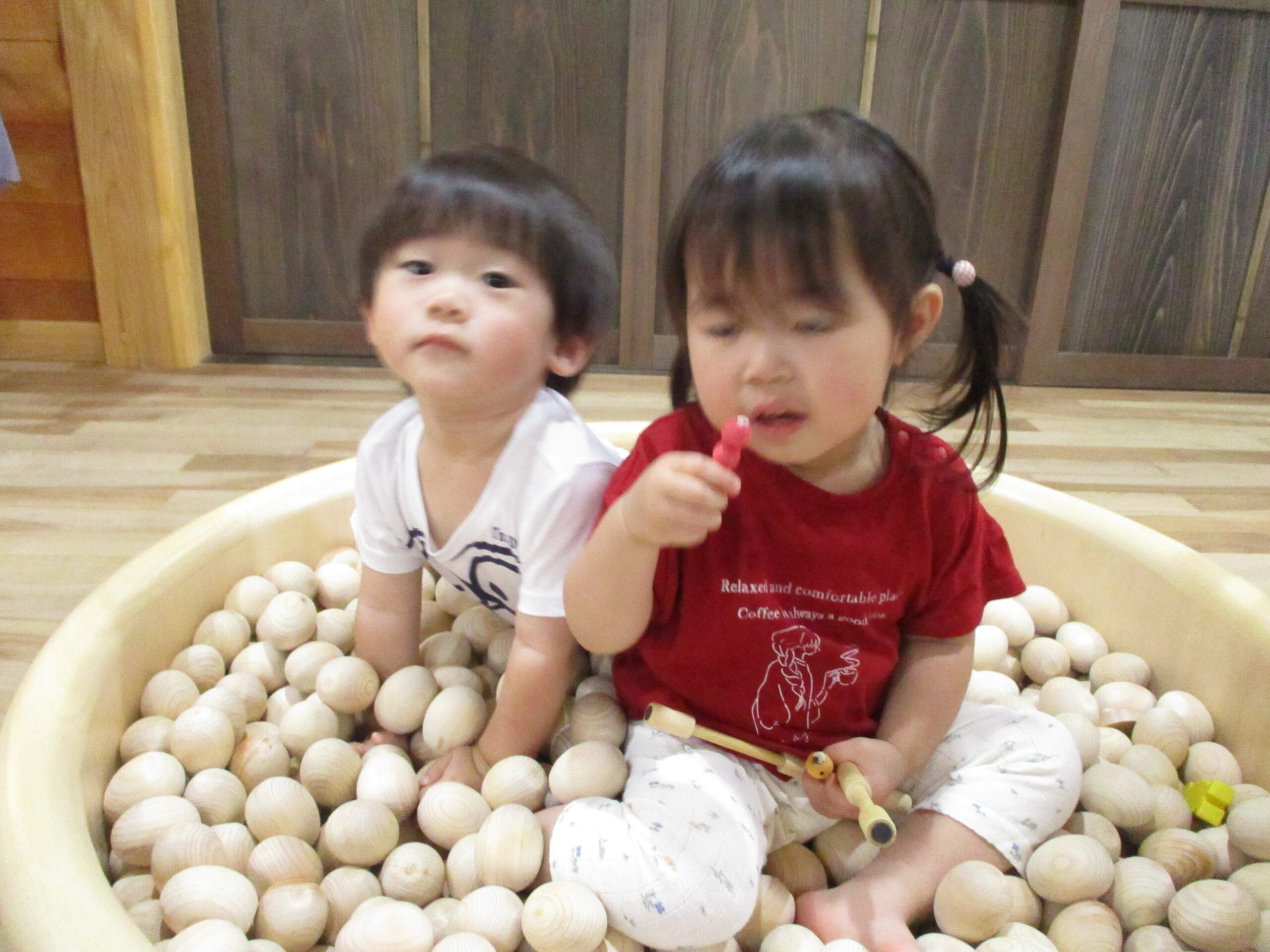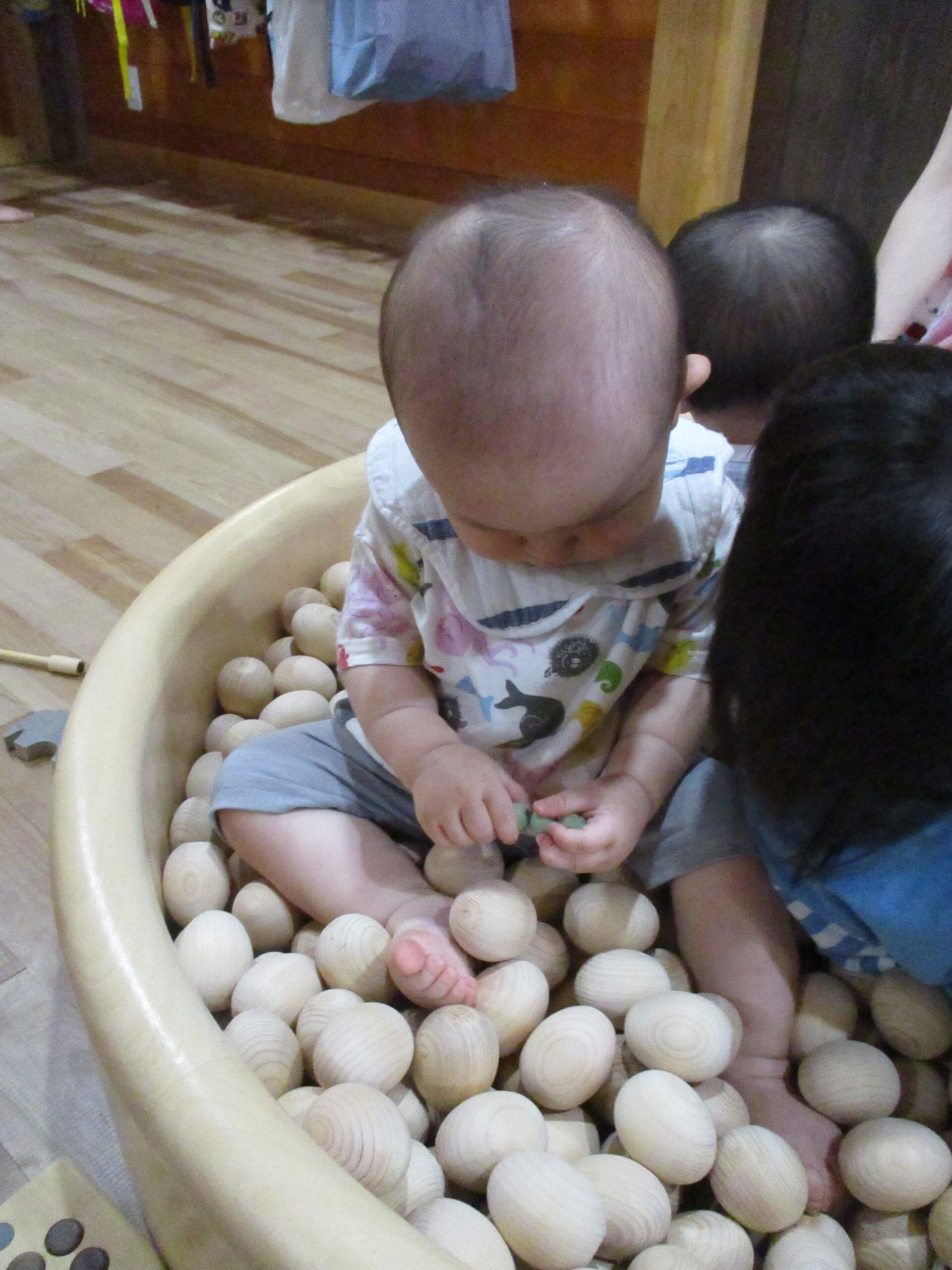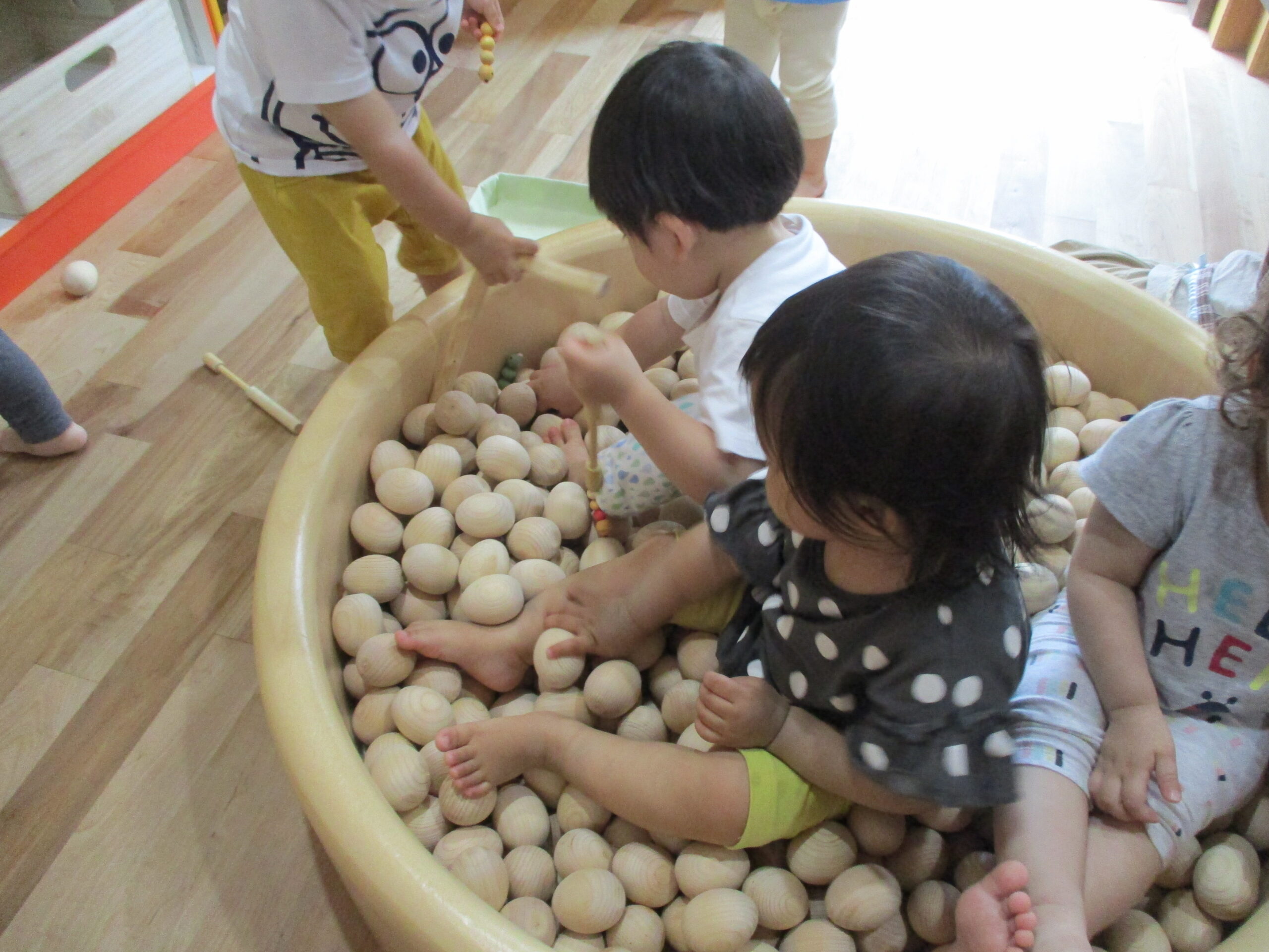 それぞれのクラスで、木の玉のプールで遊んでみました。