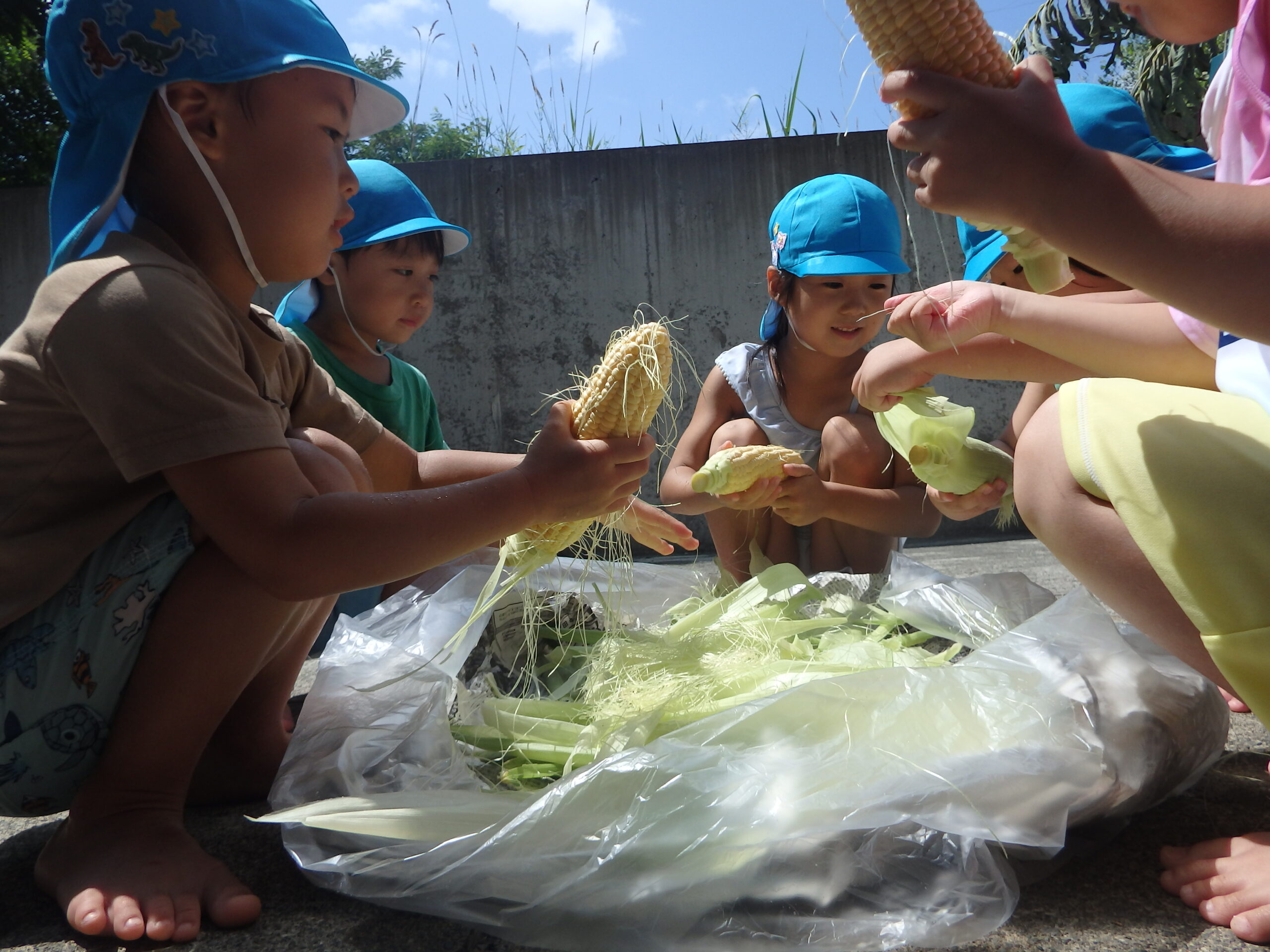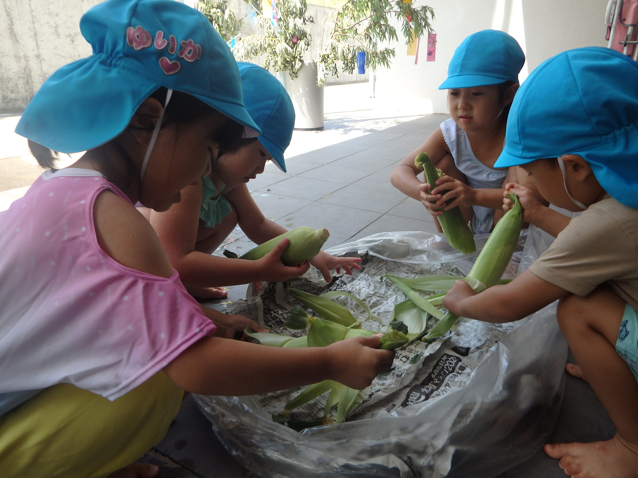 ということで、水遊びの横でトウモロコシの皮むきを幼児クラスにお願いしました。