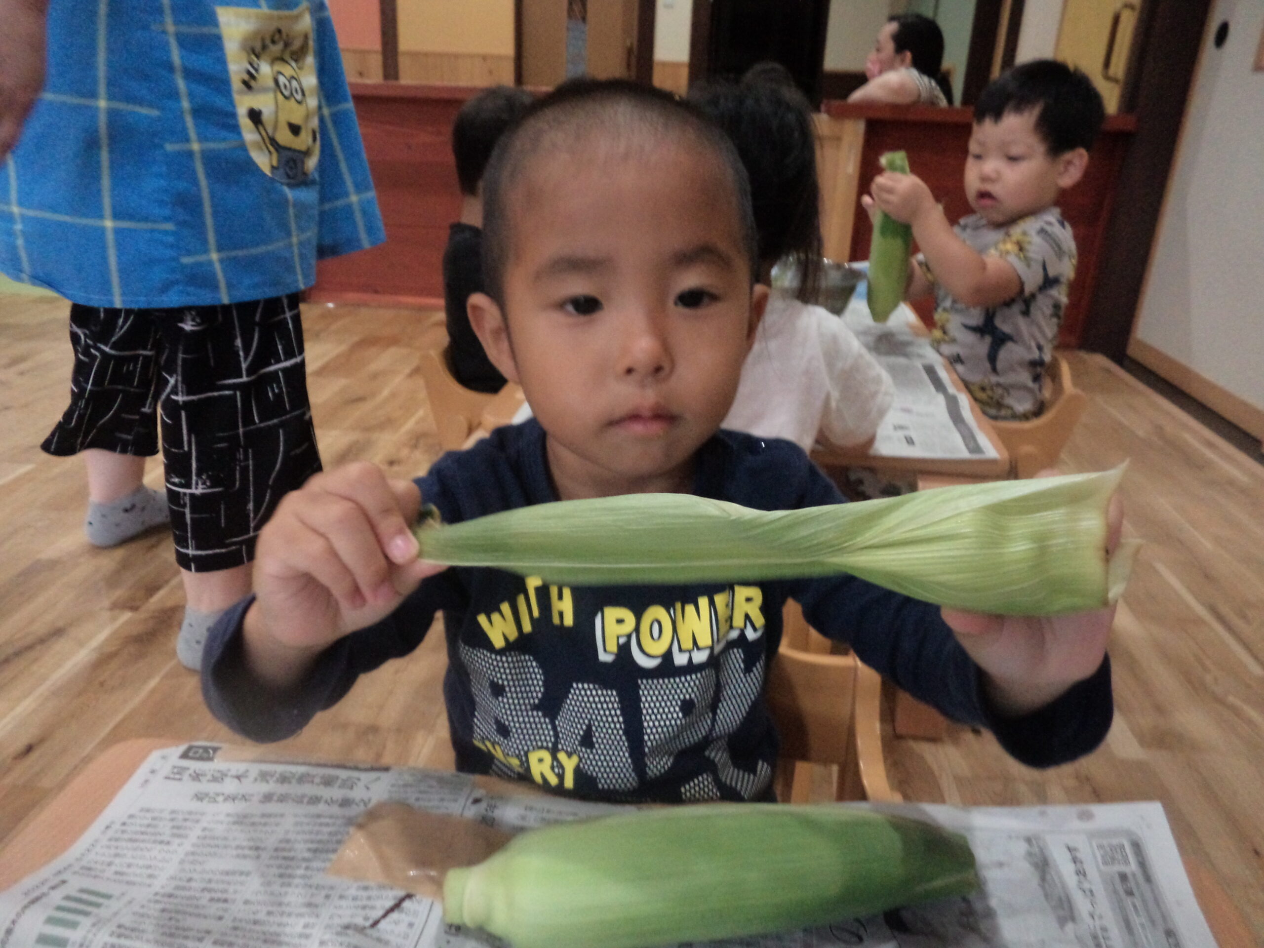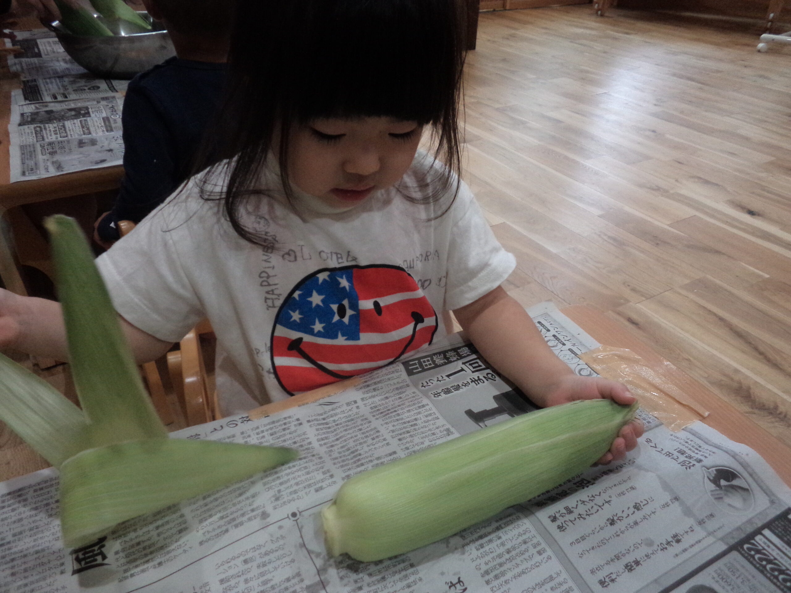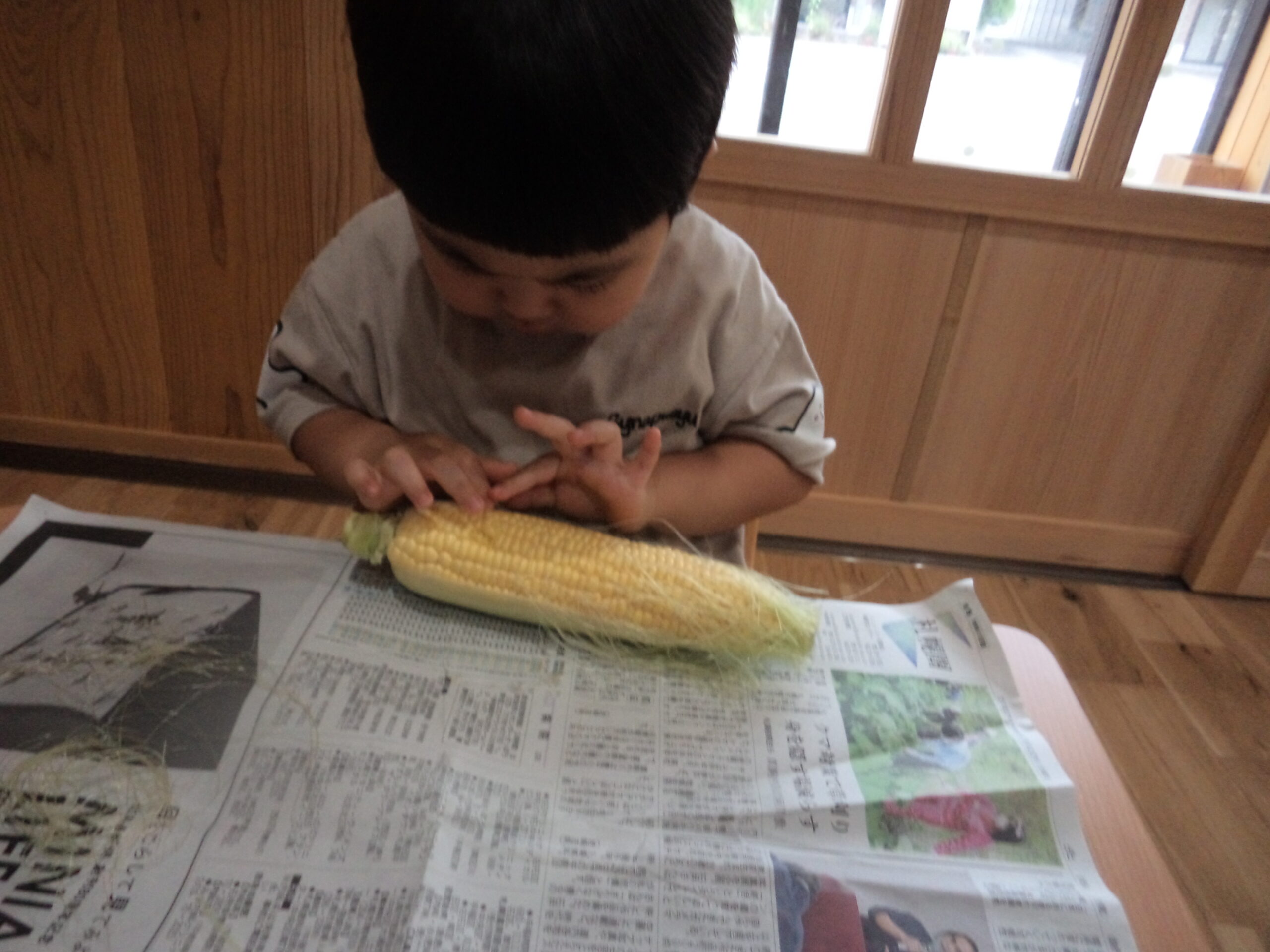 おやつに食べるトウモロコシの皮むきを くるみ組さんにお願いしました!