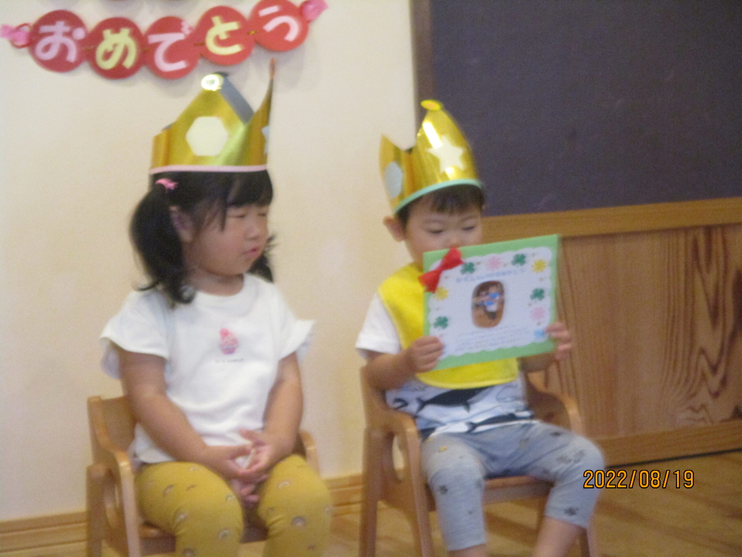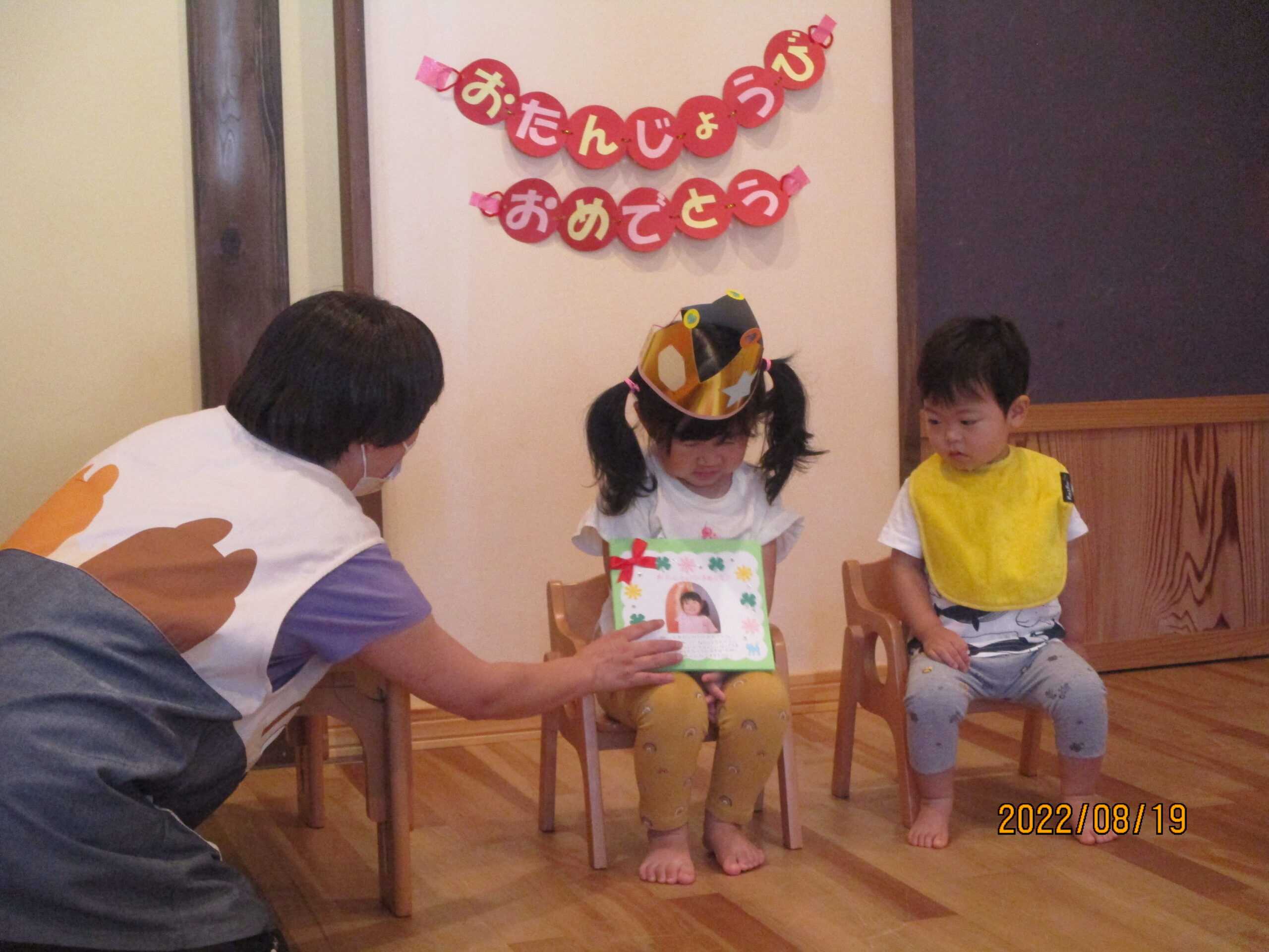 一人ずつお名前を呼ばれると恥ずかしそうに「はい!」とお返事をしている子や元気よく「はい!」とお返事をしている子の姿が見られました。誕生カードを保育士から貰うと嬉しそうに受け取っている様子も見られましたよ。