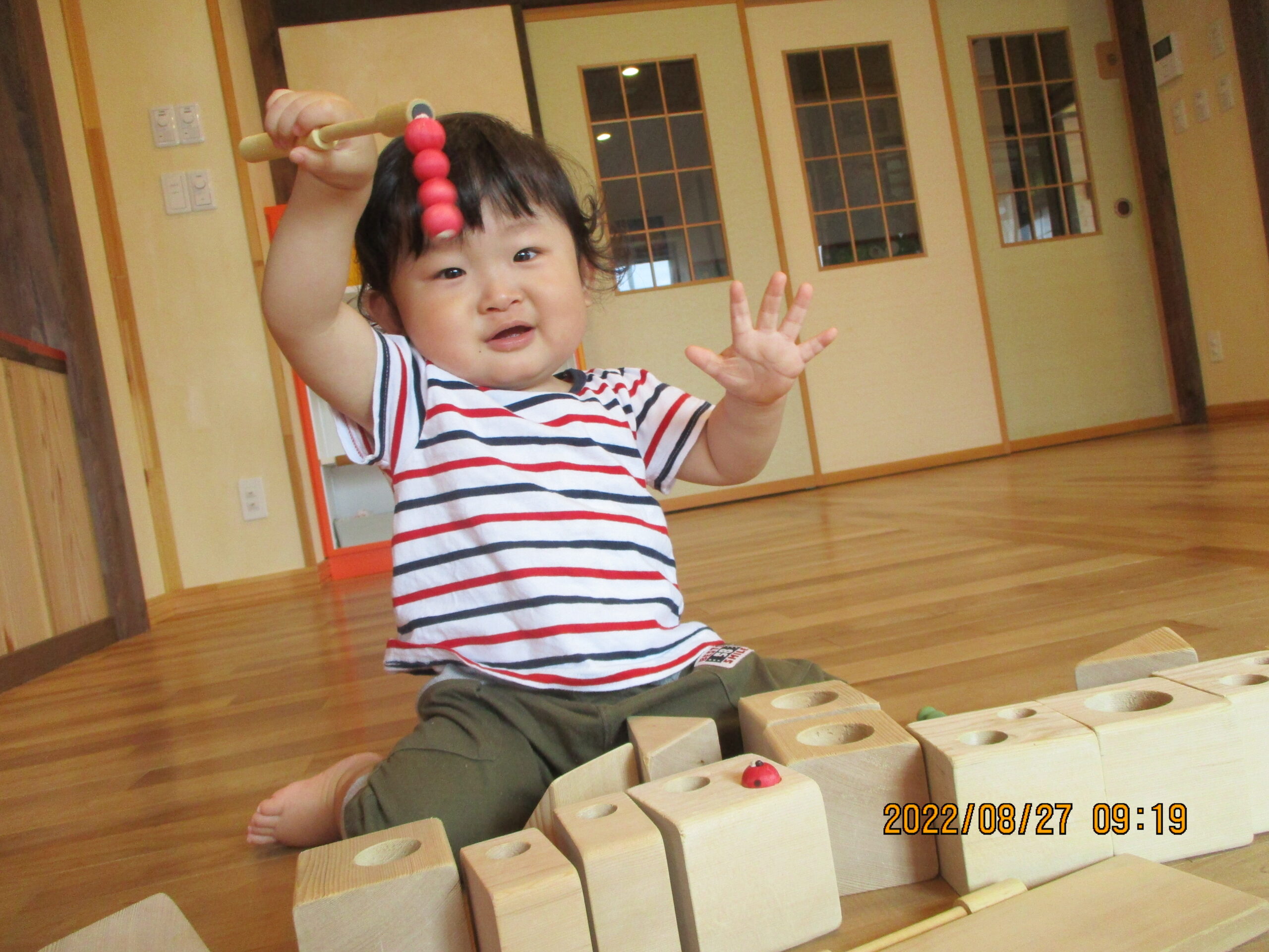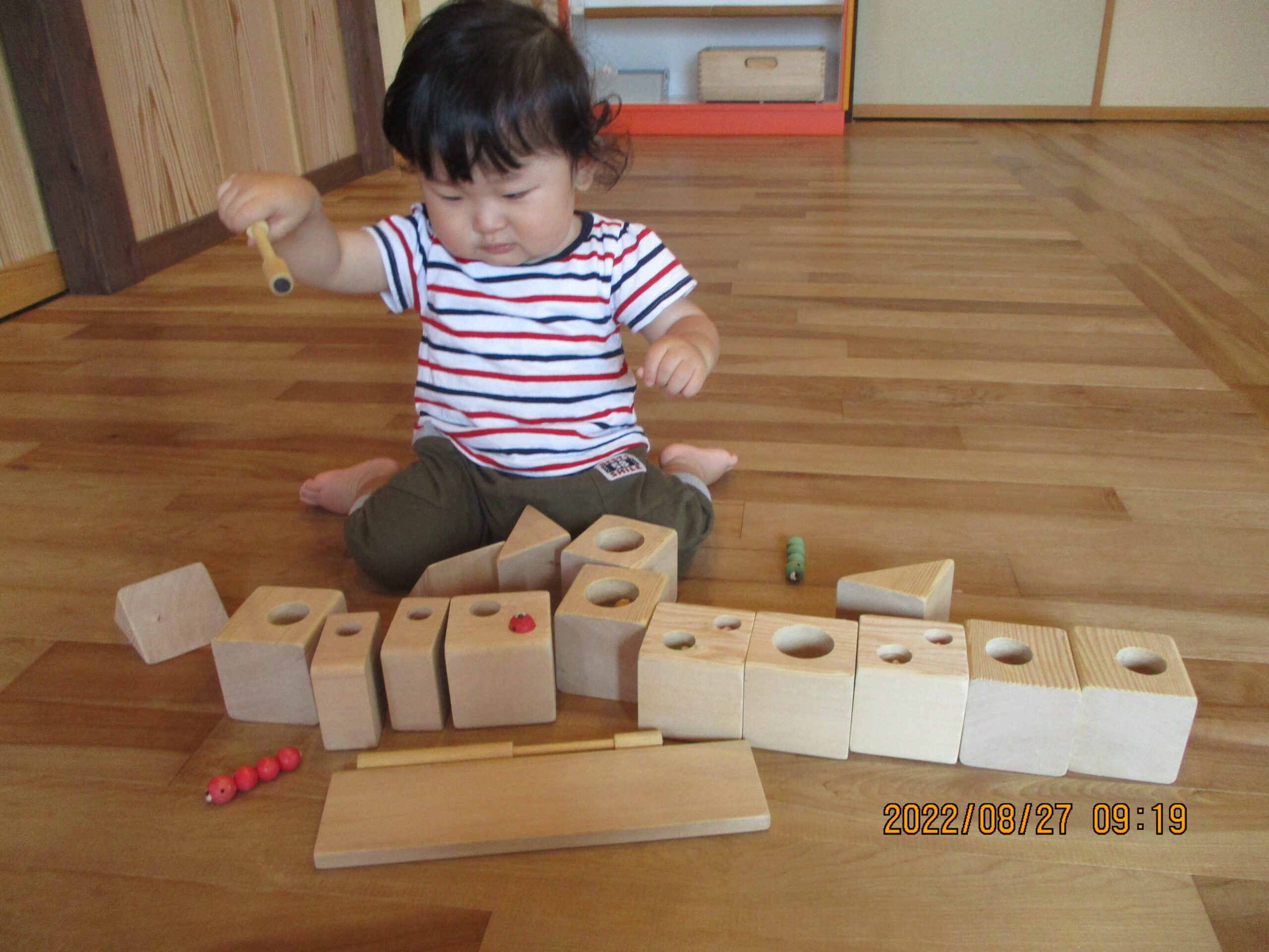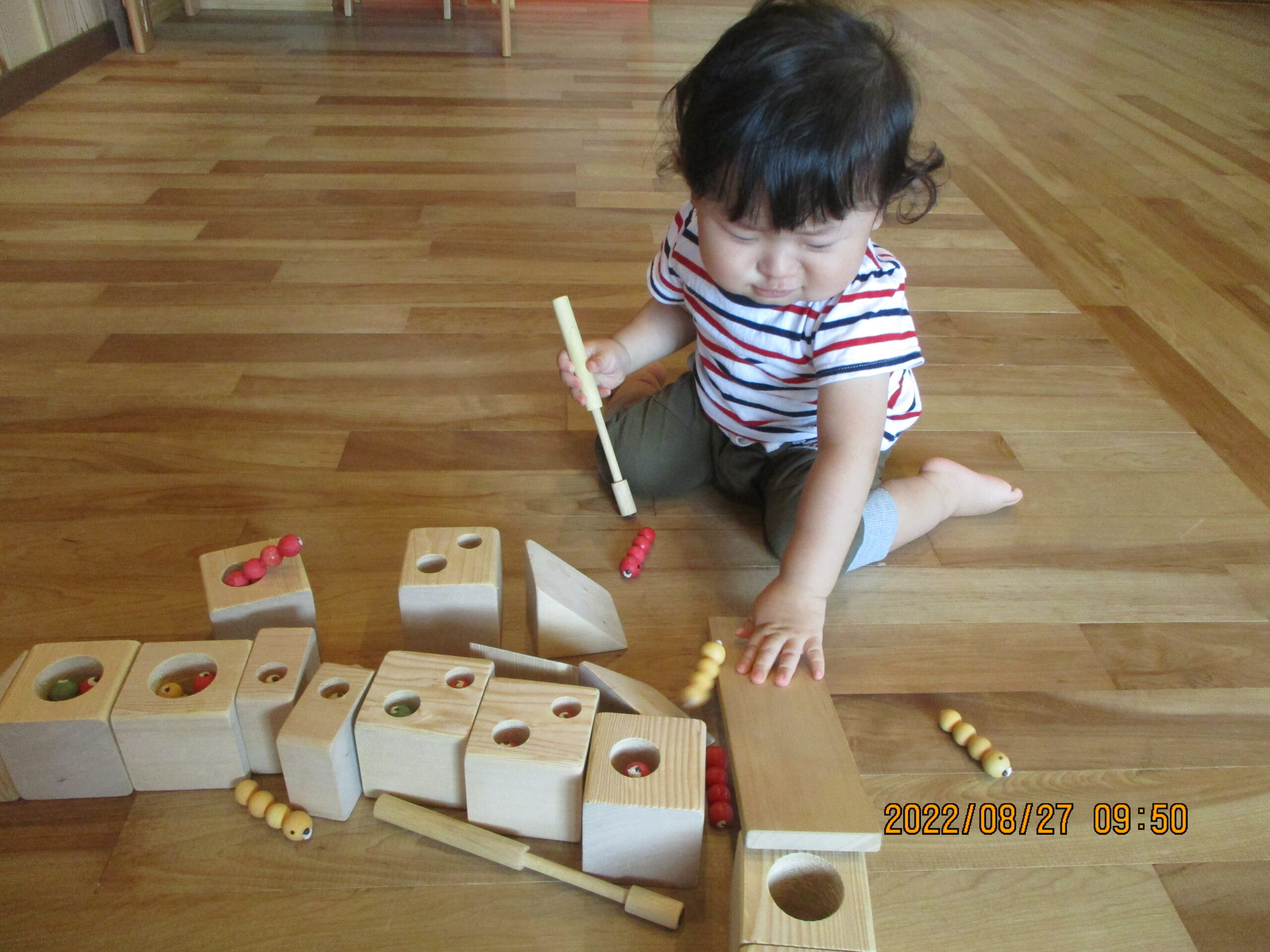 木の積木で滑り台を作ってひっつき虫を滑らせて遊びましたぁ。