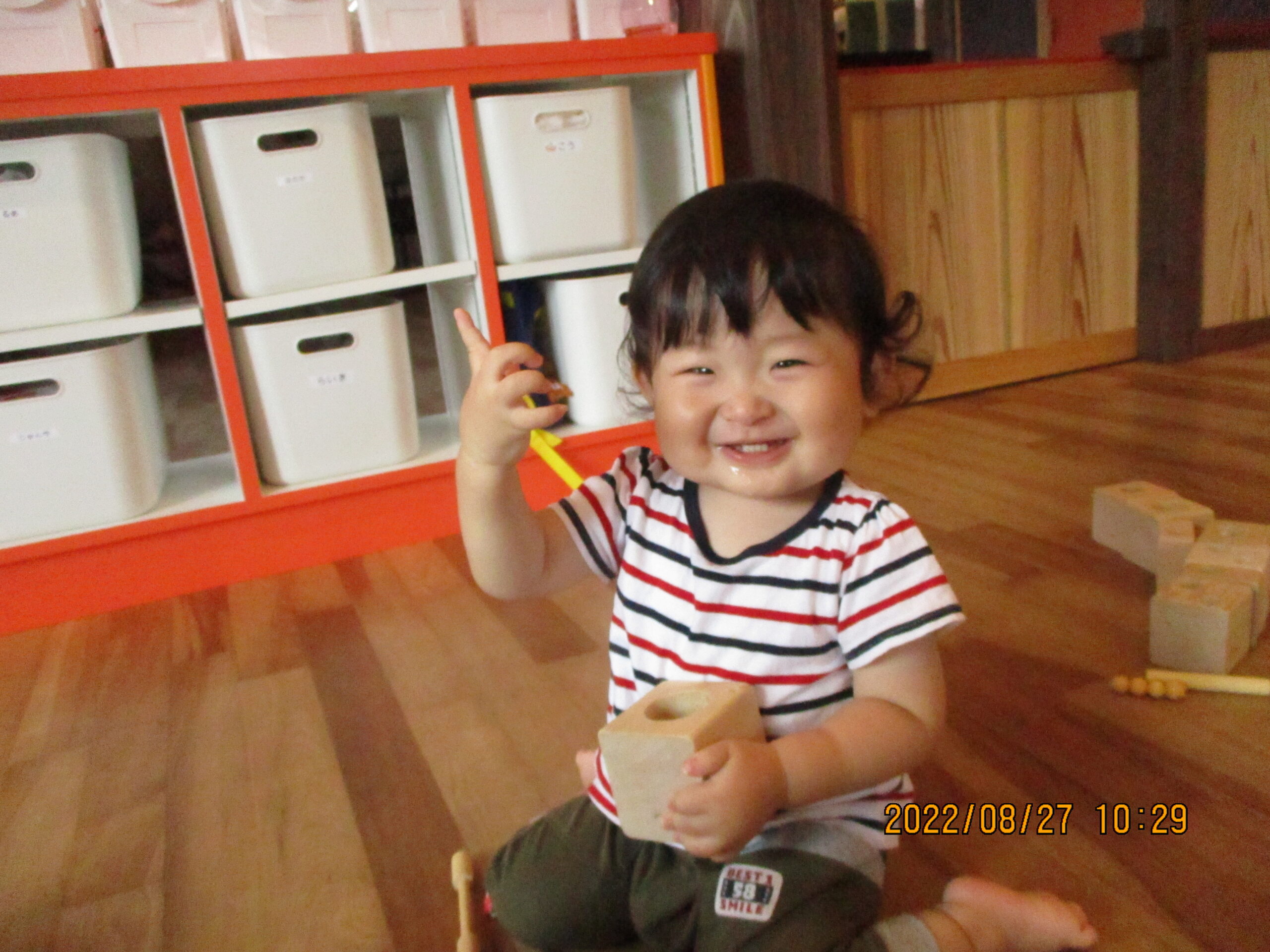 今日は1名の登園だったのでゆっくりと過ごしました。ひっつき虫遊びをしましたが「どれにしようかな」と悩みながら棒を持ち、くっつける事が出来るとニコッと笑っている姿が見られました。