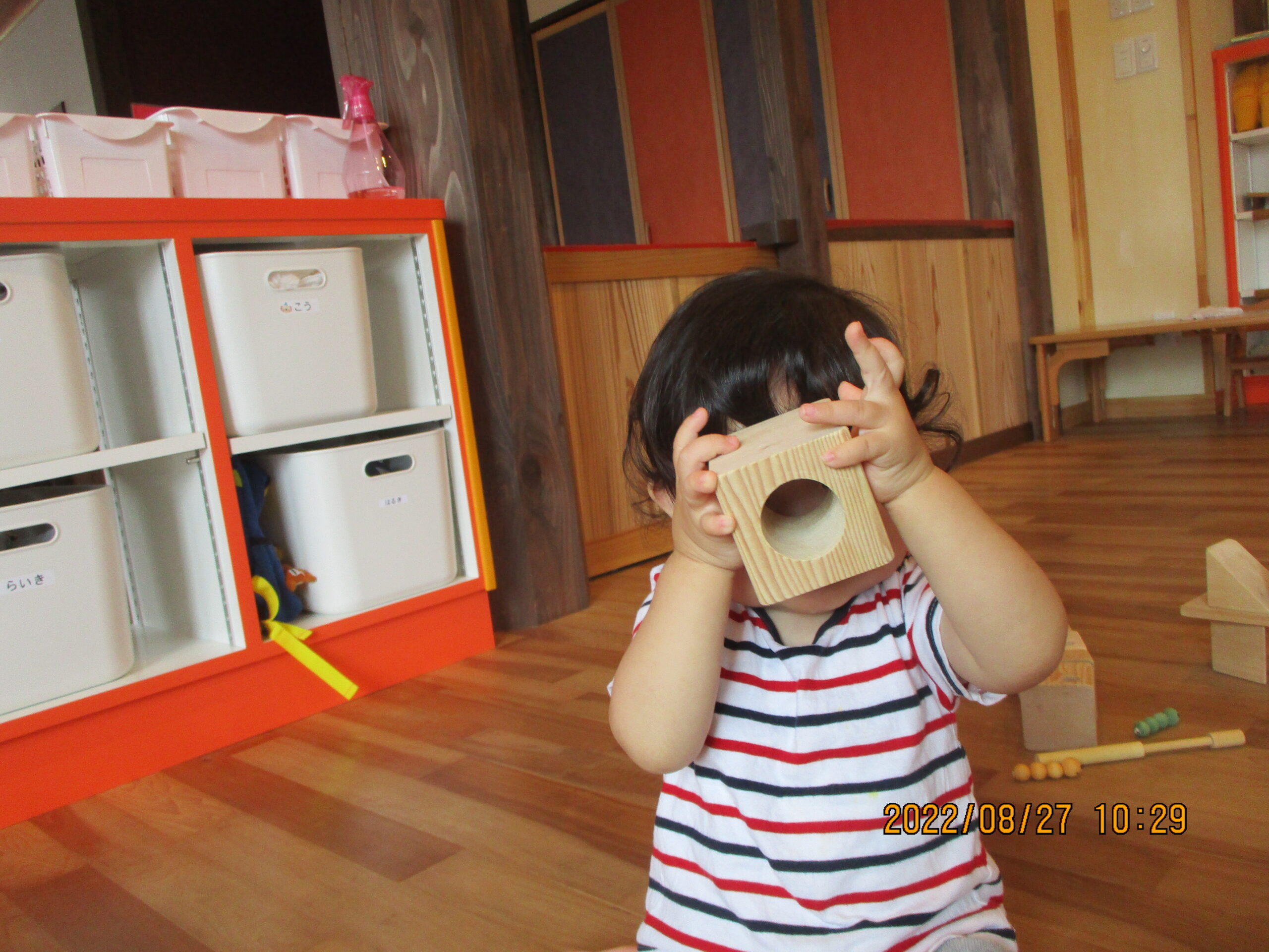 丸い穴の中を覗いたりカメラに見立てて「はい、チーズ」と写真を撮って遊んだりもしましたよ。