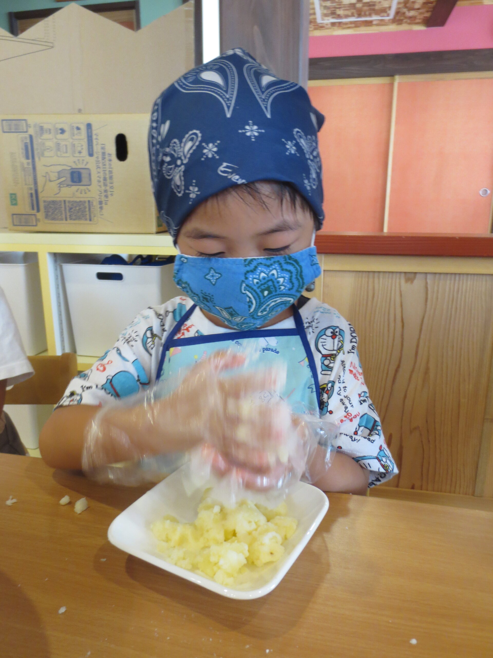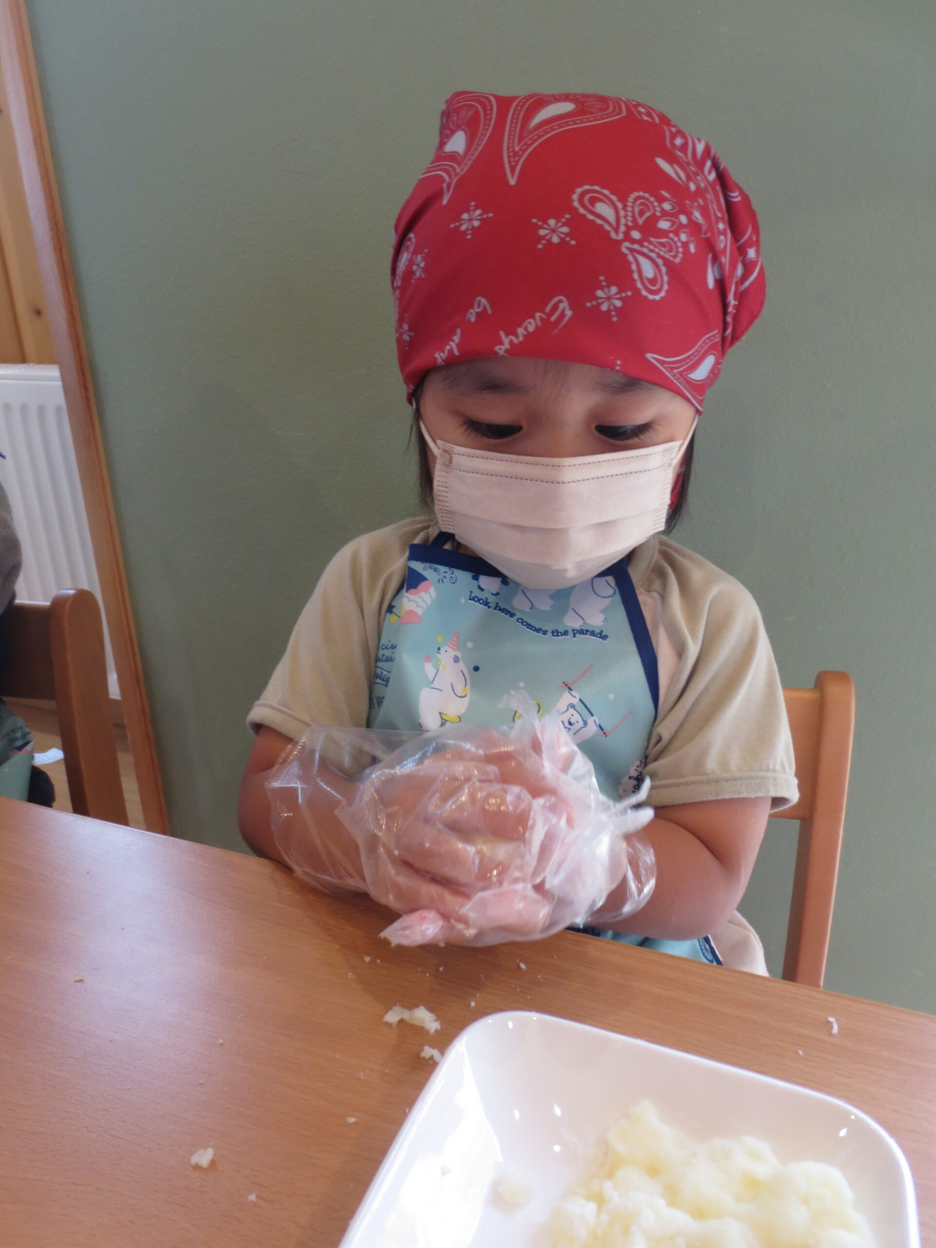 お部屋に入って、三角巾・エプロンを身につけている間に